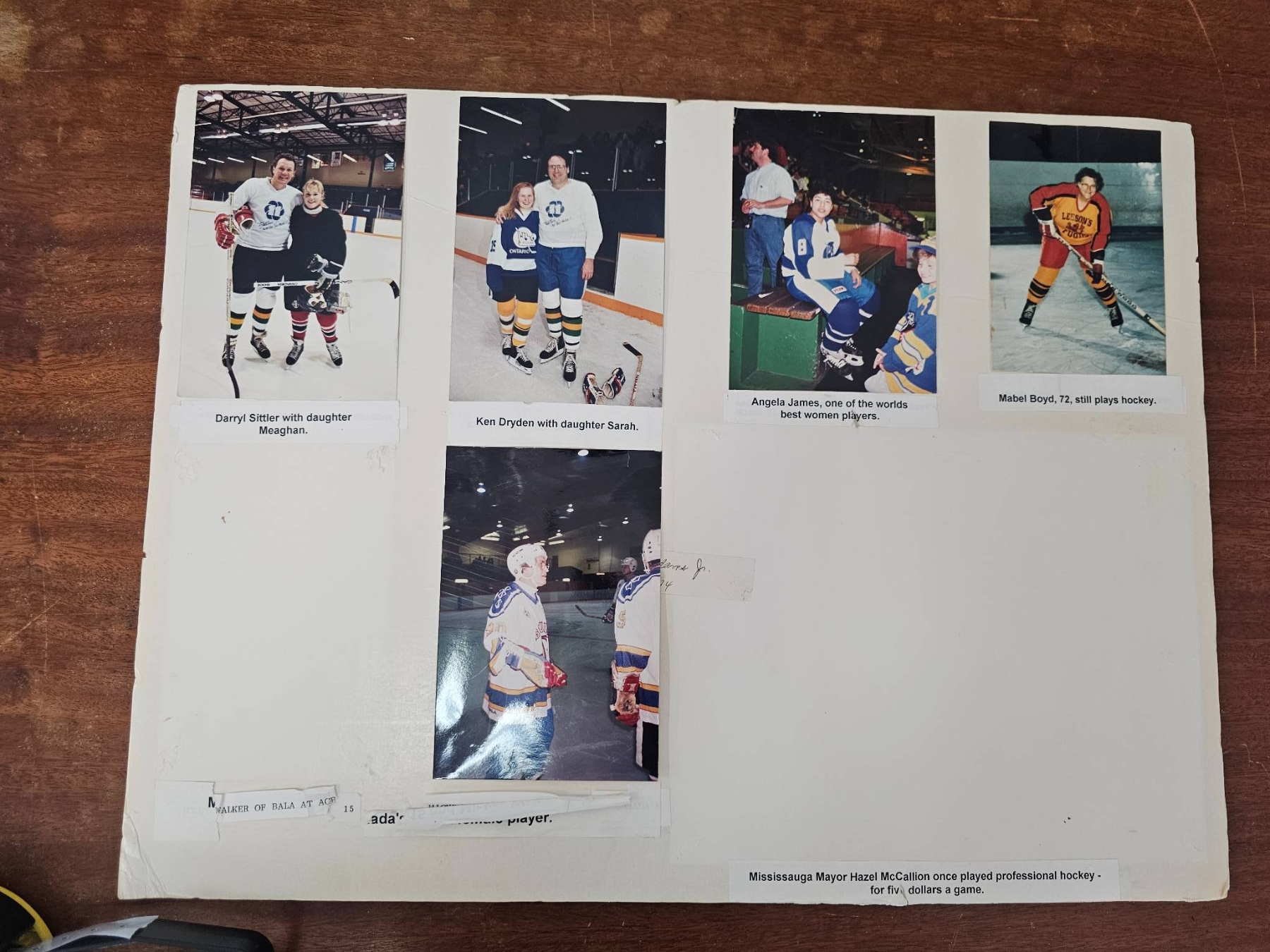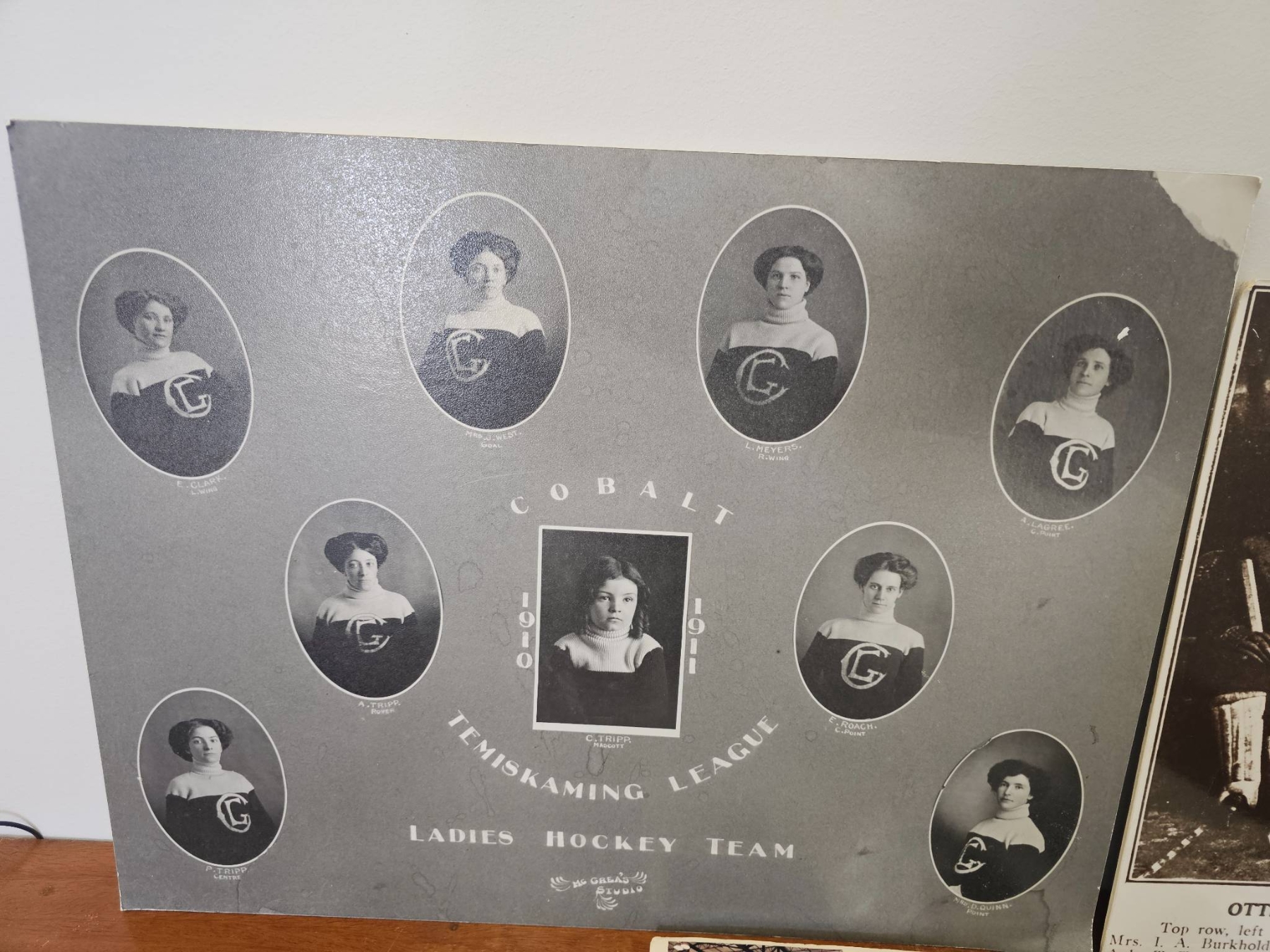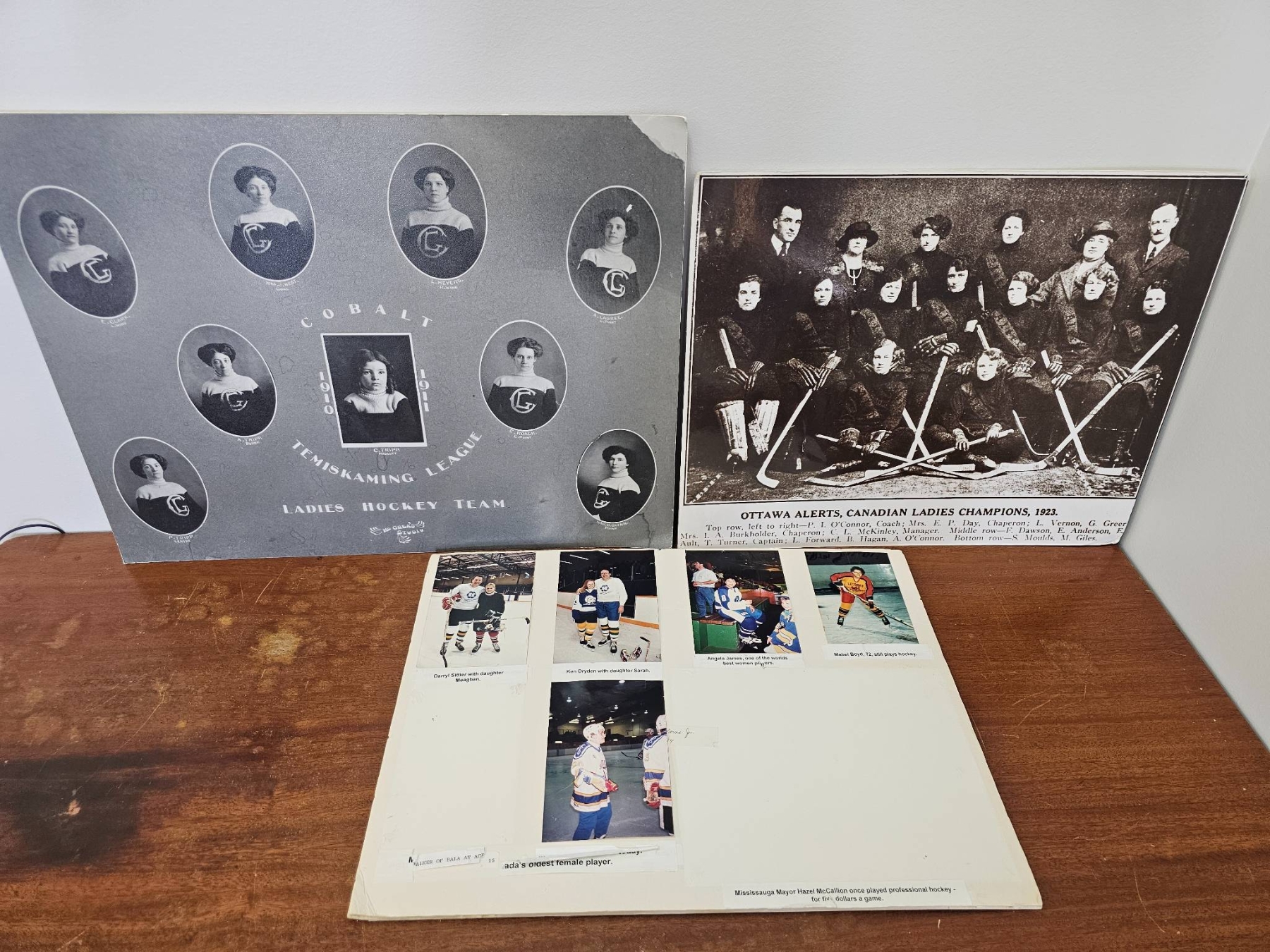 Ladies hockey team photographs and ephemera, including historic team portraits and modern photos. Items include a Cobalt-Timiskaming League Ladies Hockey Team photograph, an Ottawa Alerts Canadian Ladies Champions 1922 team portrait, and a collection of modern hockey imagery. Some wear and discoloration present due to age and handling.