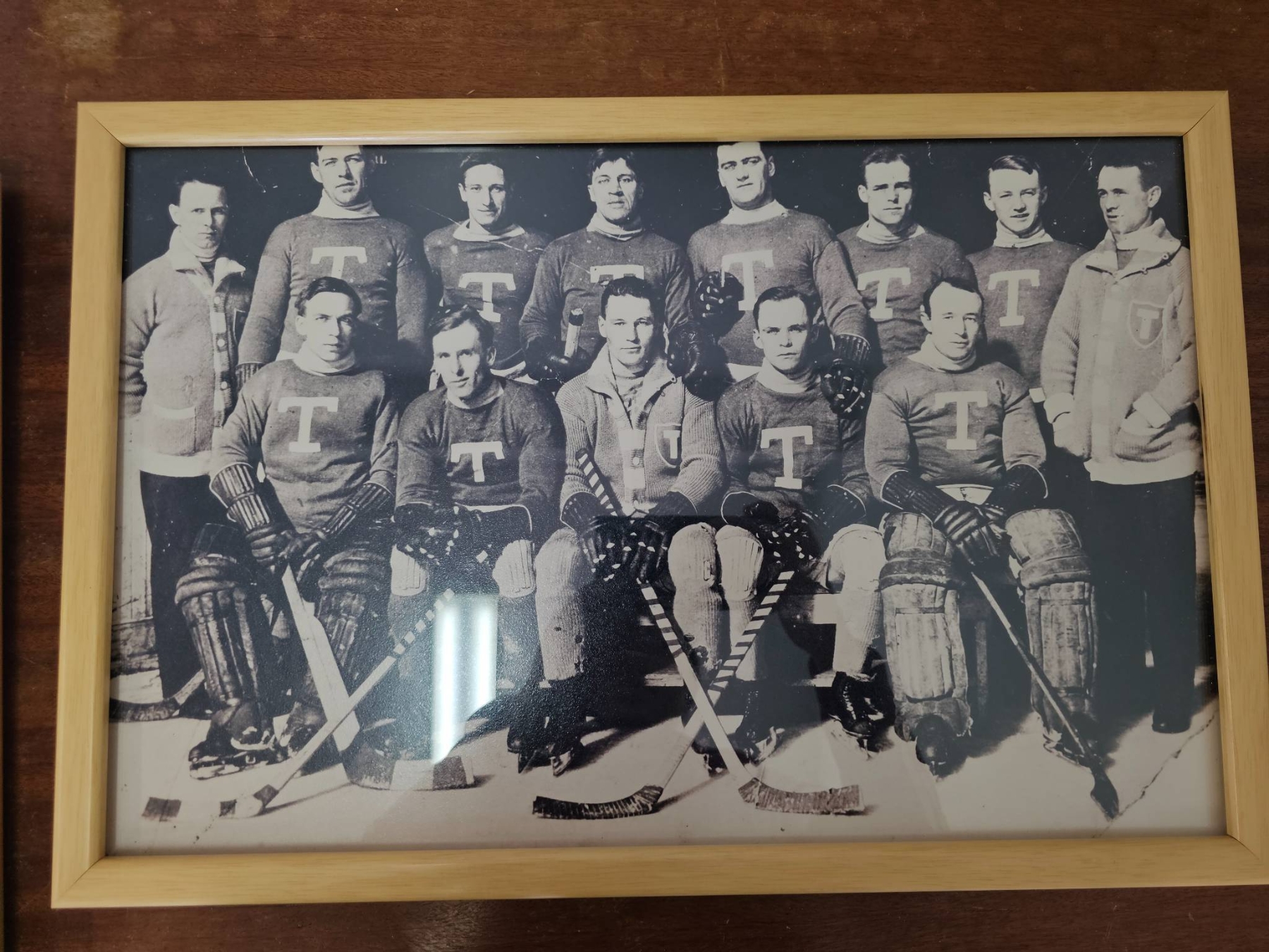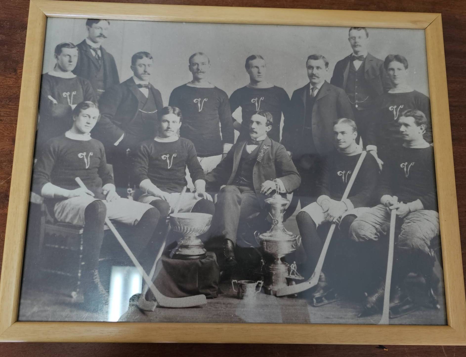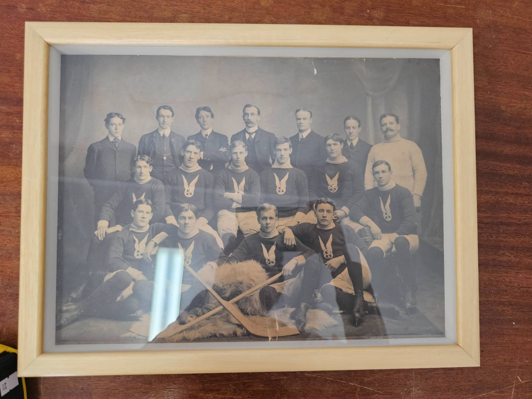 Framed and unframed vintage hockey team photographs. Includes multiple prints depicting teams posed with equipment and trophies. Frames appear to be wooden and photographs are black and white. Some items show wear consistent with age. This lot may hold historical significance for sports or hockey enthusiasts.