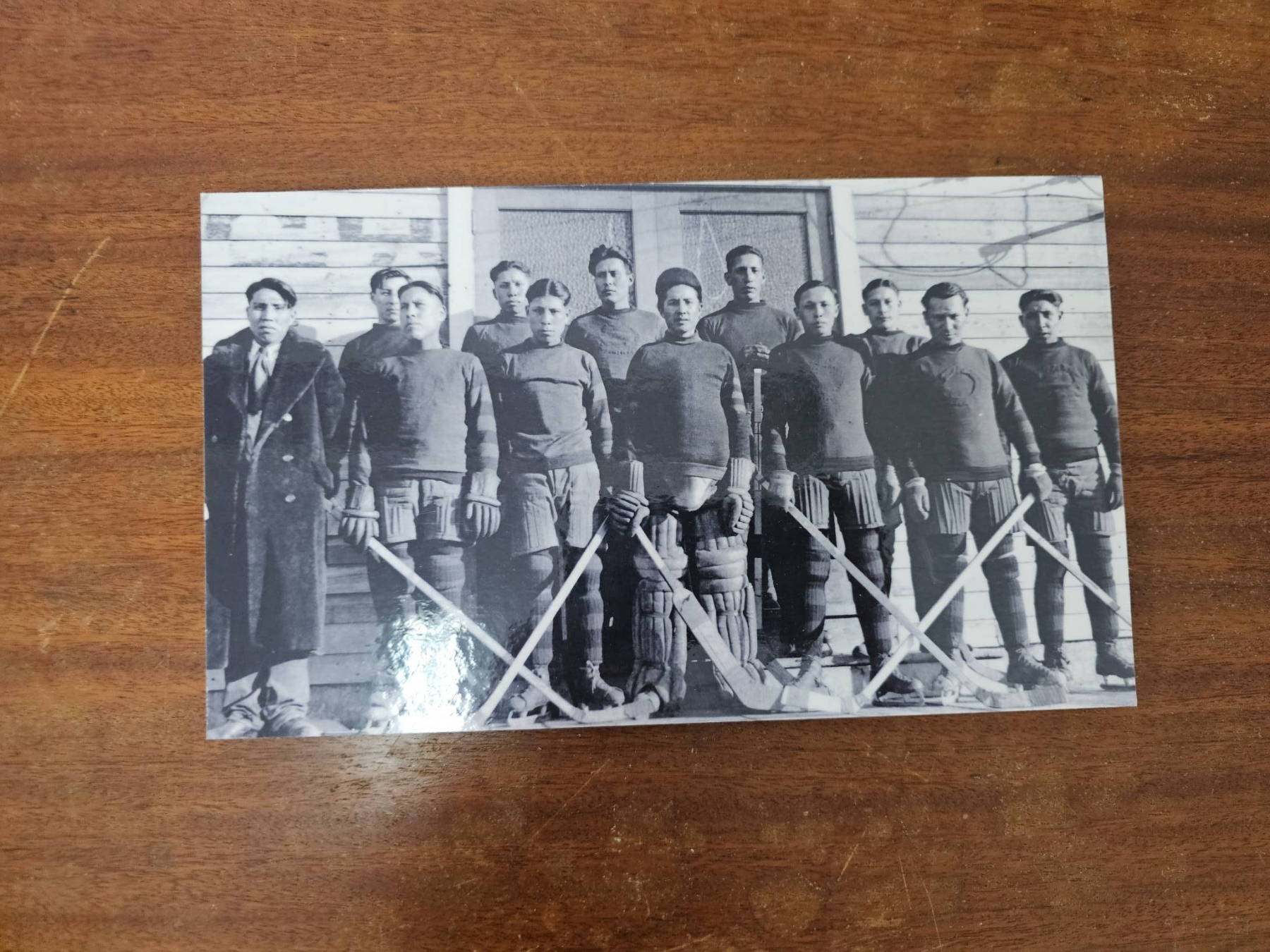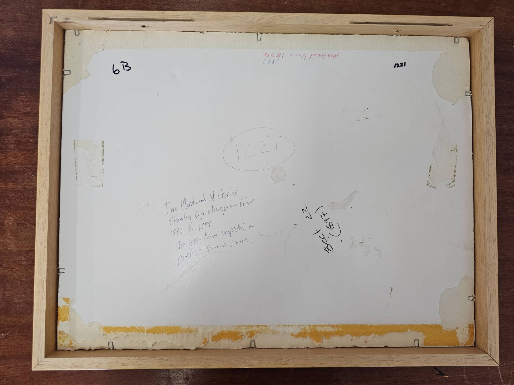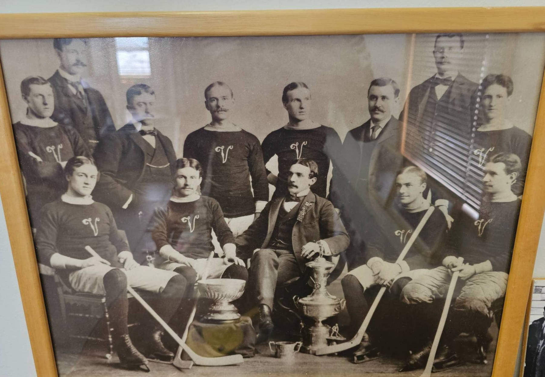 Framed and unframed vintage hockey team photographs. Includes multiple prints depicting teams posed with equipment and trophies. Frames appear to be wooden and photographs are black and white. Some items show wear consistent with age. This lot may hold historical significance for sports or hockey enthusiasts.