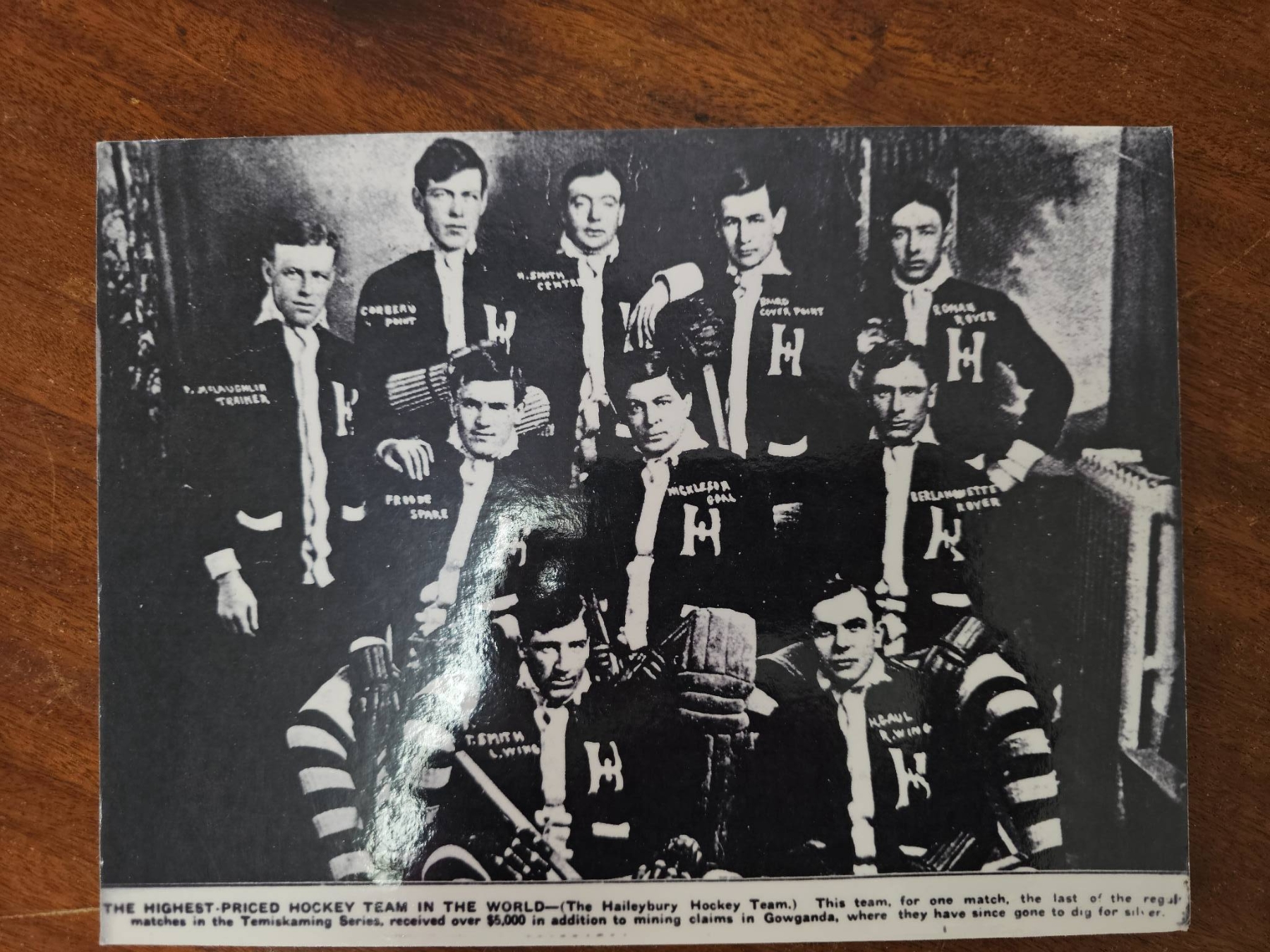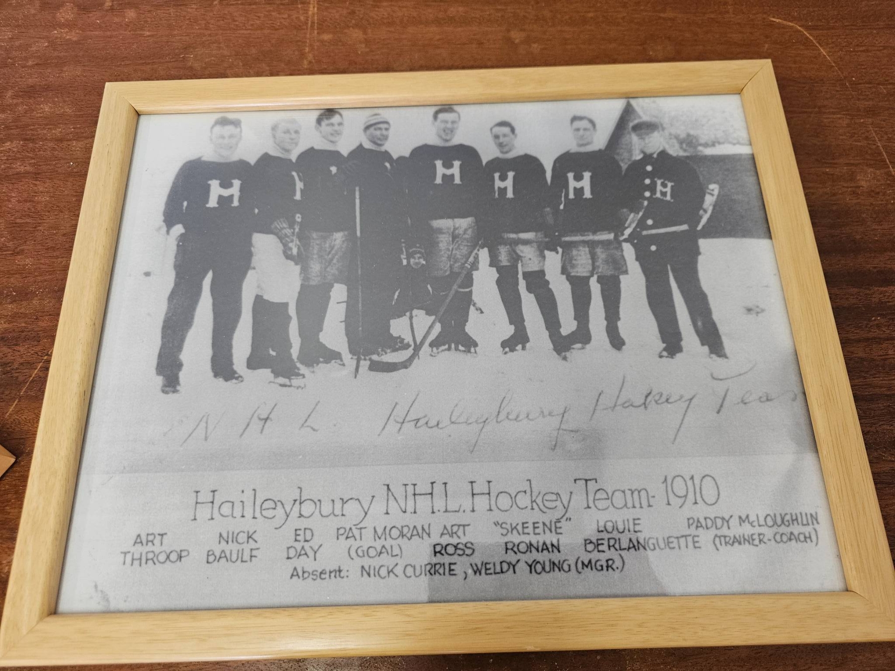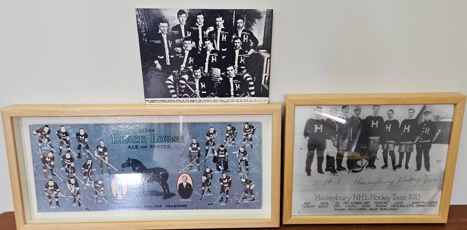 Collection includes two framed displays: one with images of the "Black Horse" hockey team and another showing the Haliburton NHA Hockey Team from 1910 with names listed. An additional black-and-white photo of a historical hockey team is included. Frames are wooden, and contents depict vintage hockey history. Exact dimensions are not listed.