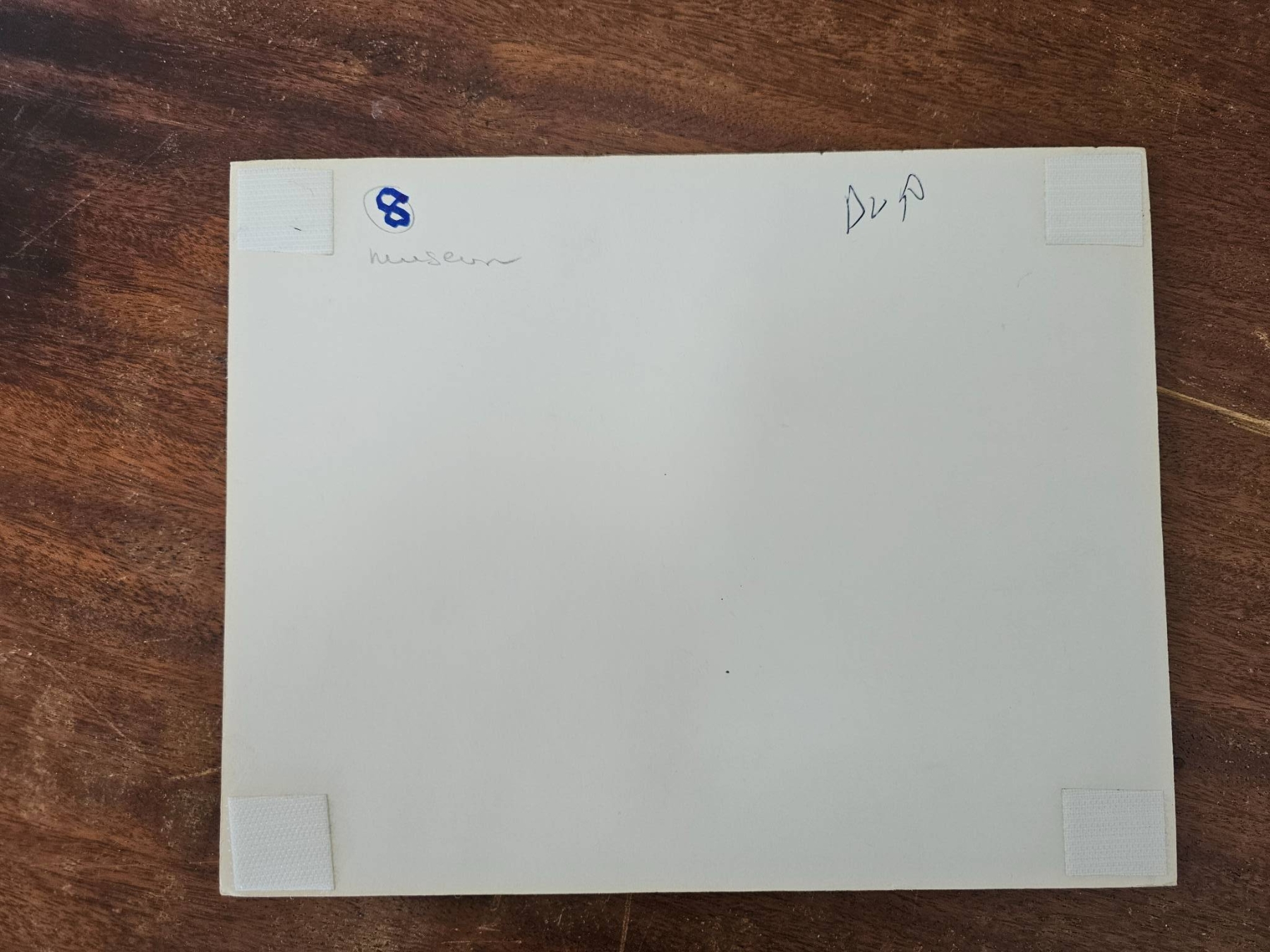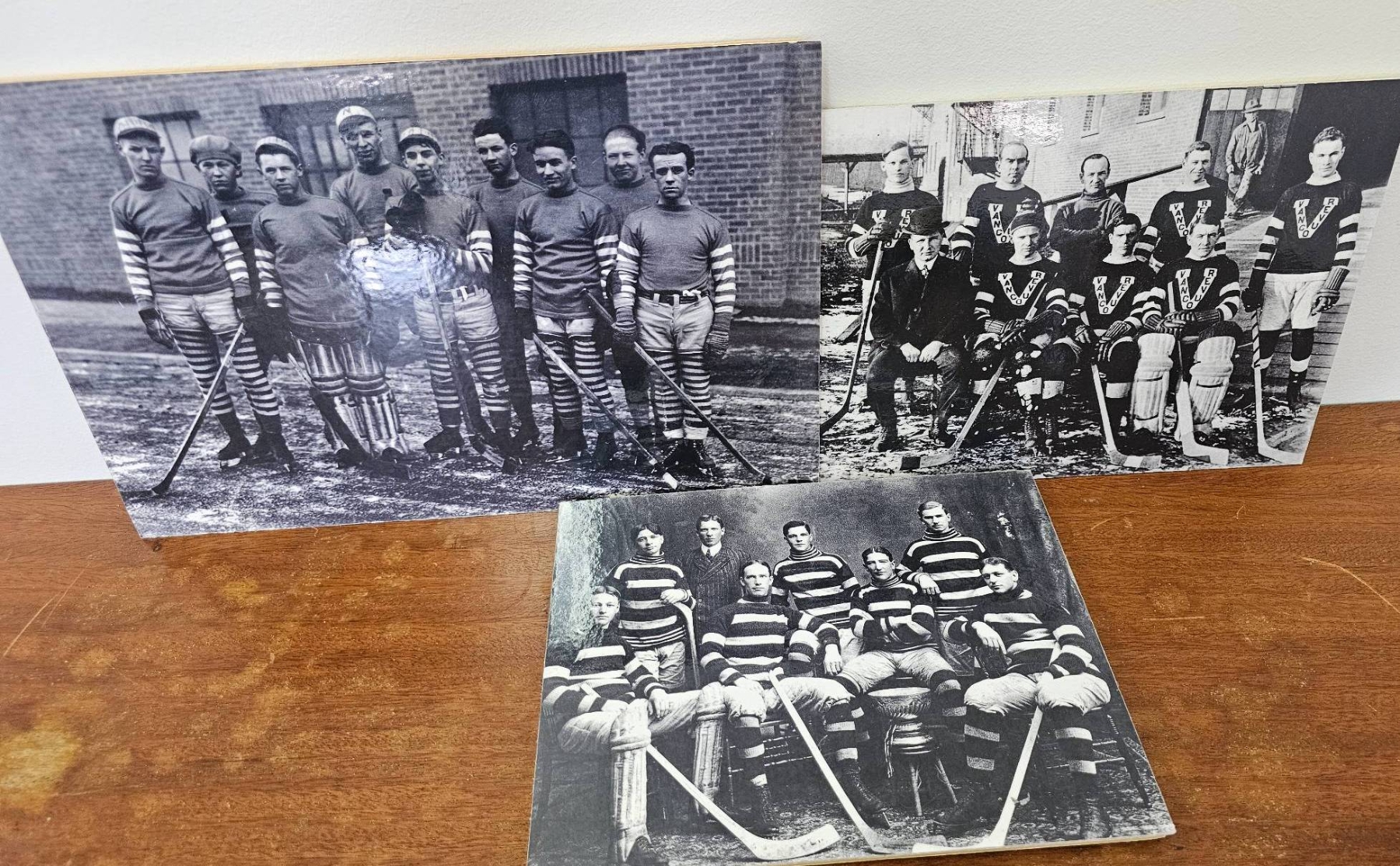 Three black-and-white photos featuring hockey teams. The pictures capture athletes dressed in striped uniforms and holding hockey sticks. Mounted on sturdy backing for preservation, the reverse sides show notation markings but no further details about origins. Condition consistent with preserved vintage items, with visible wear on mounting material.