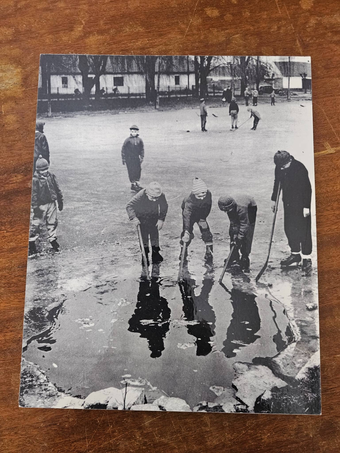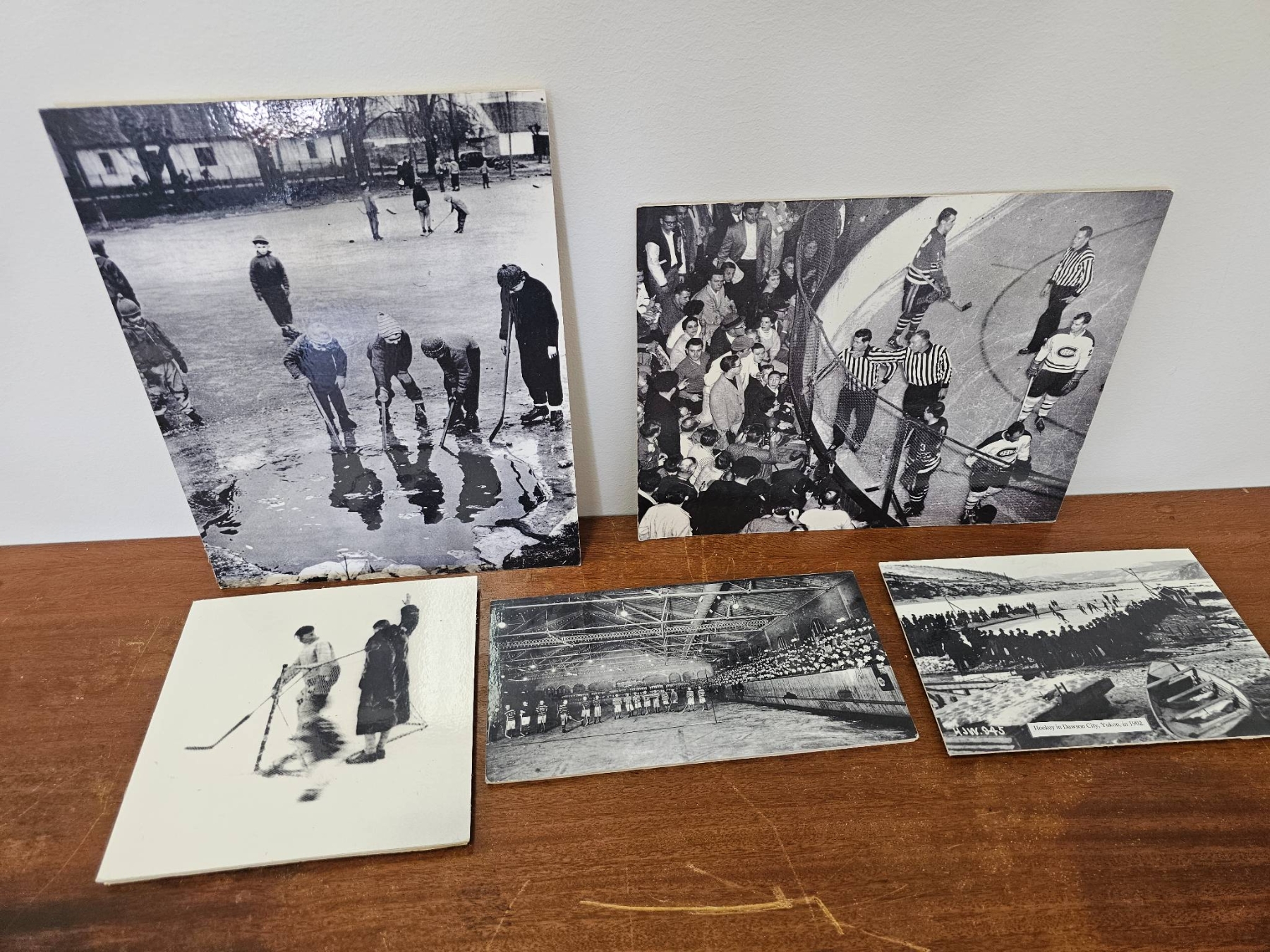 Five black-and-white photographic prints featuring hockey-related imagery. Includes outdoor and indoor scenes of games, players, and spectators. Prints vary in size and orientation, capturing moments such as games in progress, players on ice, and crowd views. Condition appears to include minor wear, consistent with age and prior handling.