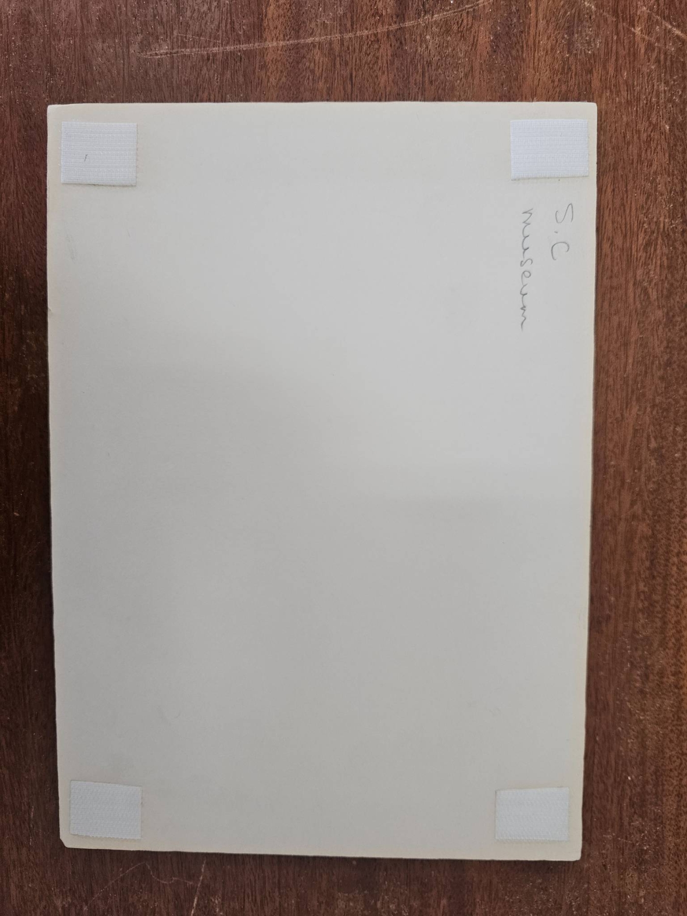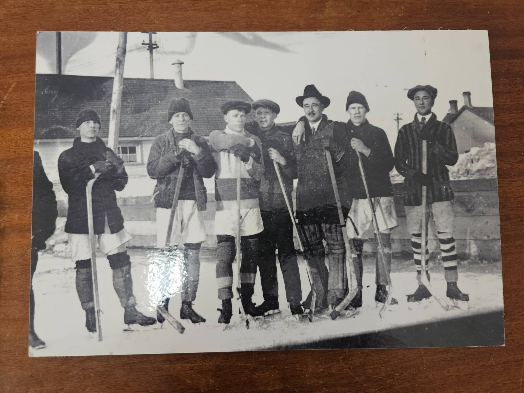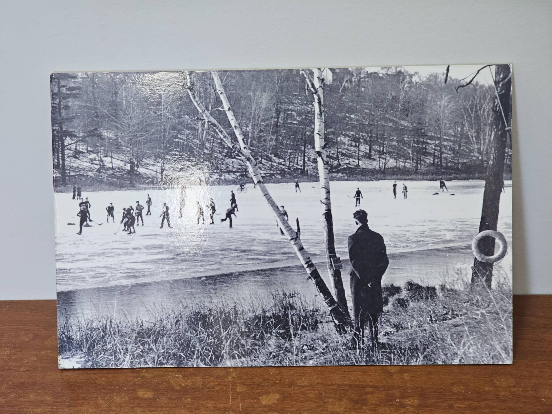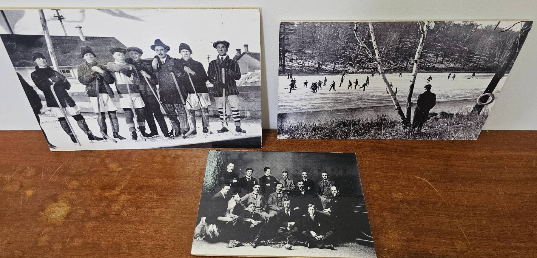Three black-and-white photographs depicting early 20th-century scenes, including a group of men in athletic attire, a team formal group photo, and a winter landscape with skating individuals. Mounted with preservation corners on backing materials. Writing on the back of two mounts includes "SC" and "1944" as well as pencil annotations referring to printing. Condition and specific historical context are unknown.