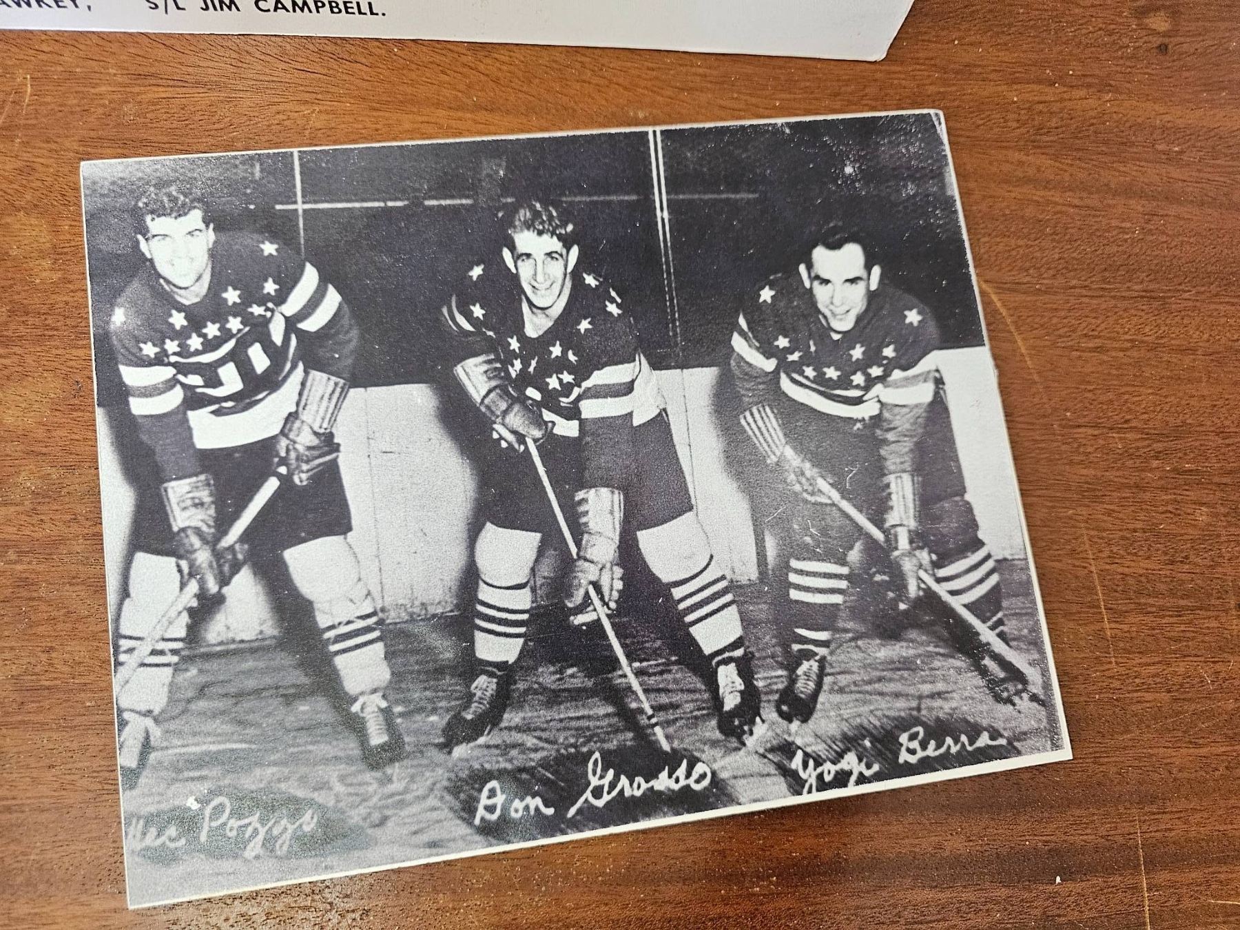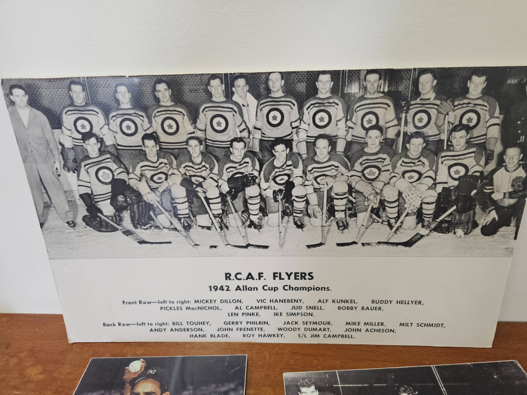 Three sports-related photographs, including a team photograph of the RCAF Flyers 1942 Allan Cup Champions, a color photograph of a New York Yankees player in uniform, and a black-and-white photograph of three hockey players on ice. The images appear to depict iconic sports figures and moments from baseball and hockey history.