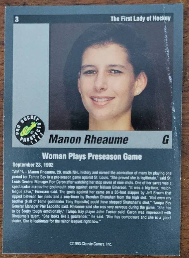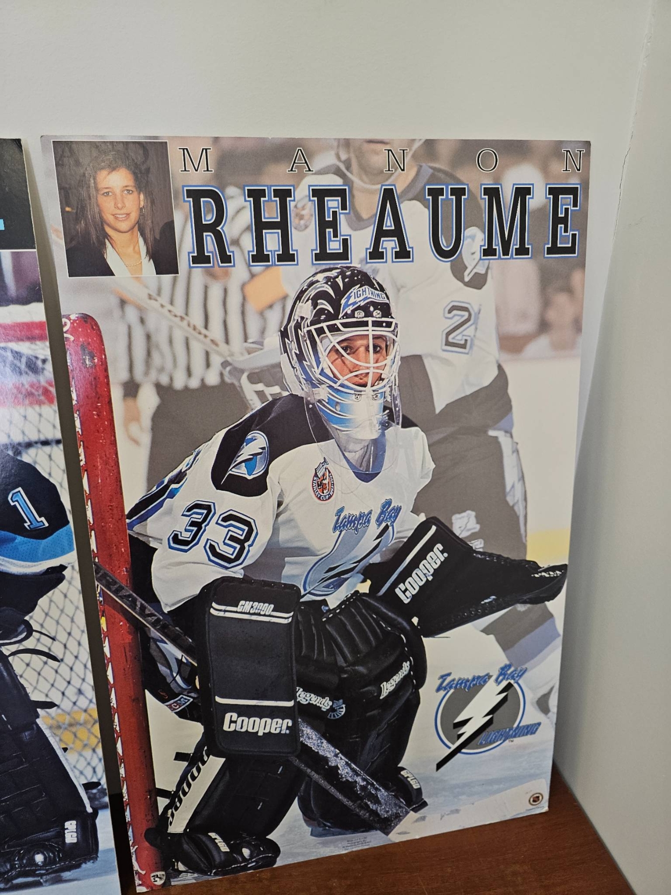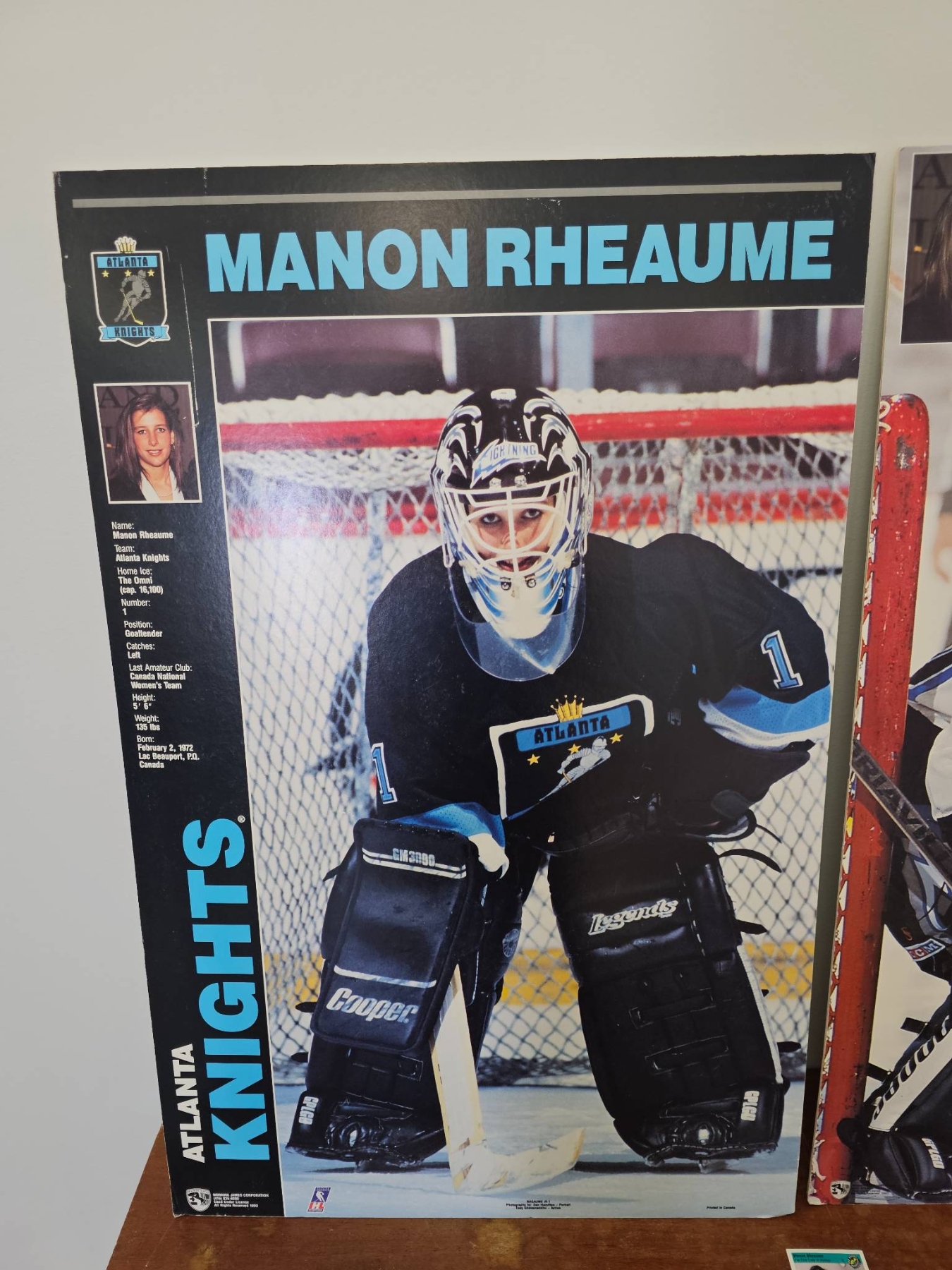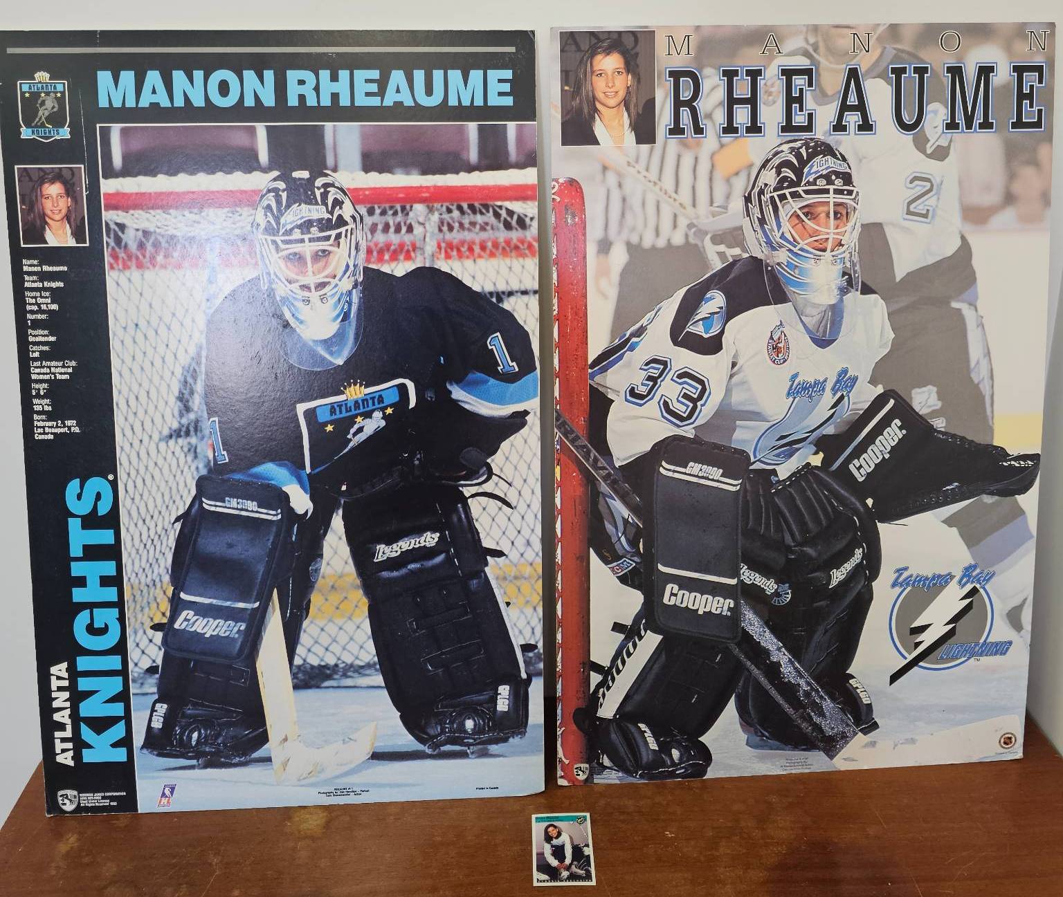Two Manon Rheaume posters, one featuring her with the Atlanta Knights and another with the Tampa Bay Lightning, showcasing her as a pioneering female goaltender in professional hockey. Both posters are printed in vivid colors with detailed team and player information. Also included is a collector's trading card highlighting her career milestones. Items are in good condition with light wear.