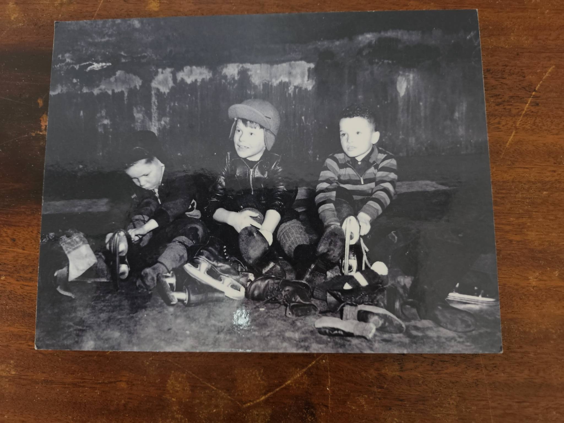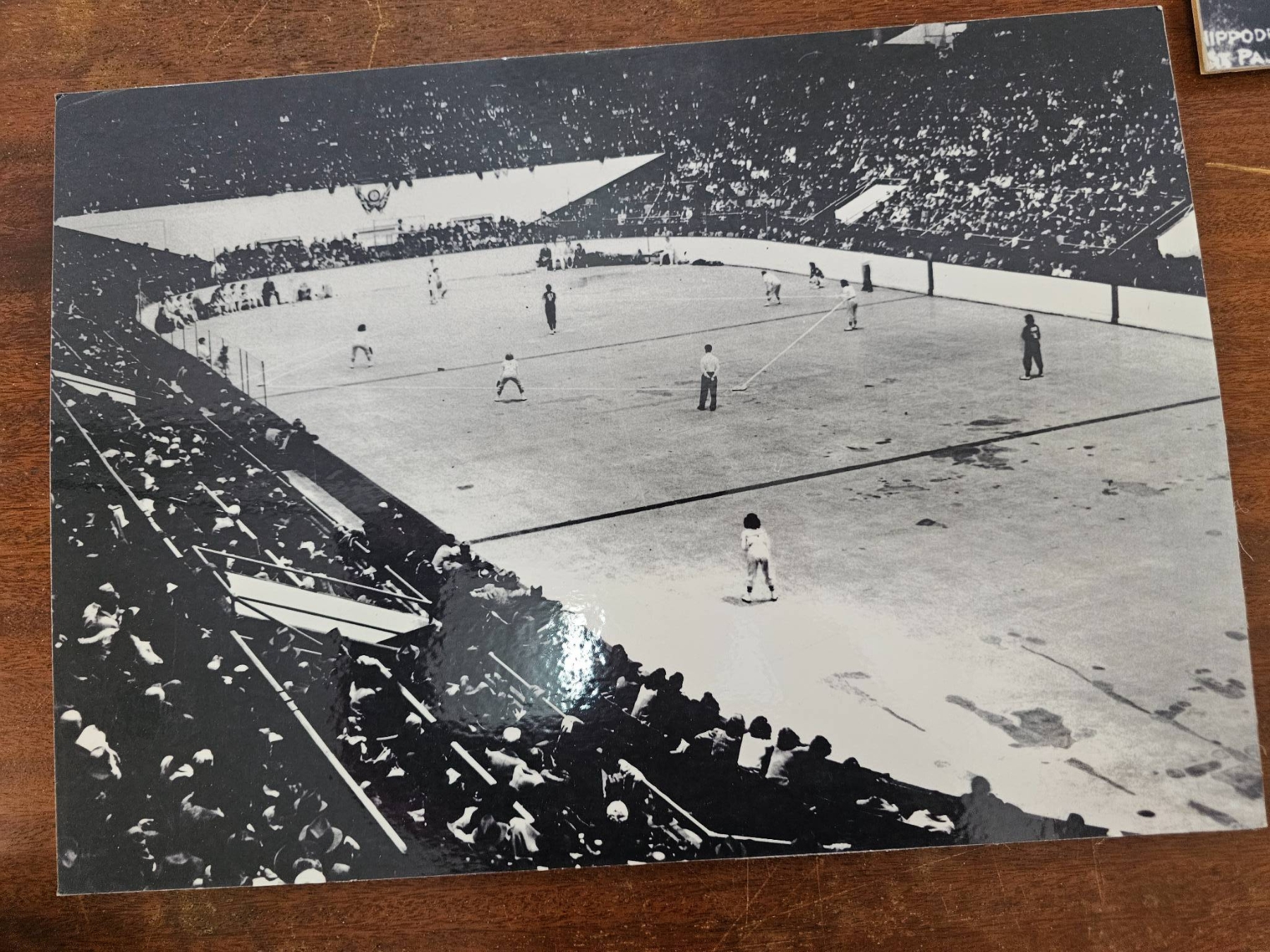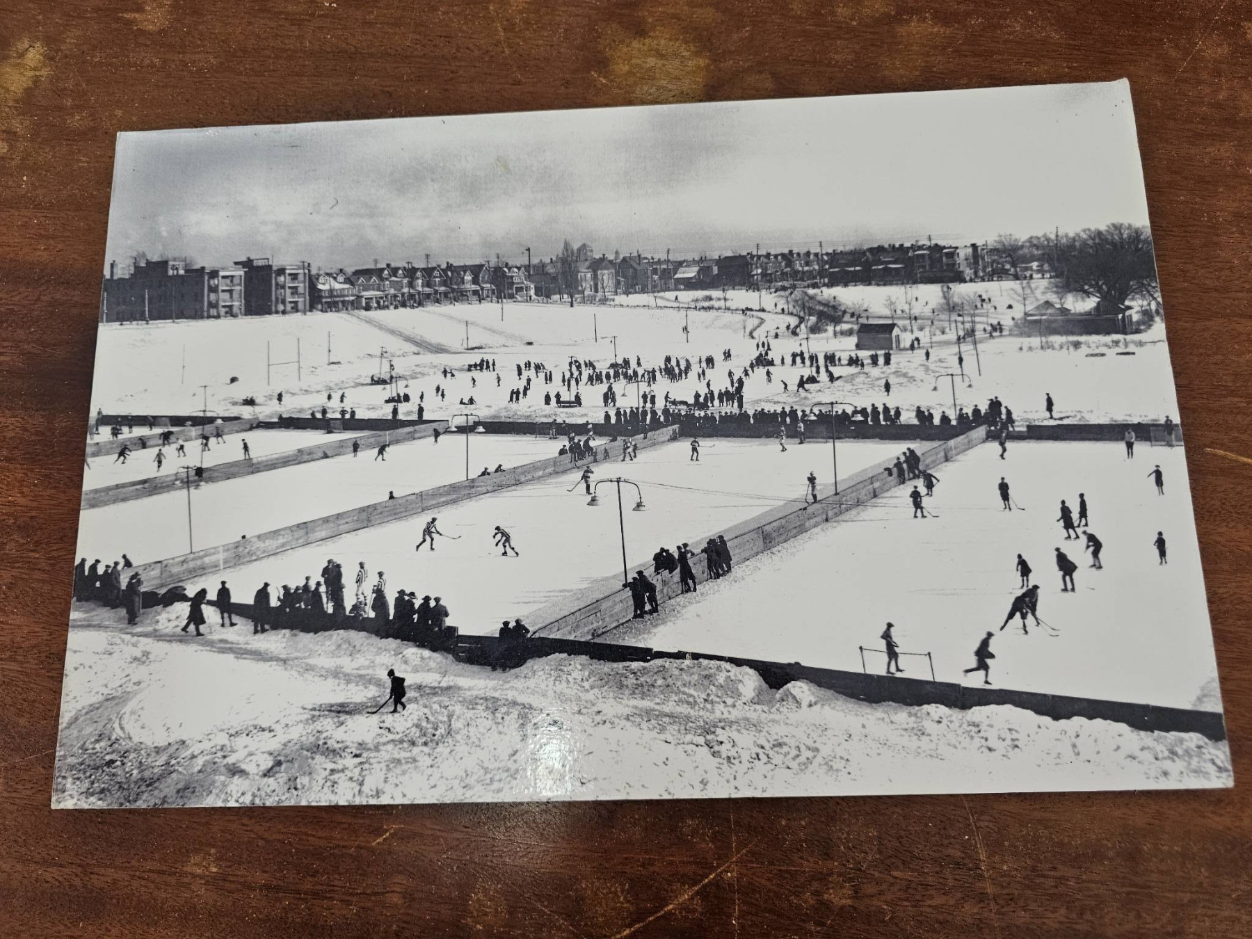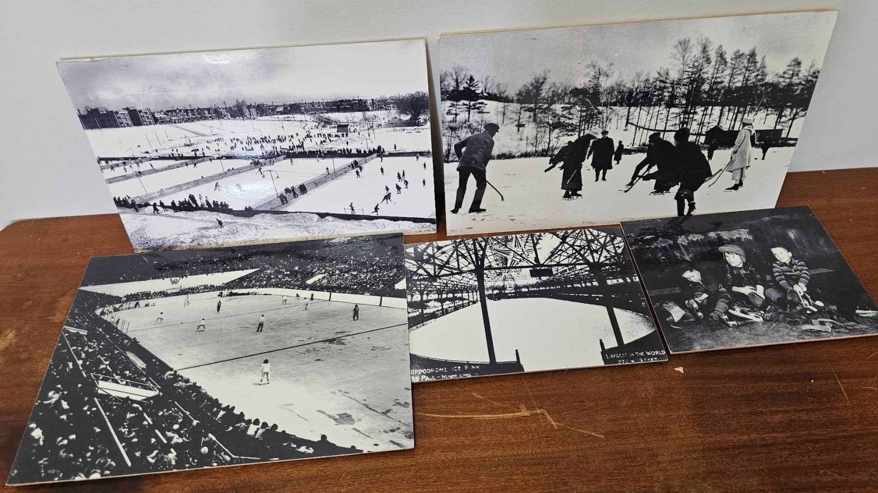 Six black-and-white photographs depicting various historical outdoor scenes, including hockey games, a stadium event, and children with sleds. One image features handwritten text reading 'Opening of the Grenadier, Rosedale Park, Toronto.' Mounted on cardstock backing. Condition is consistent with age, showing some light wear and discoloration. Suitable for historical collectors or enthusiasts.