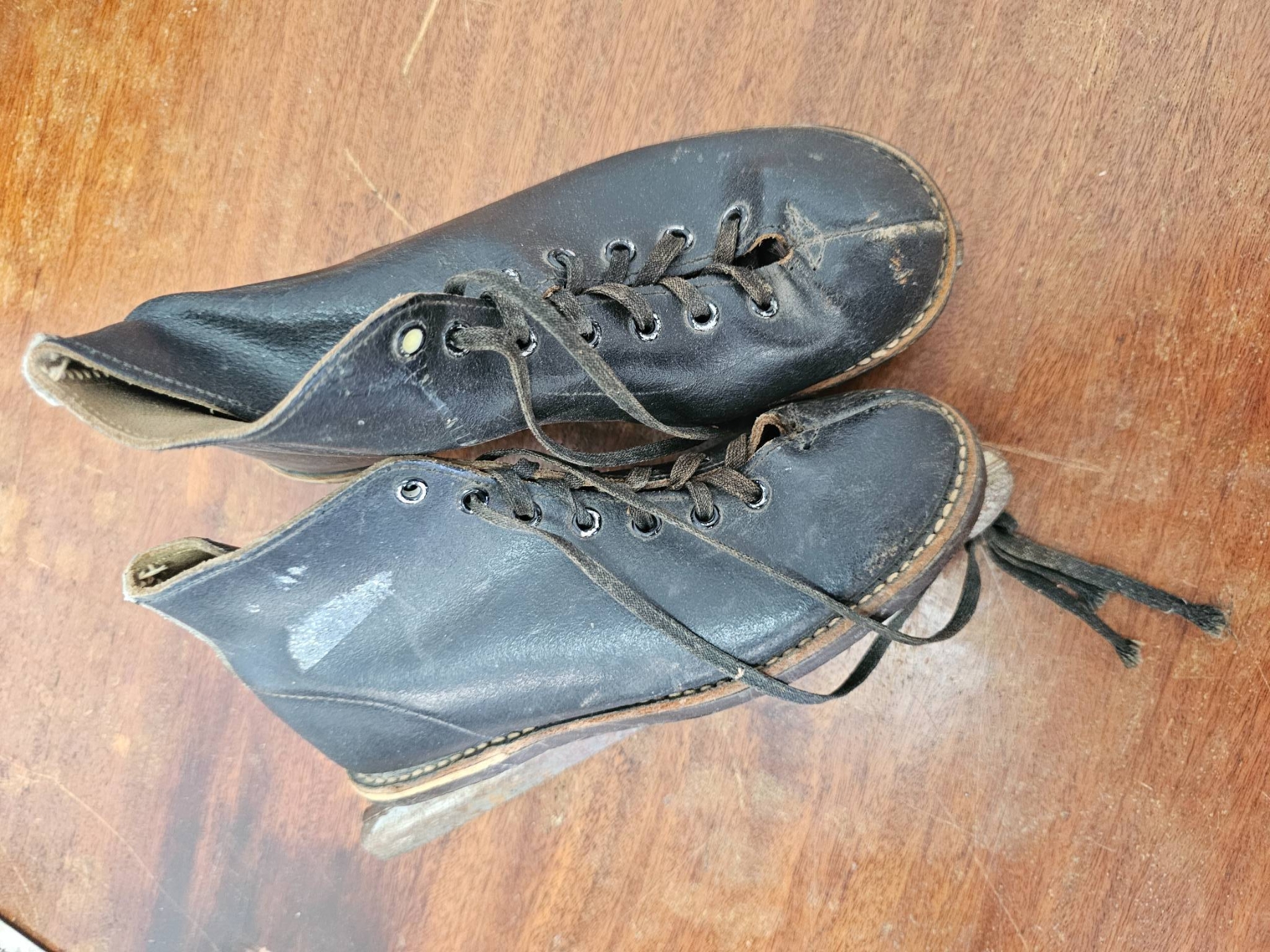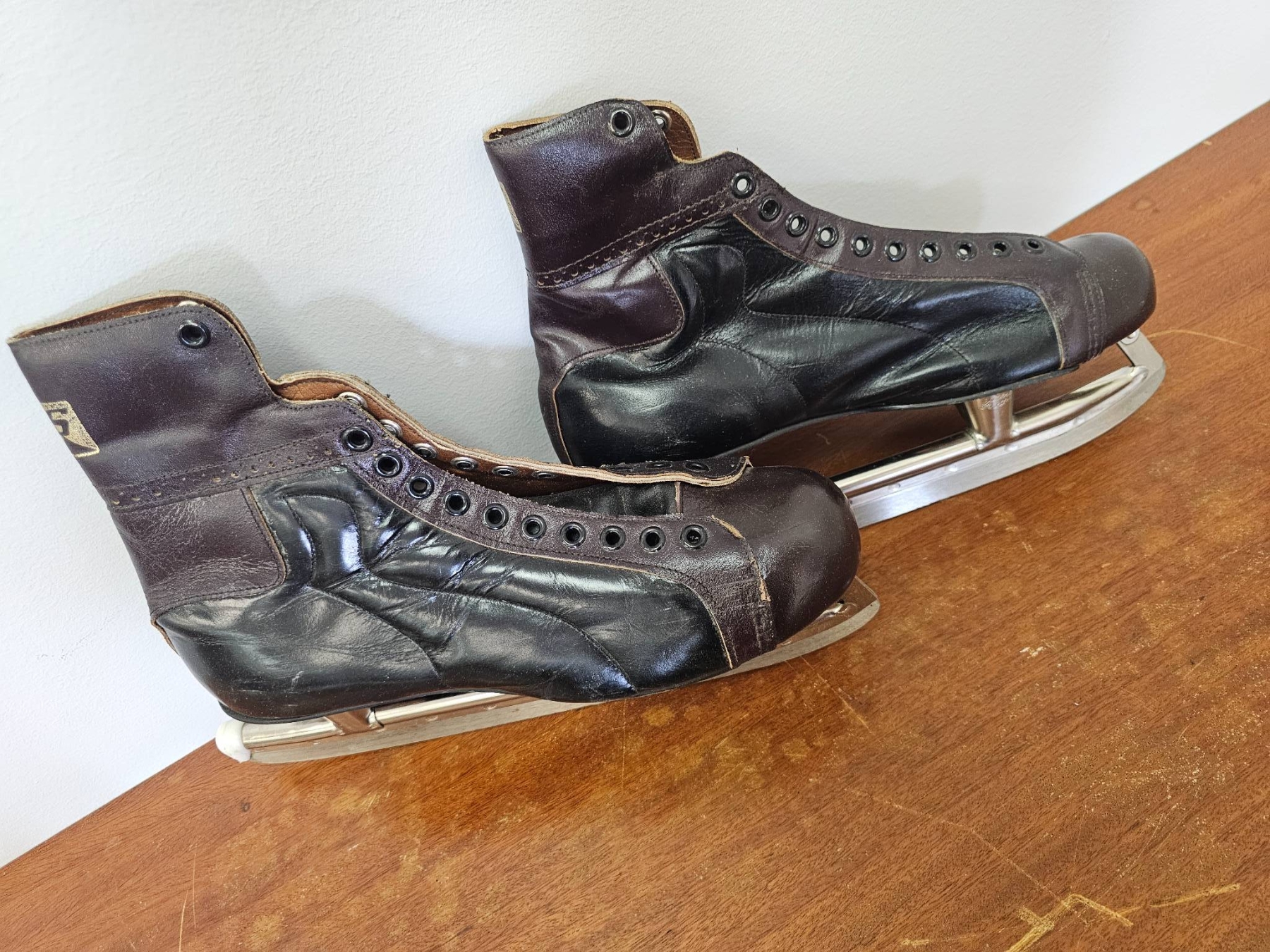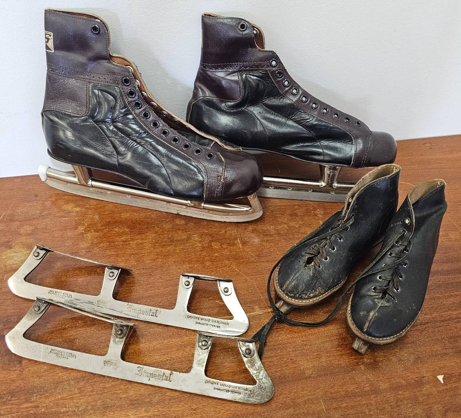 Vintage ice skate items, including a pair of leather lace-up ice skates and a separate pair of unattached steel skate blades. The skates show visible wear consistent with age and use. The steel blades also exhibit surface wear and patina. Suitable for display or restoration. No manufacturer or size markings are visible.