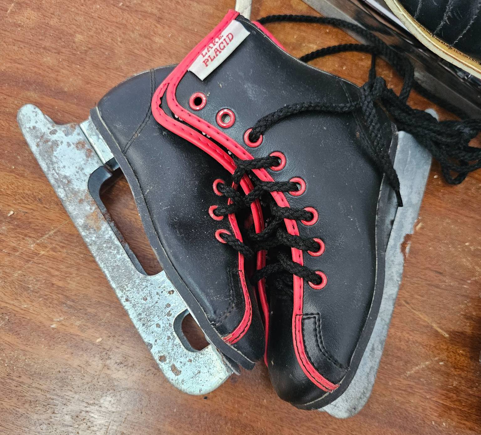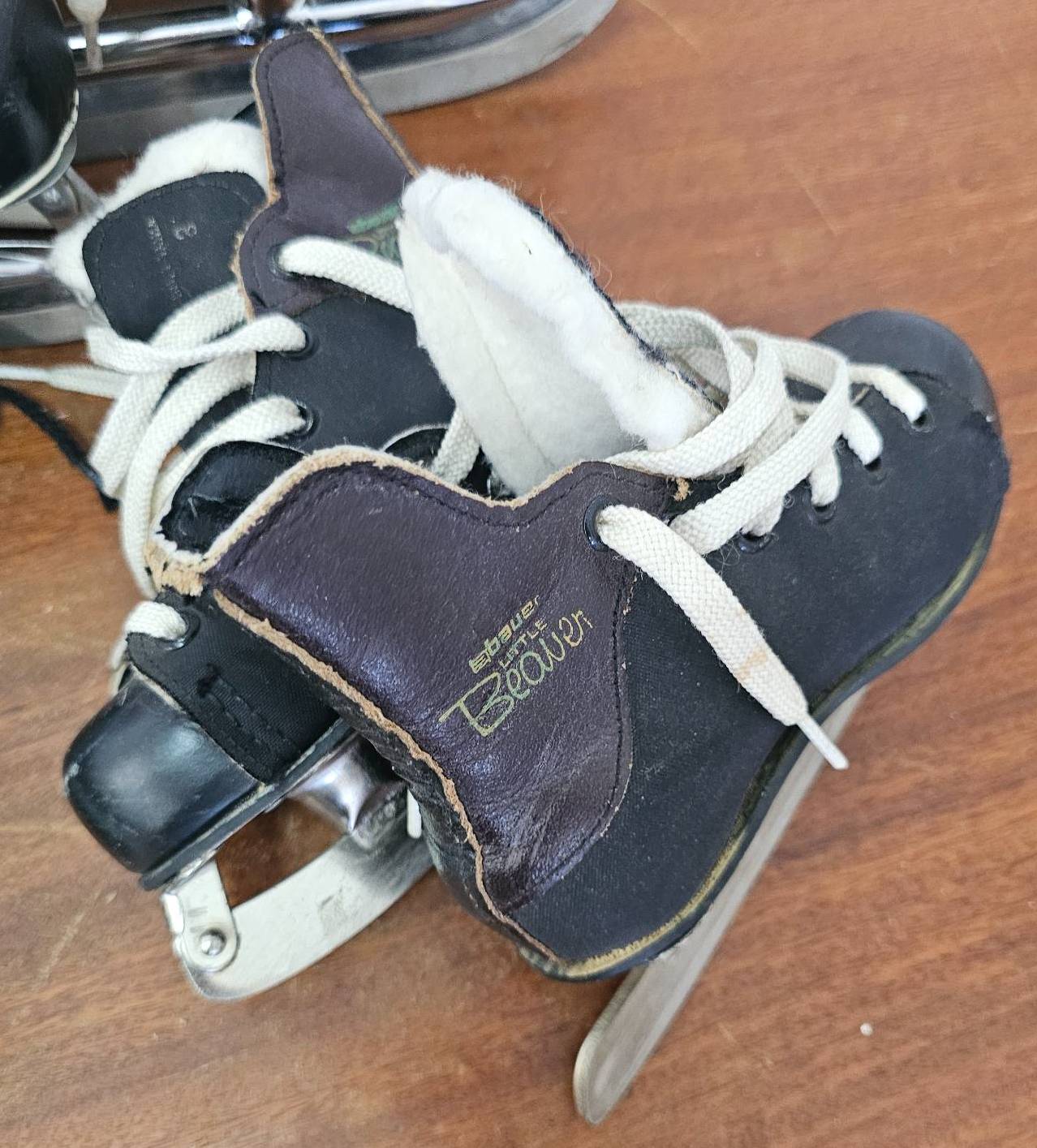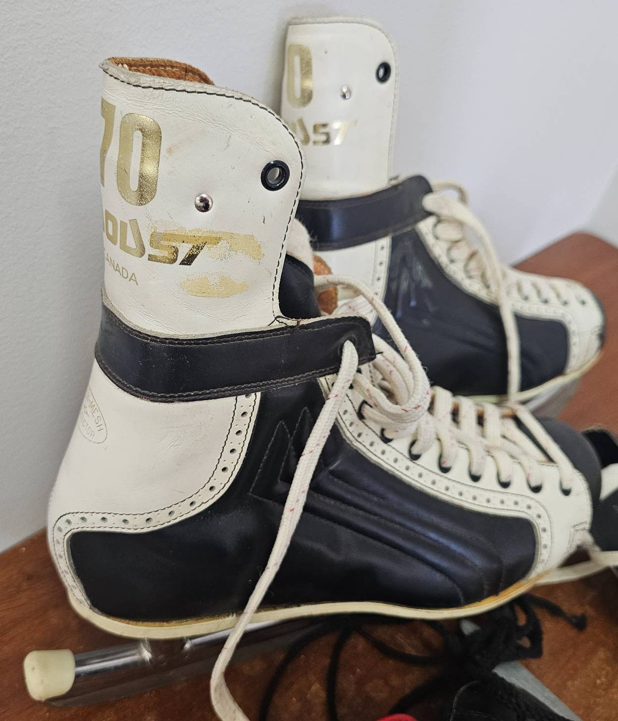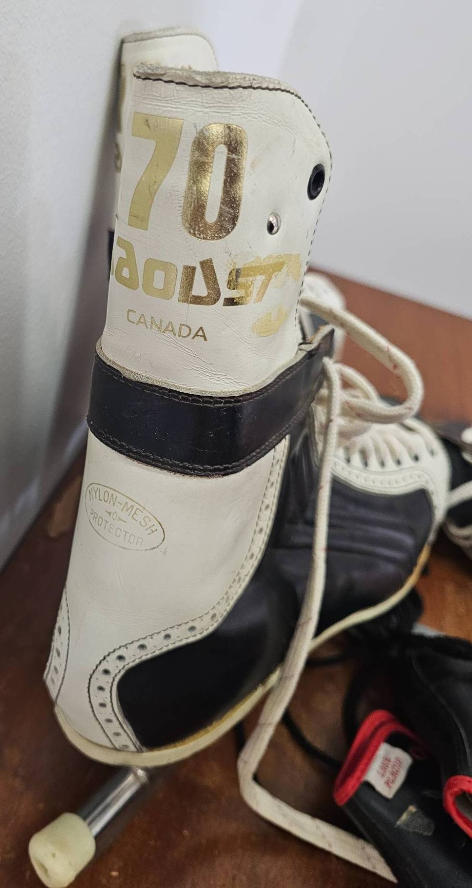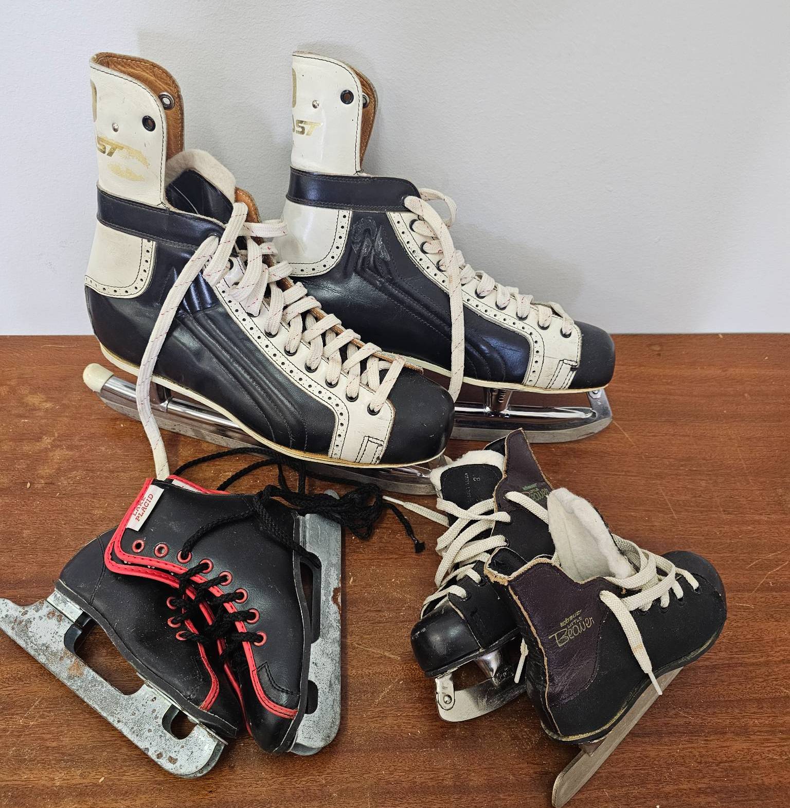 Three pairs of ice skates: one pair of CCM Super Tacks marked '70 Made in Canada' with leather and synthetic materials, one pair of Botas children's skates in black with red trim, and an additional pair of vintage-style skates marked 'Jesse' with a purple-toned leather upper. All skates feature lace-up closures and blade runners with visible signs of prior use. Suitable for display or skating use.