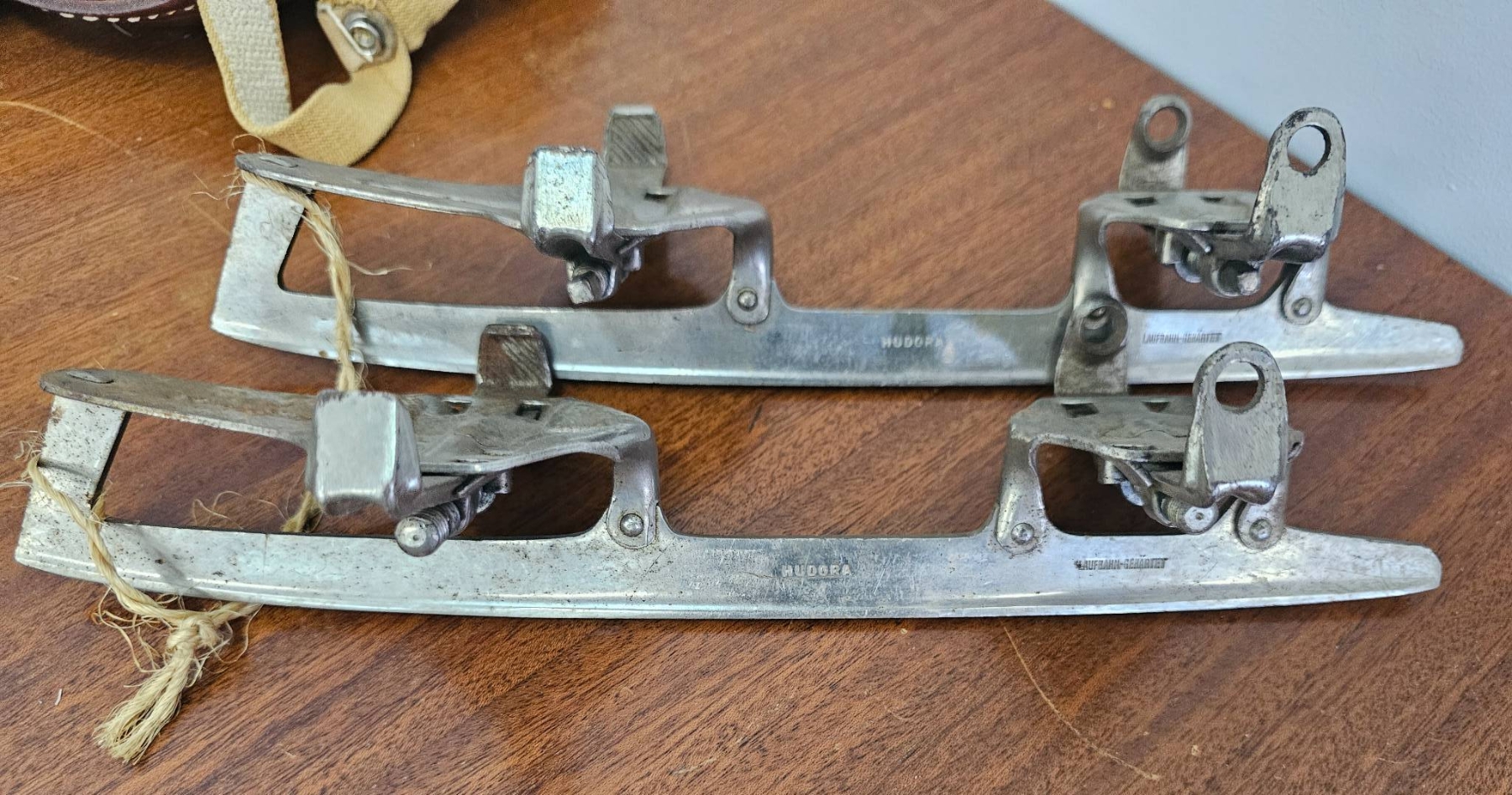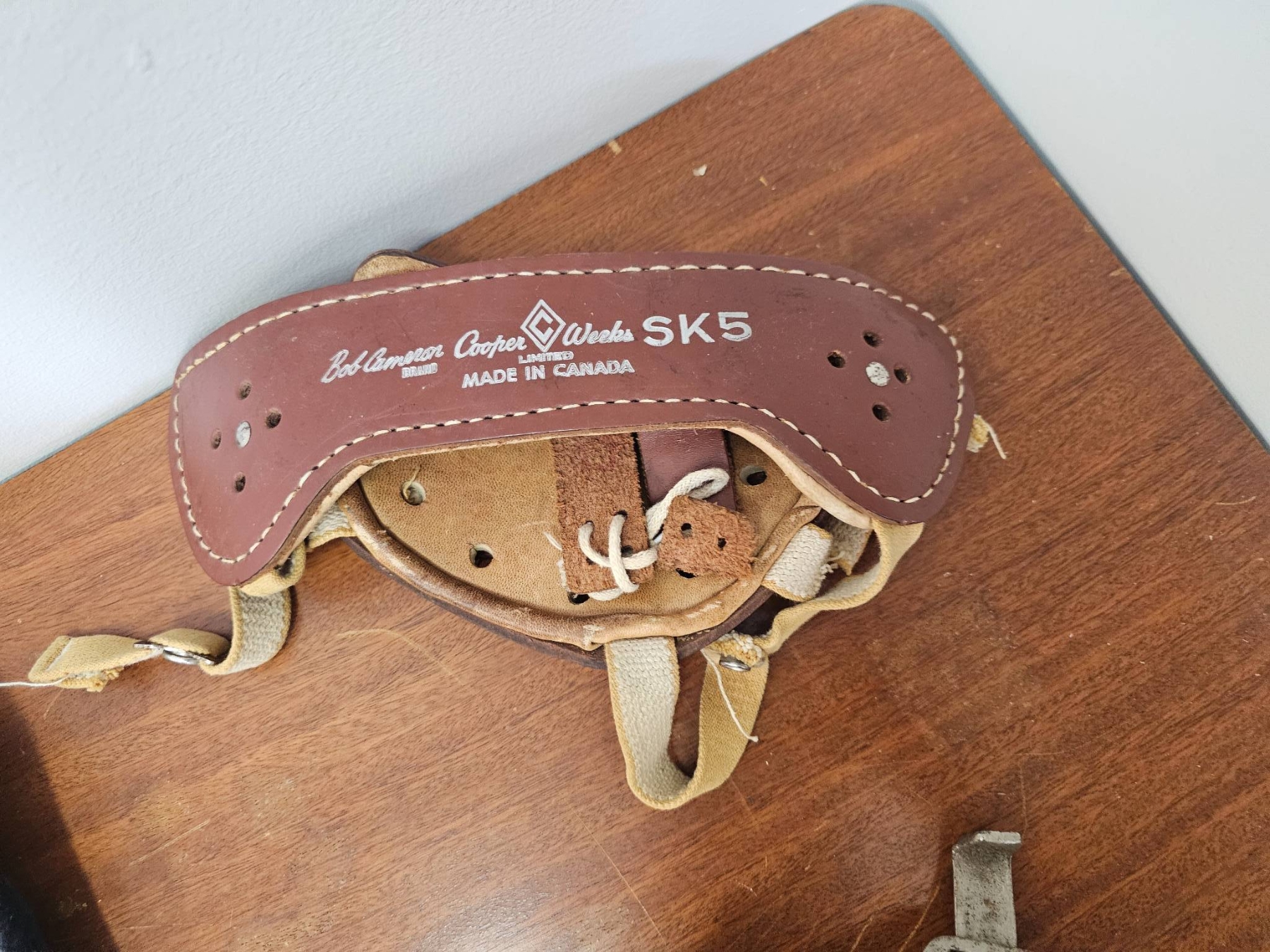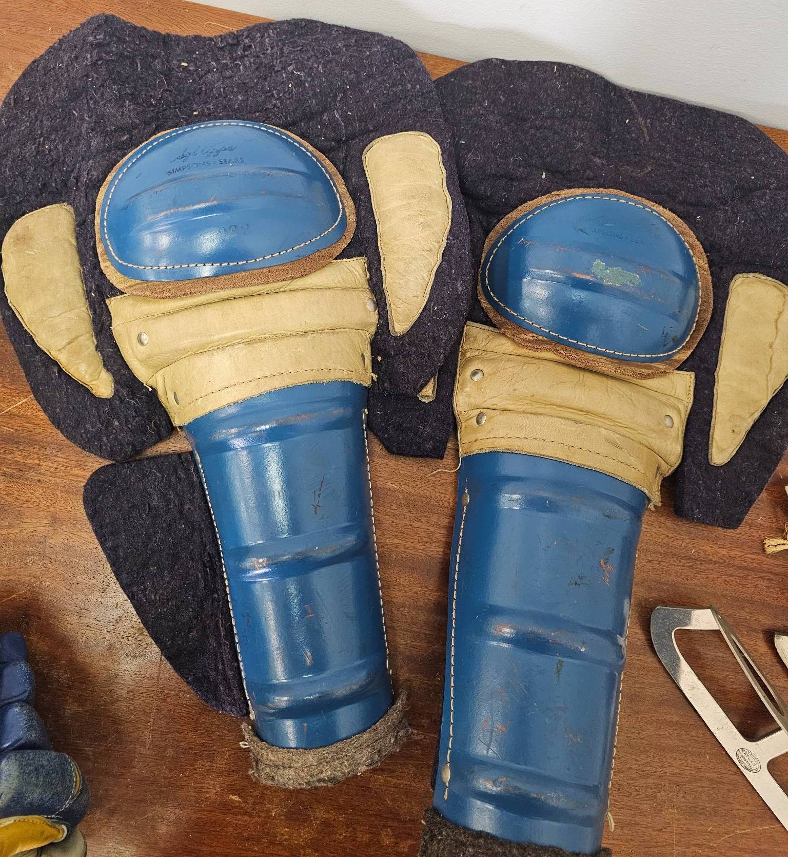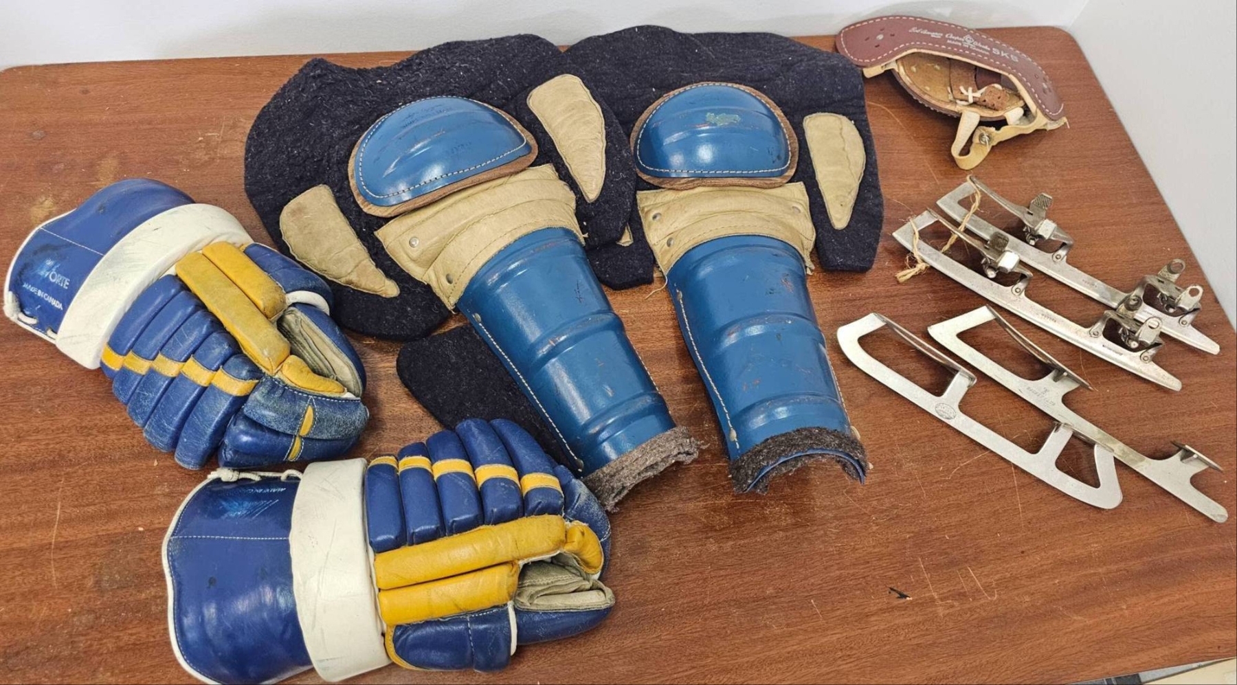 A pair of blue and yellow ice hockey gloves, blue shin guards with padding, leather strap-on protective gear labeled SK5, and metal skate blades. Items appear used with visible wear on the surfaces. Manufactured in Canada as marked on the protective gear. The lot represents mid-20th-century ice hockey equipment.