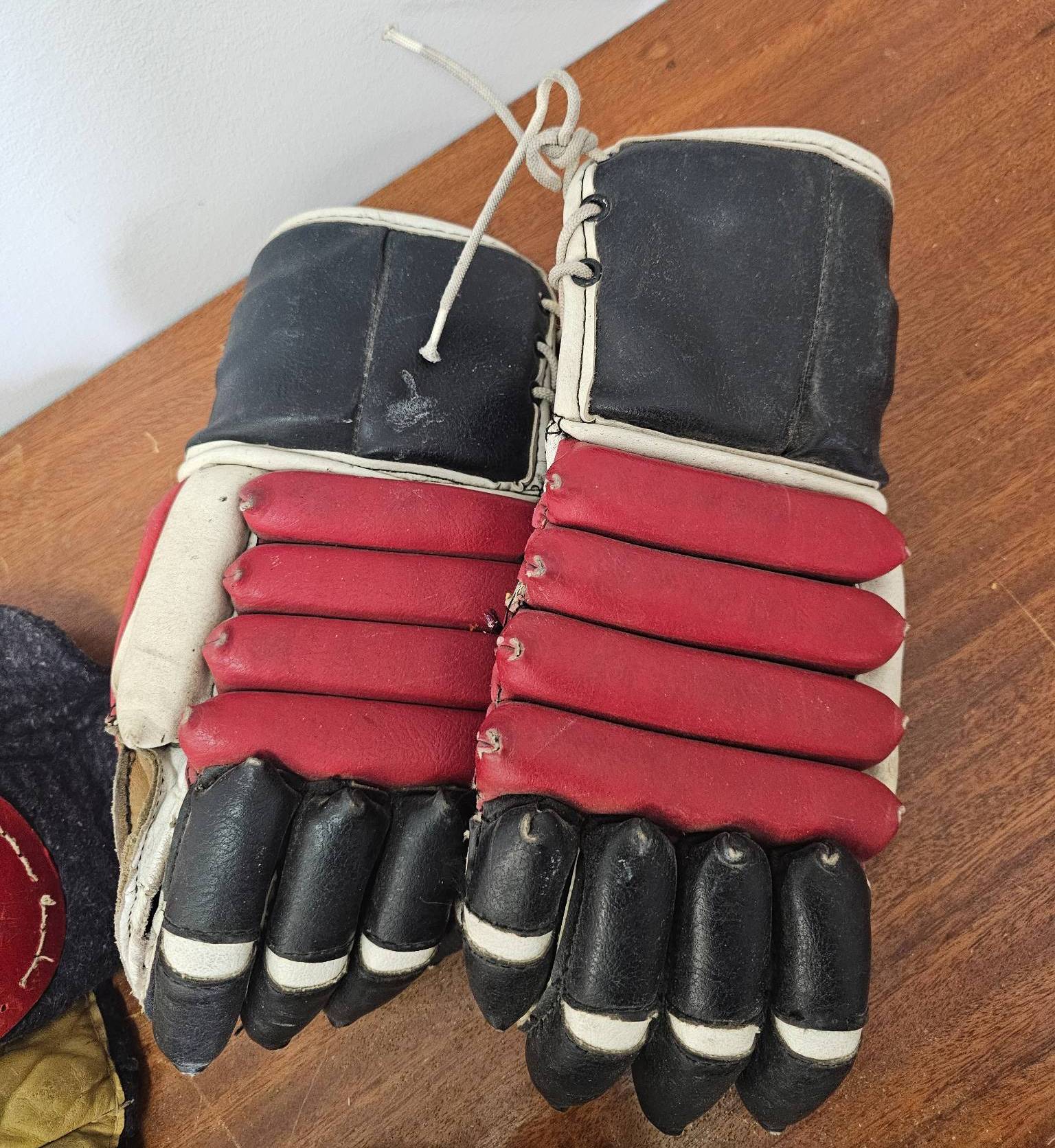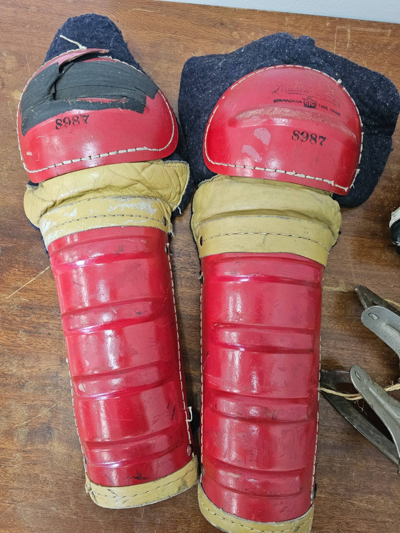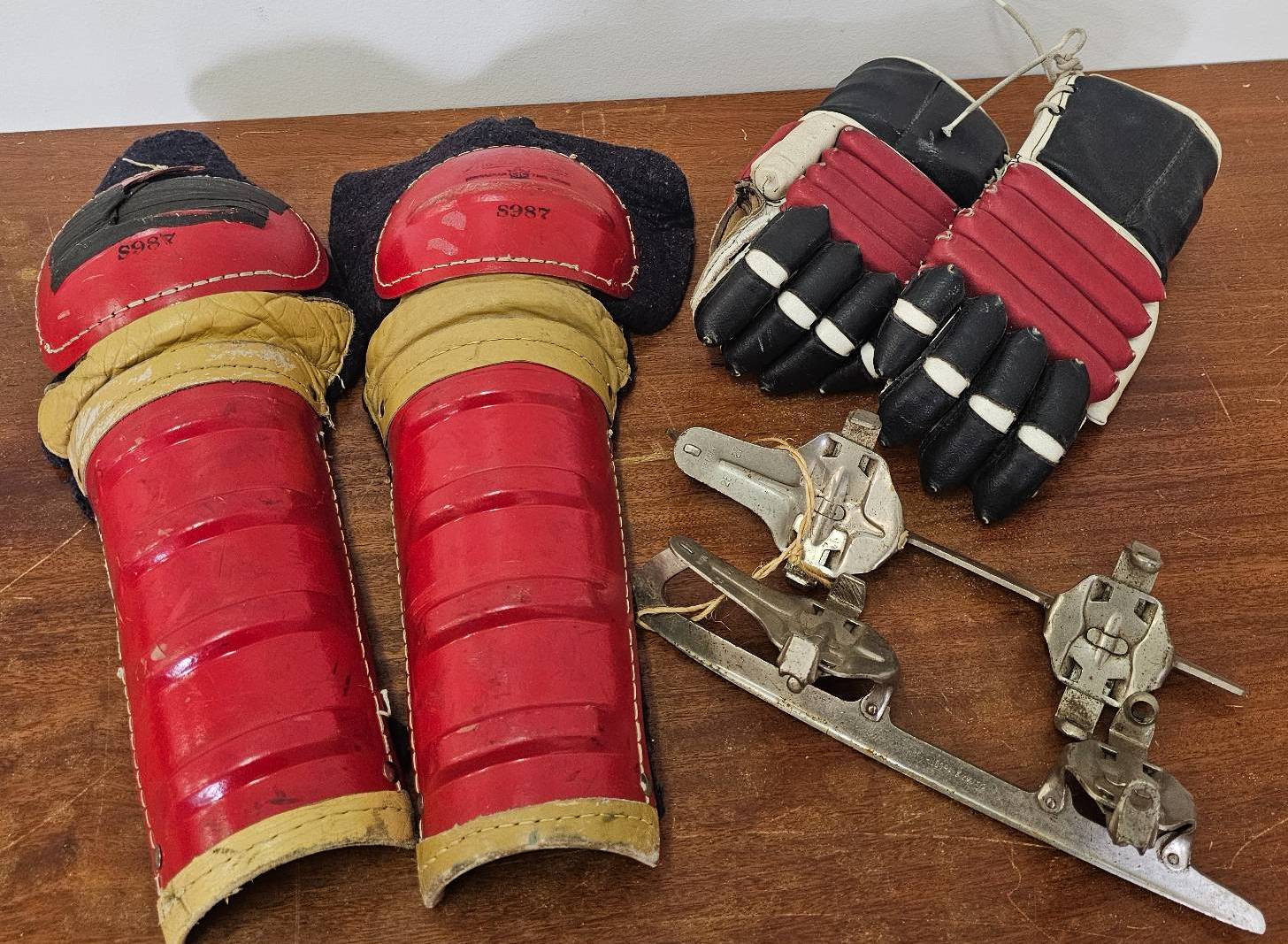 A vintage hockey equipment collection including red and cream shin guards marked '5987,' red-and-black padded gloves, and a pair of metal ice skate blades with fastening mechanisms. The items show signs of wear and aging, indicative of prior use. Overall condition may require assessment for display or collectible purposes.