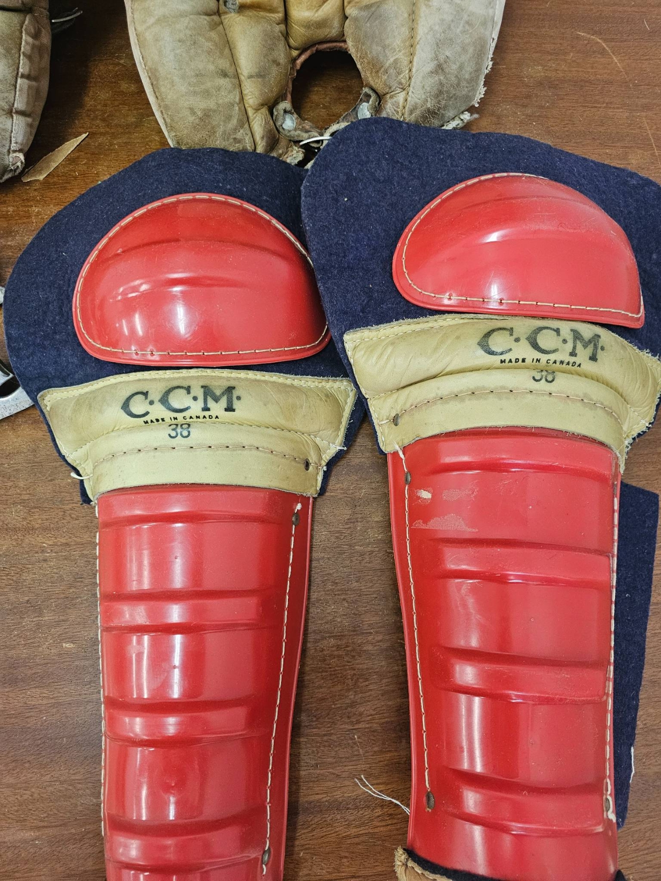 Vintage hockey equipment featuring CCM red and beige shin guards (size not specified), a pair of weathered padded leg protectors, and two ice skate blades with mounting hardware. The items show significant wear consistent with age and use, and may serve as a collectible or restoration project.