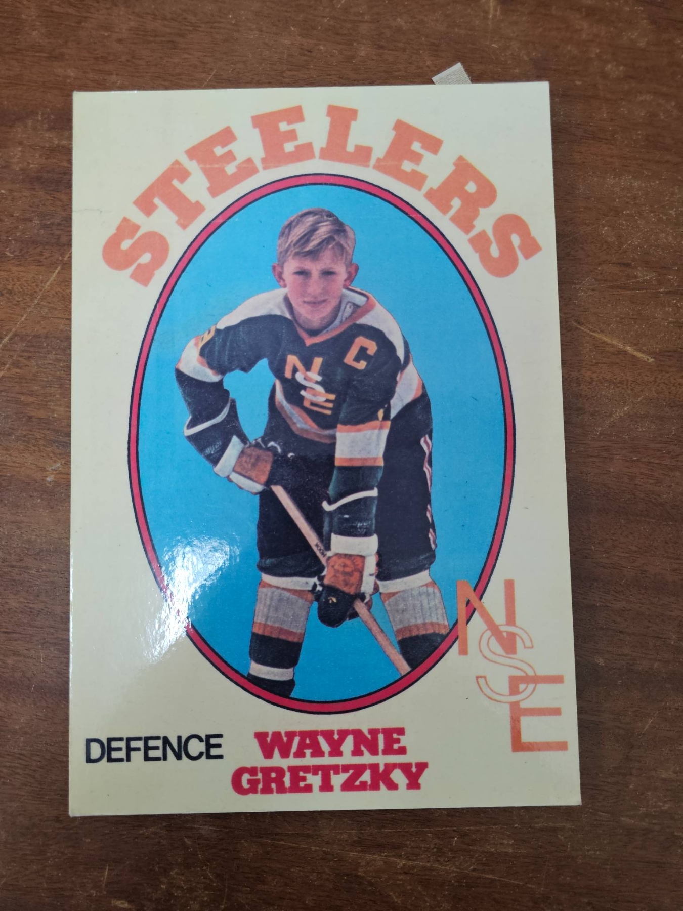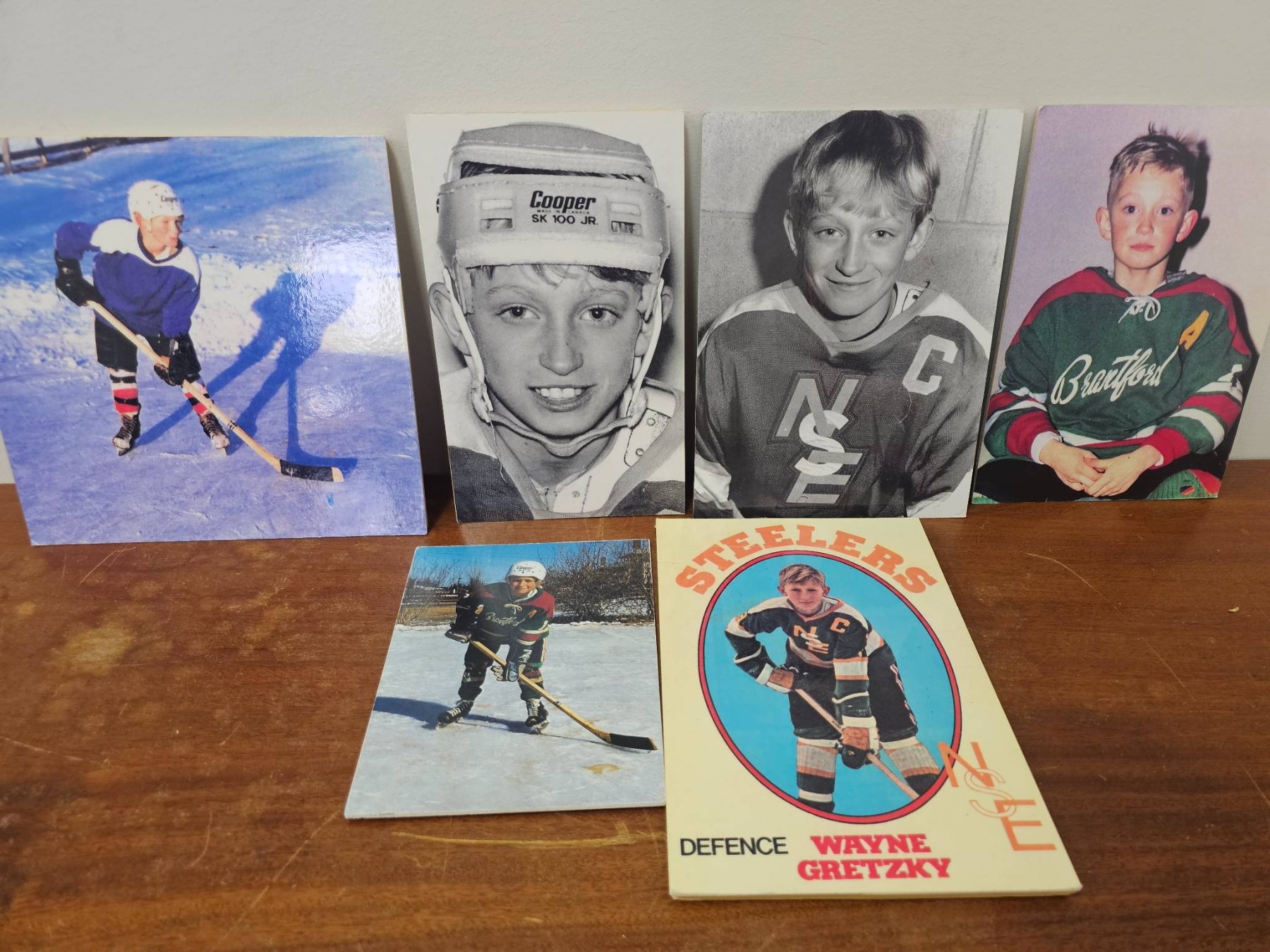 Six childhood and early hockey photographs of Wayne Gretzky, including images of him in hockey gear and team uniforms, along with a Steelers hockey card showcasing him as "Defence" Photographs consist of color and black-and-white prints. Back of one mount has minor markings. Condition appears generally good with minor signs of handling.