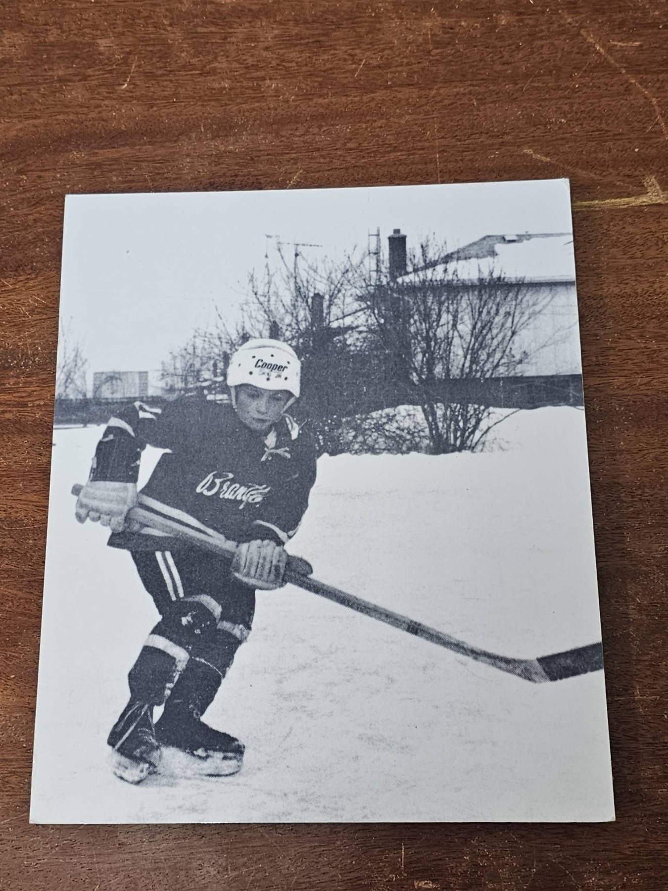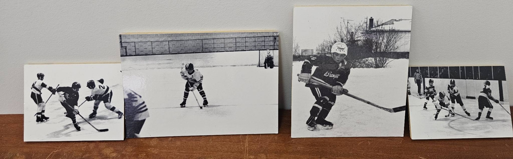 Four black-and-white photographs capturing ice hockey scenes. The photographs feature players in action, including individual and group shots taken during games and practice. The images are printed on photographic paper and showcase vintage-style hockey gear and outdoor as well as indoor rinks.