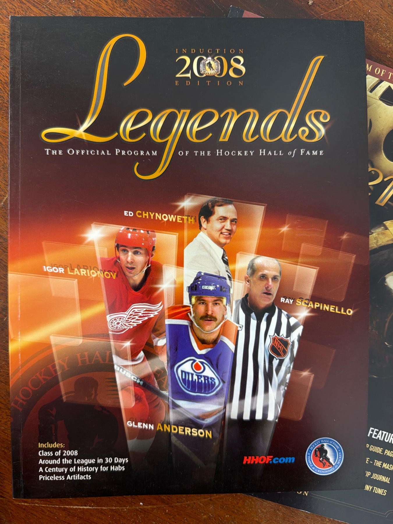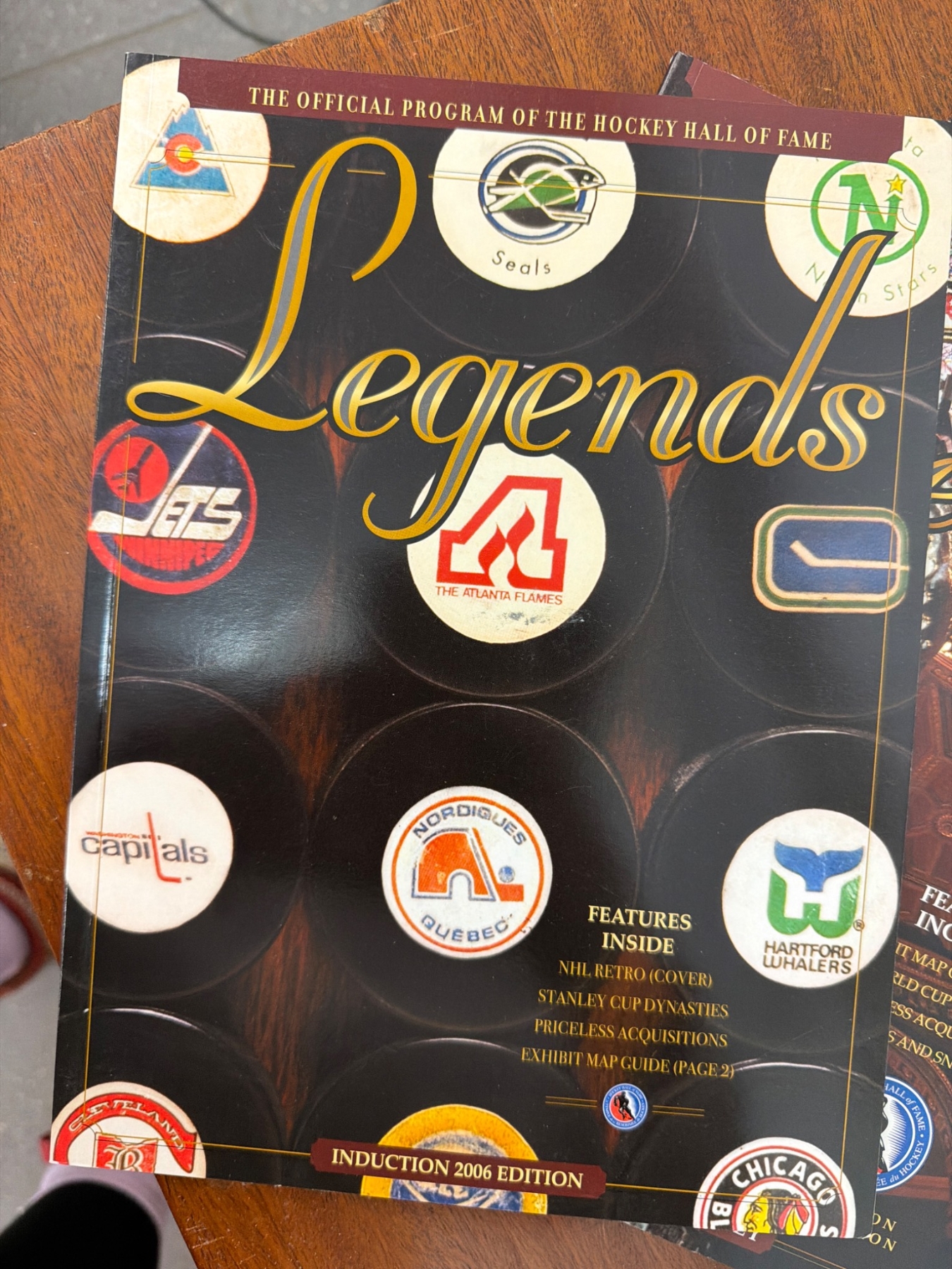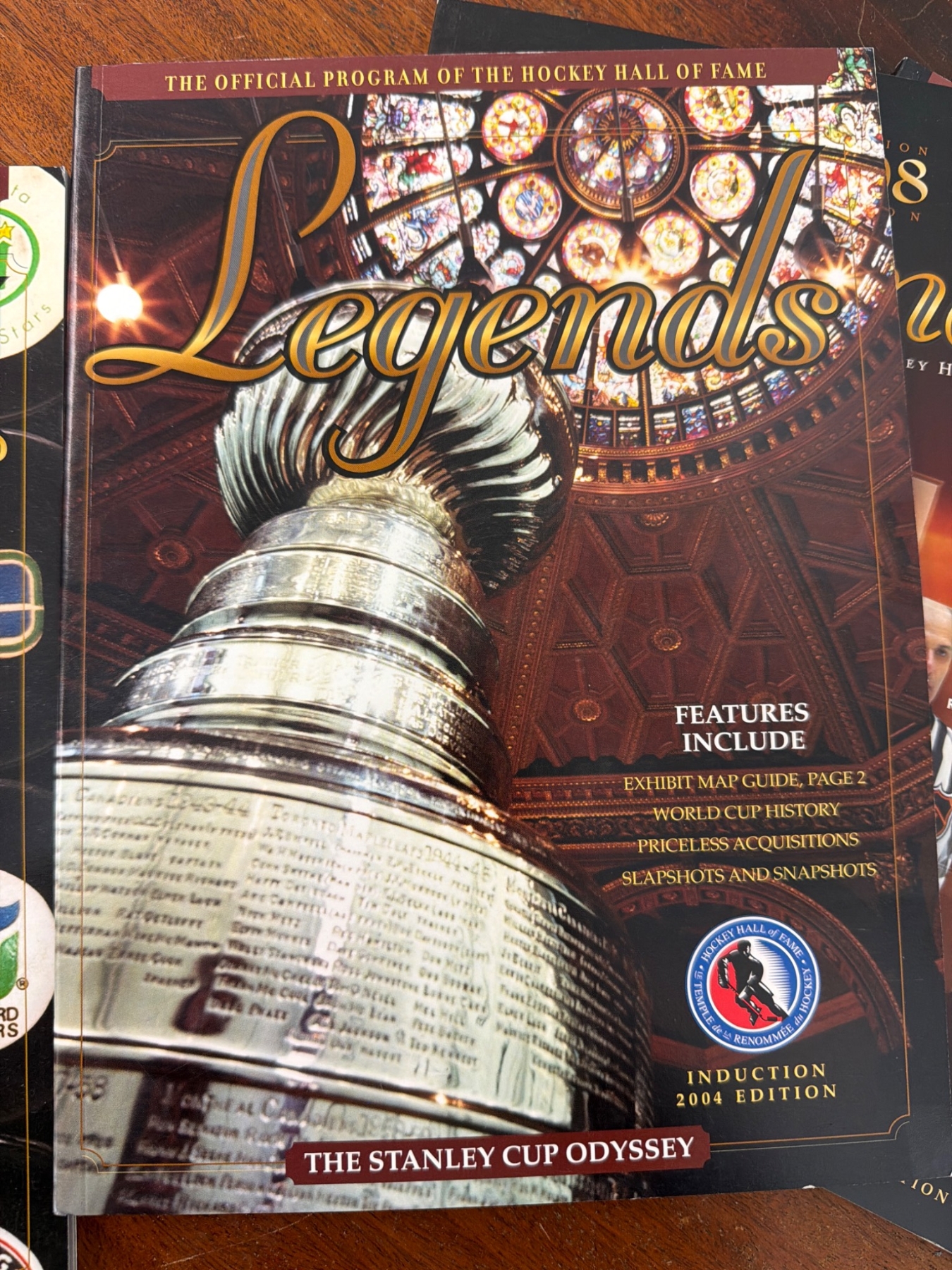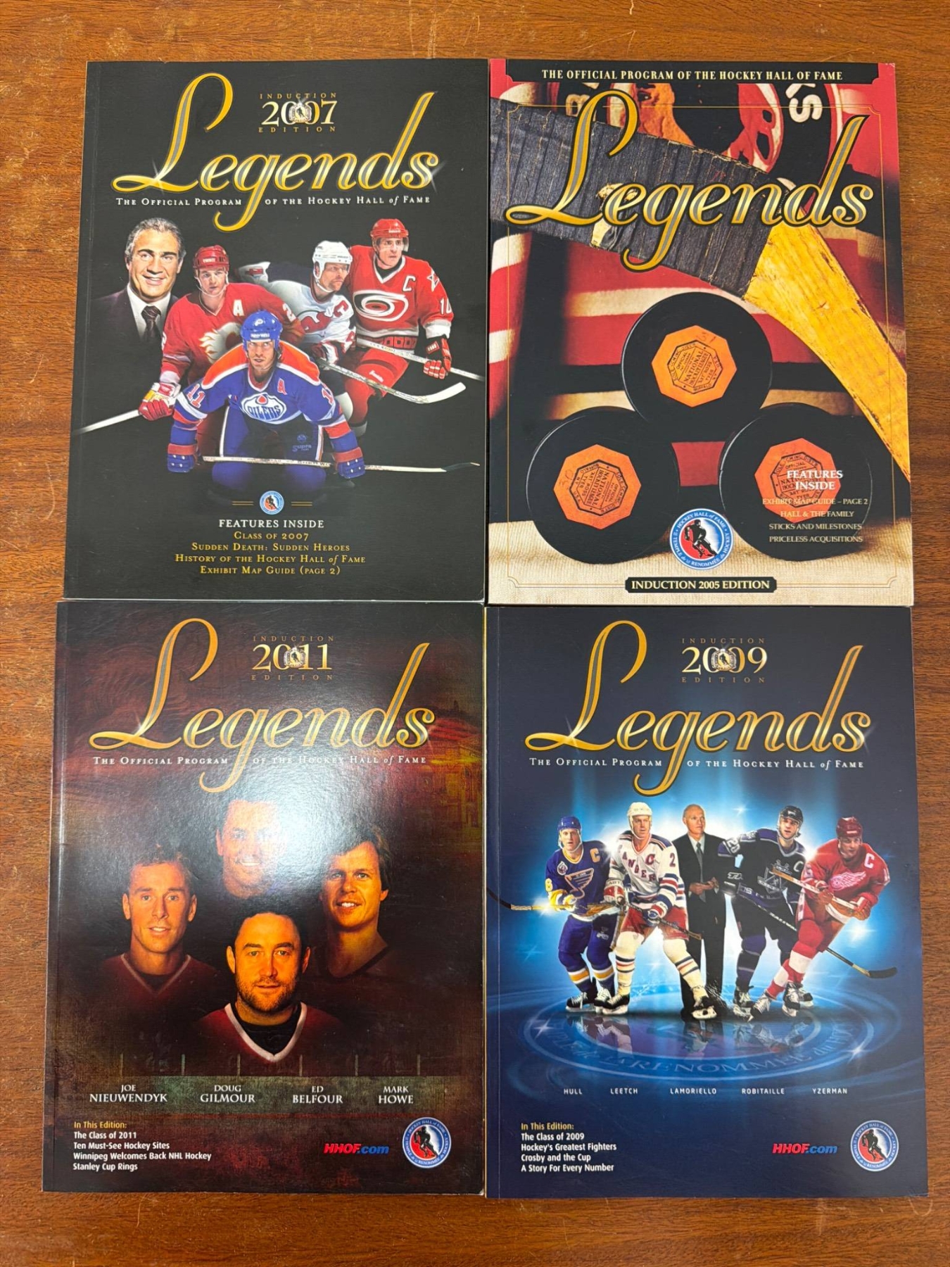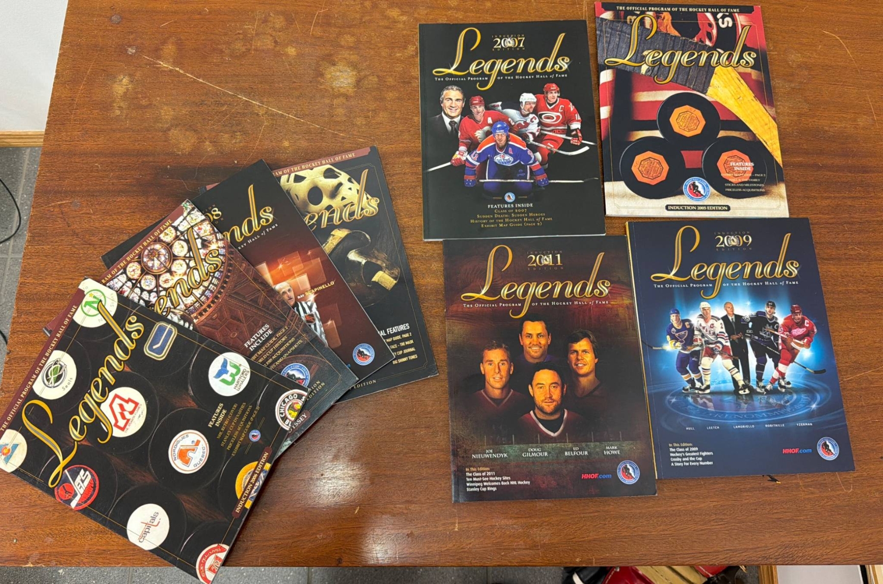 Official programs titled 'Legends,' issued by the Hockey Hall of Fame. Includes seven editions spanning from 2003 to 2009, each highlighting Hall of Fame inductions, exhibits, Stanley Cup features, and player profiles. Programs are in used condition, with minor wear consistent with age and handling. A valuable piece of hockey memorabilia for collectors.