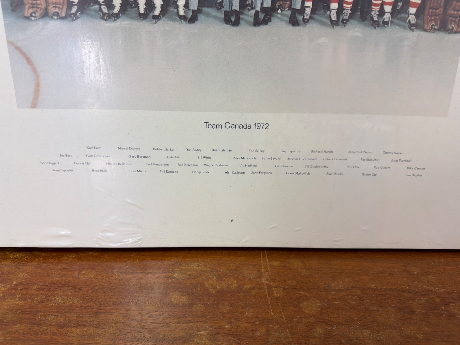 Framed photographic print of Team Canada 1972, featuring players and staff in red and white uniforms with maple leaf designs. The names of players and staff are listed below the photograph. The item is framed under protective plastic. Overall good condition with no visible major flaws.
