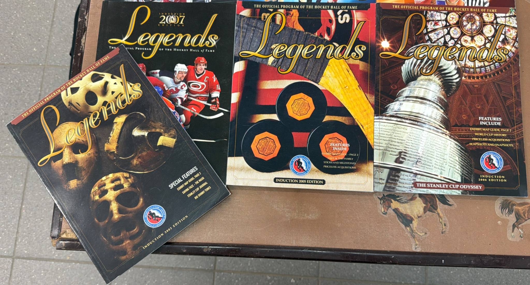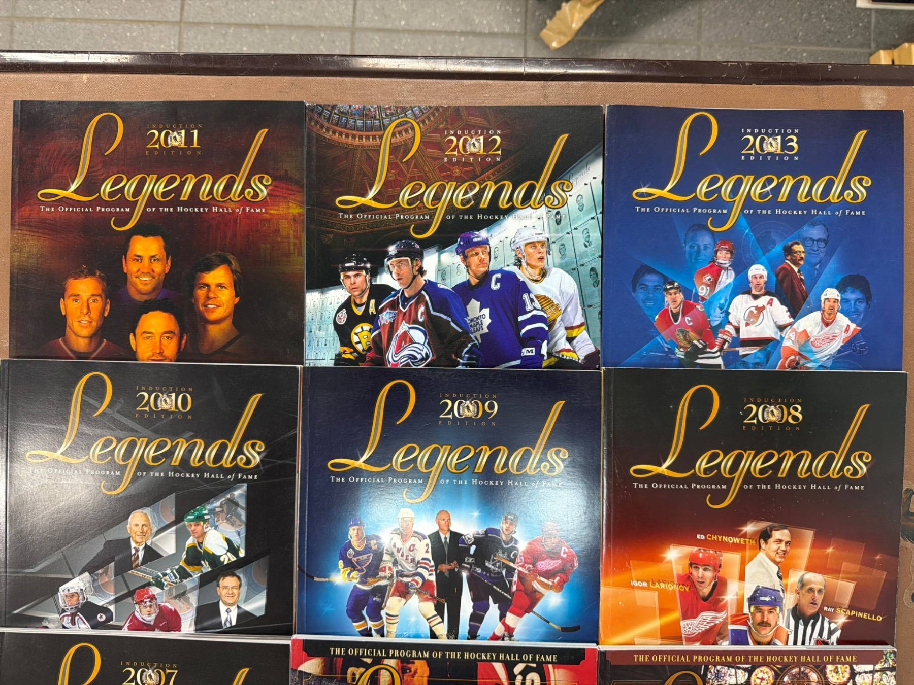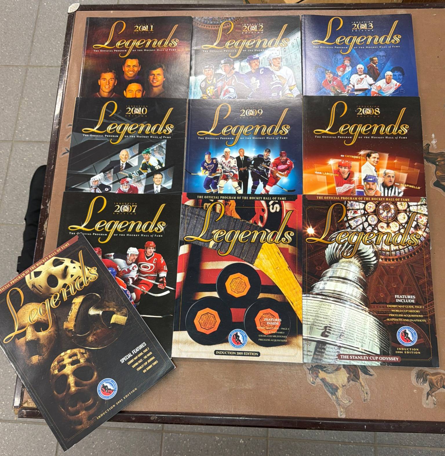Complete set of nine Hockey Hall of Fame Legends magazines spanning 2003-2013. Each publication features content dedicated to inductees, memorabilia, and iconic moments in hockey history. Covers are vividly illustrated with team and player highlights. Condition appears to be well-maintained, showcasing minimal wear, suitable for collectors and sports enthusiasts.