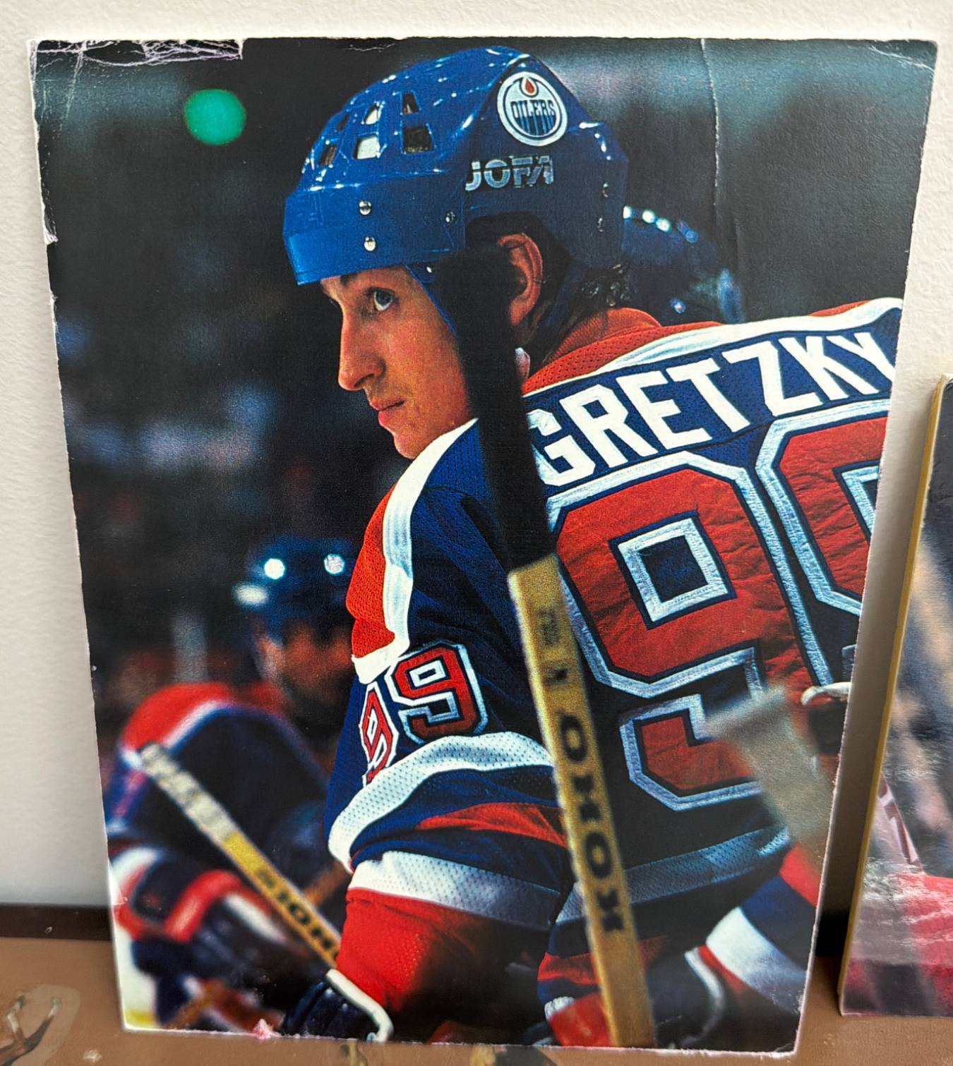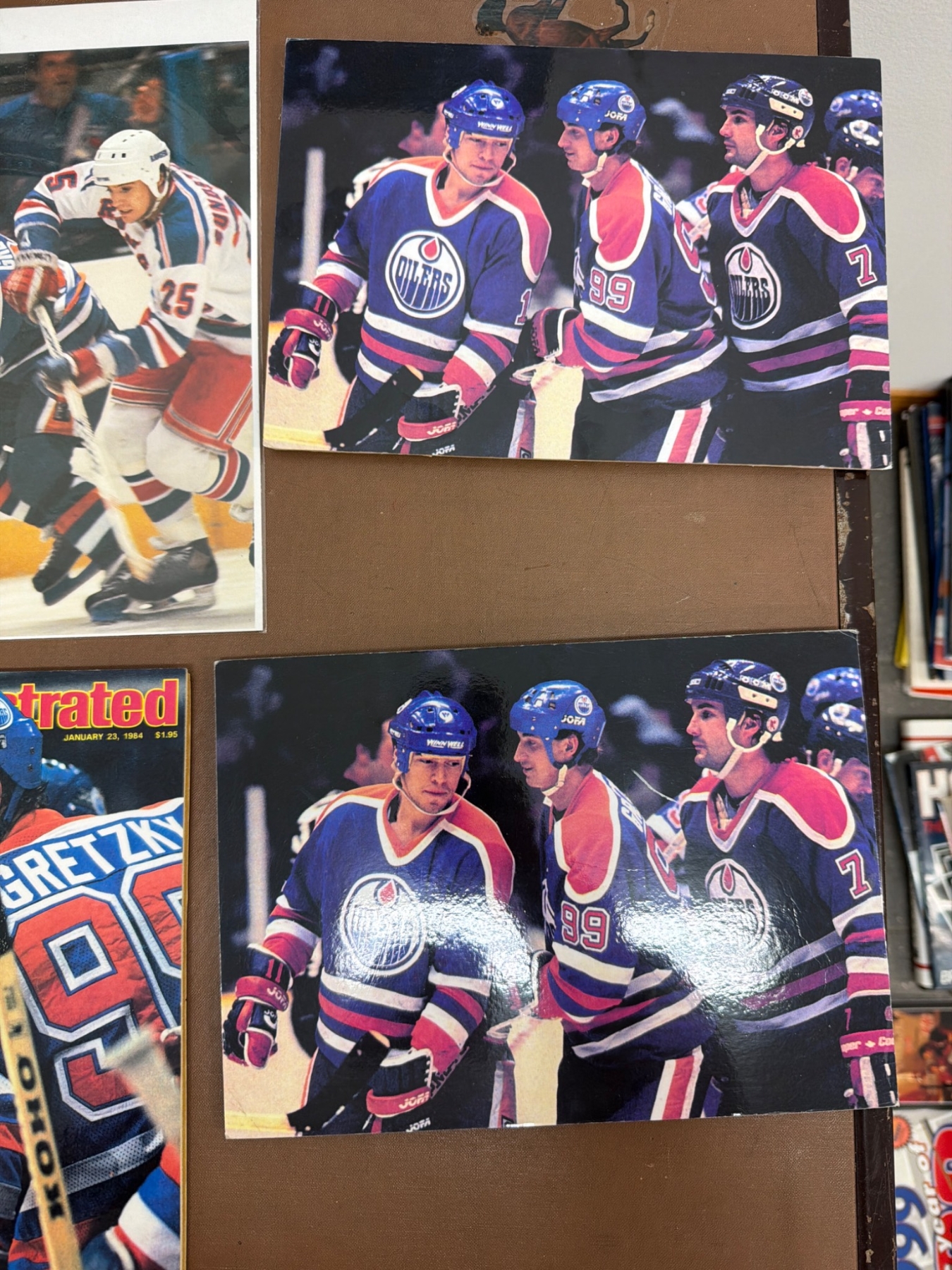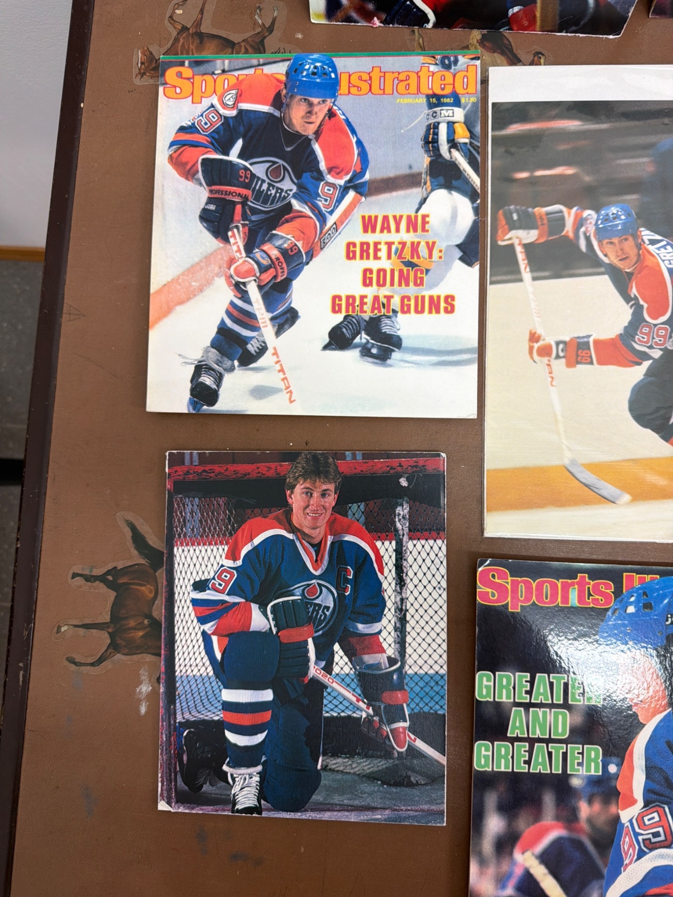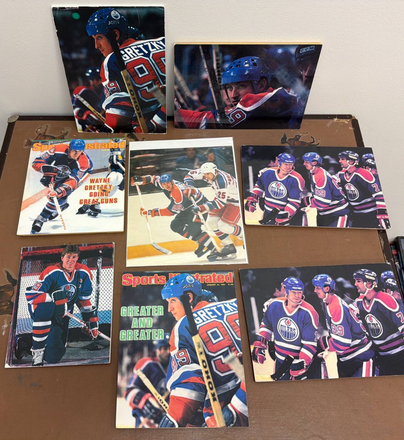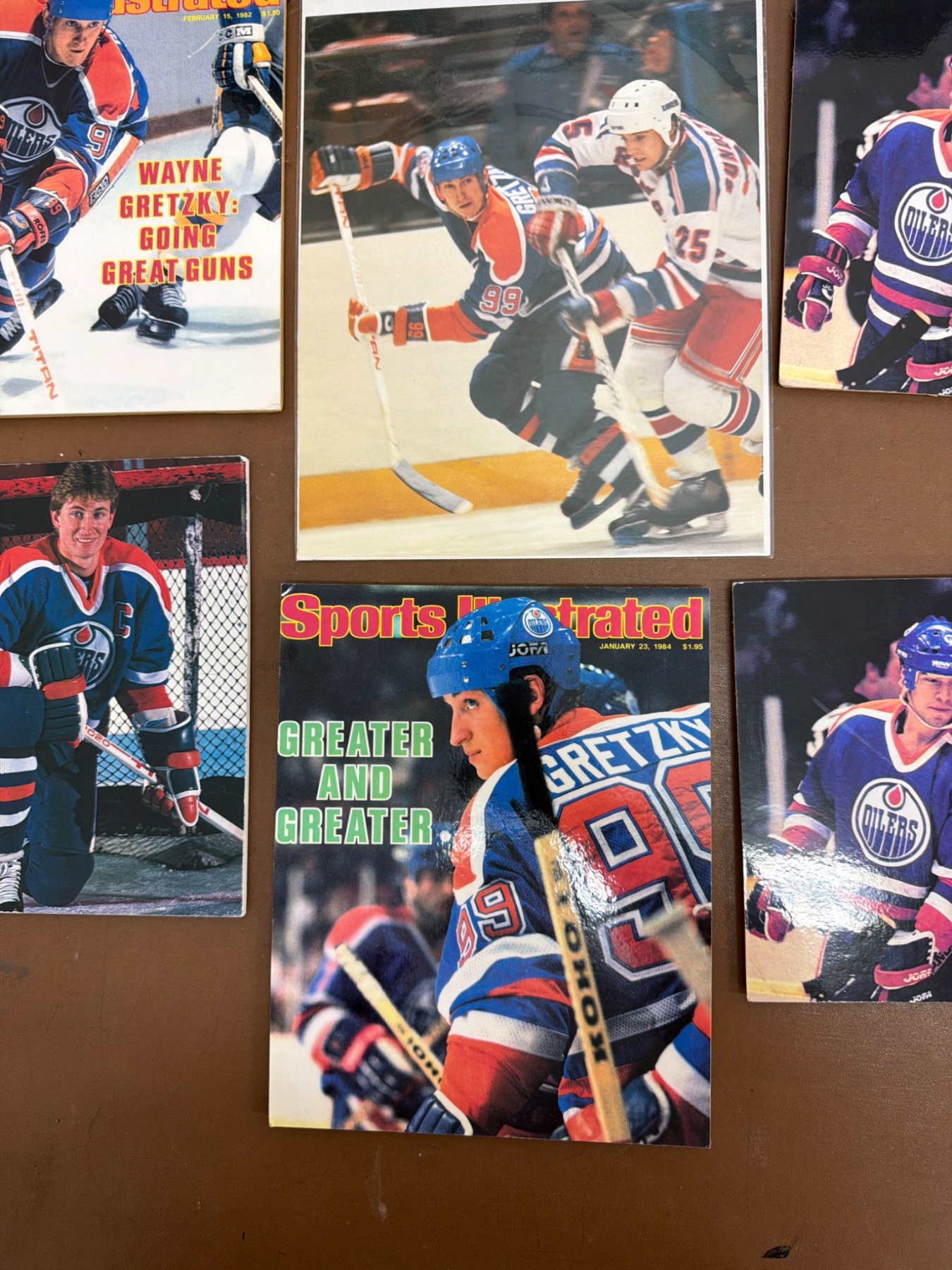 Wayne Gretzky memorabilia featuring Sports Illustrated magazine covers and photographs during his time with the Edmonton Oilers. Items showcase moments with Gretzky in action and team photographs. Condition varies; some pieces show signs of wear indicative of age. Suitable for hockey enthusiasts or collectors of sports memorabilia.