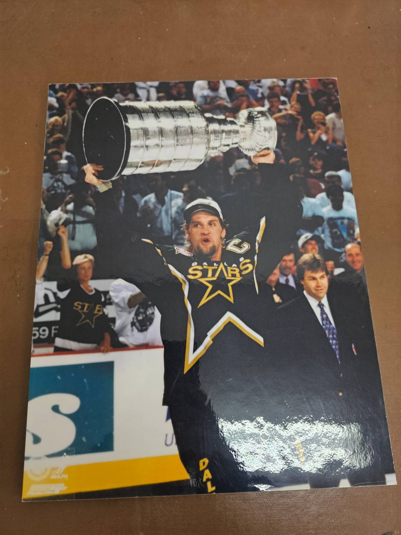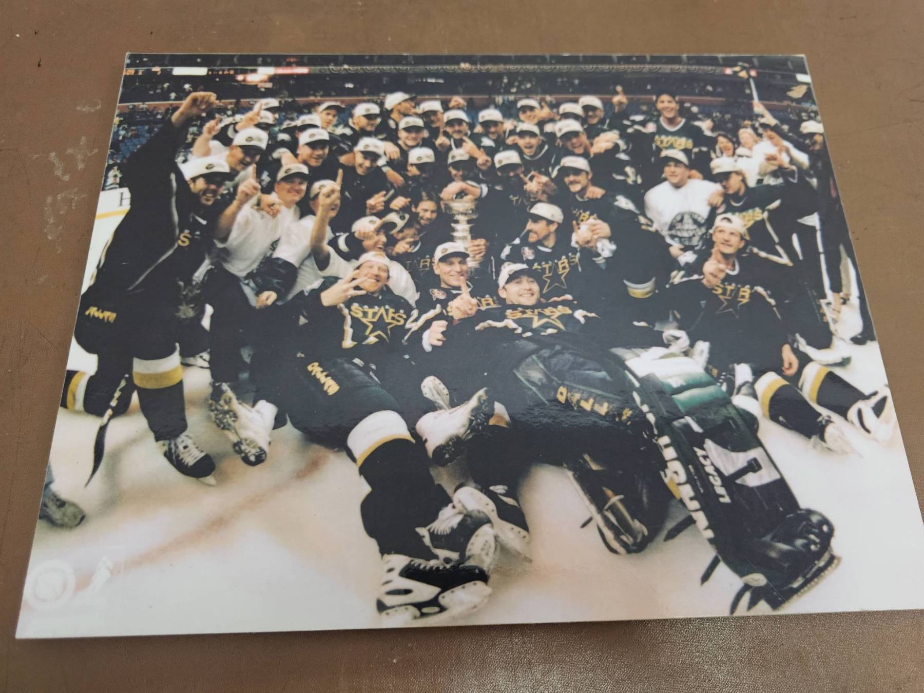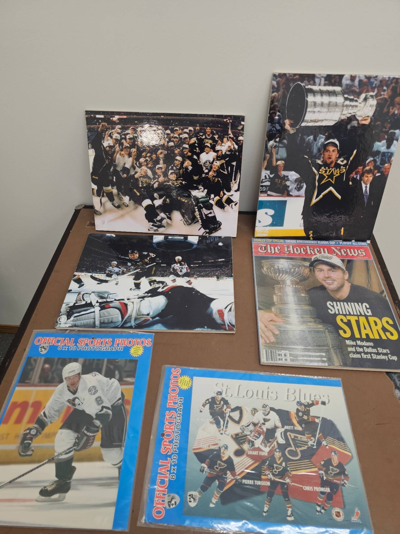 A mix of NHL memorabilia, including multiple official 8x10 photographs of the Dallas Stars and St. Louis Blues players, game action moments, and Stanley Cup celebrations. Highlights include a Hockey News magazine featuring Mike Modano and the Dallas Stars, as well as other keepsakes capturing iconic NHL moments. Perfect for collectors or hockey enthusiasts.