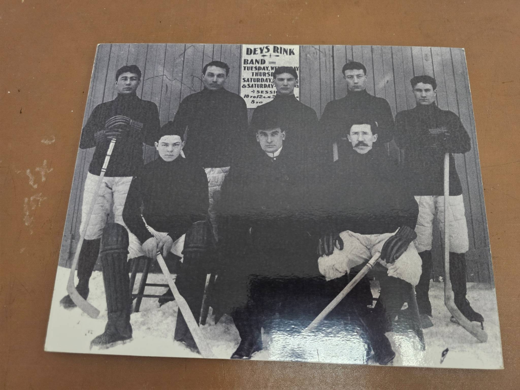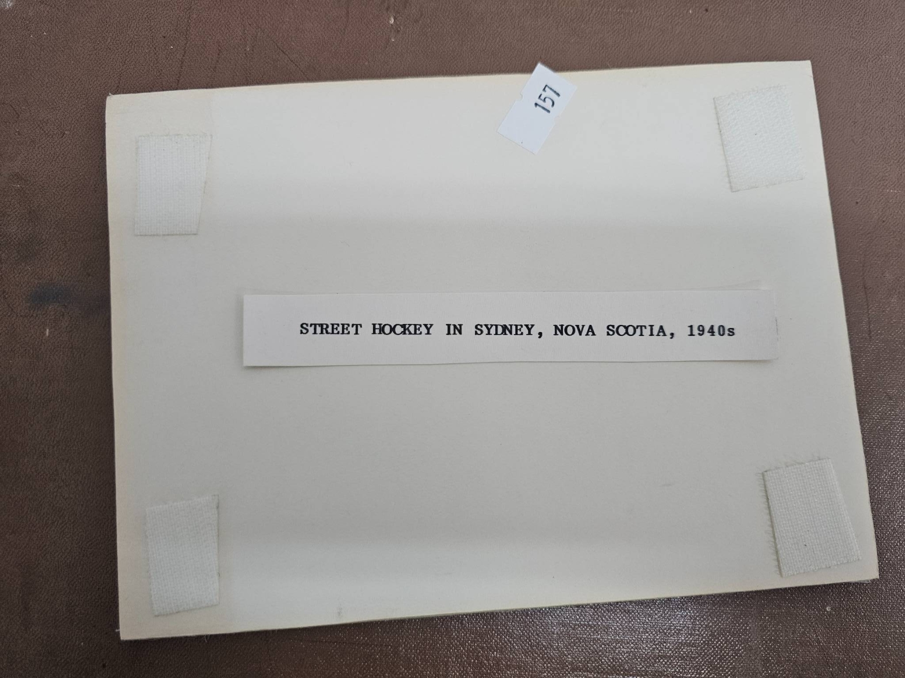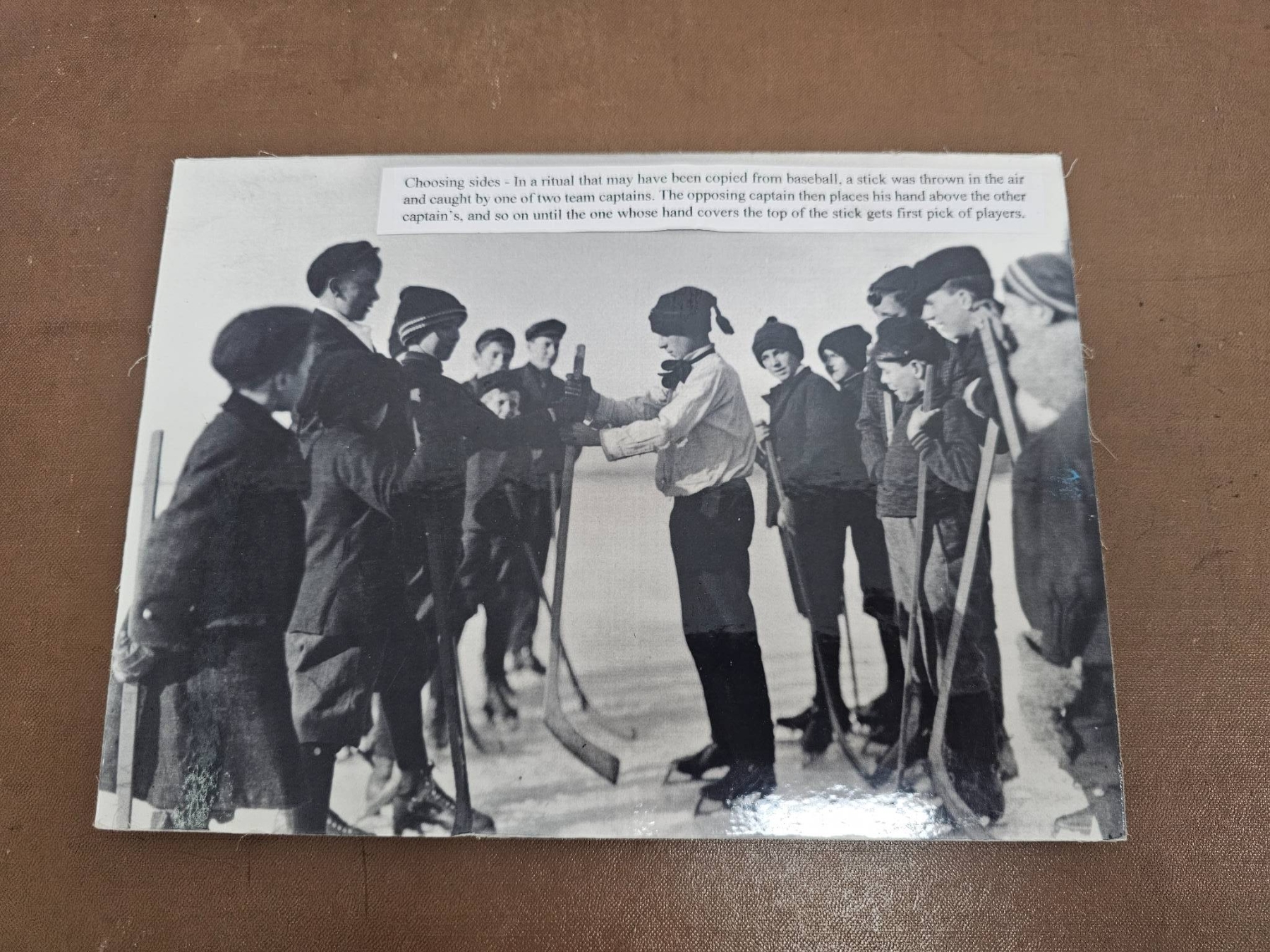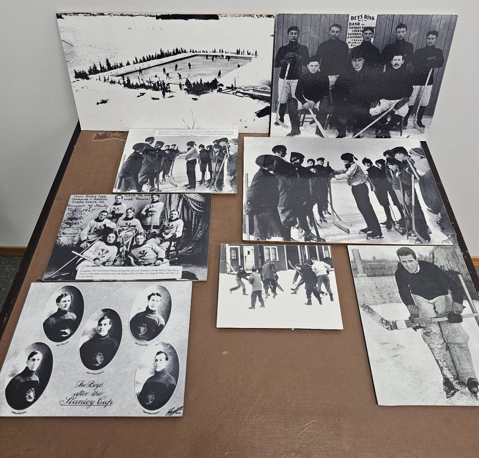 Black-and-white prints featuring historical ice hockey moments. Images include team portraits, game action, and street hockey scenes, offering rich glimpses into the early days of the sport. Mounted on varying backings, some feature handwritten notes and dated captions. A valuable visual record for hockey enthusiasts and collectors of sports memorabilia.