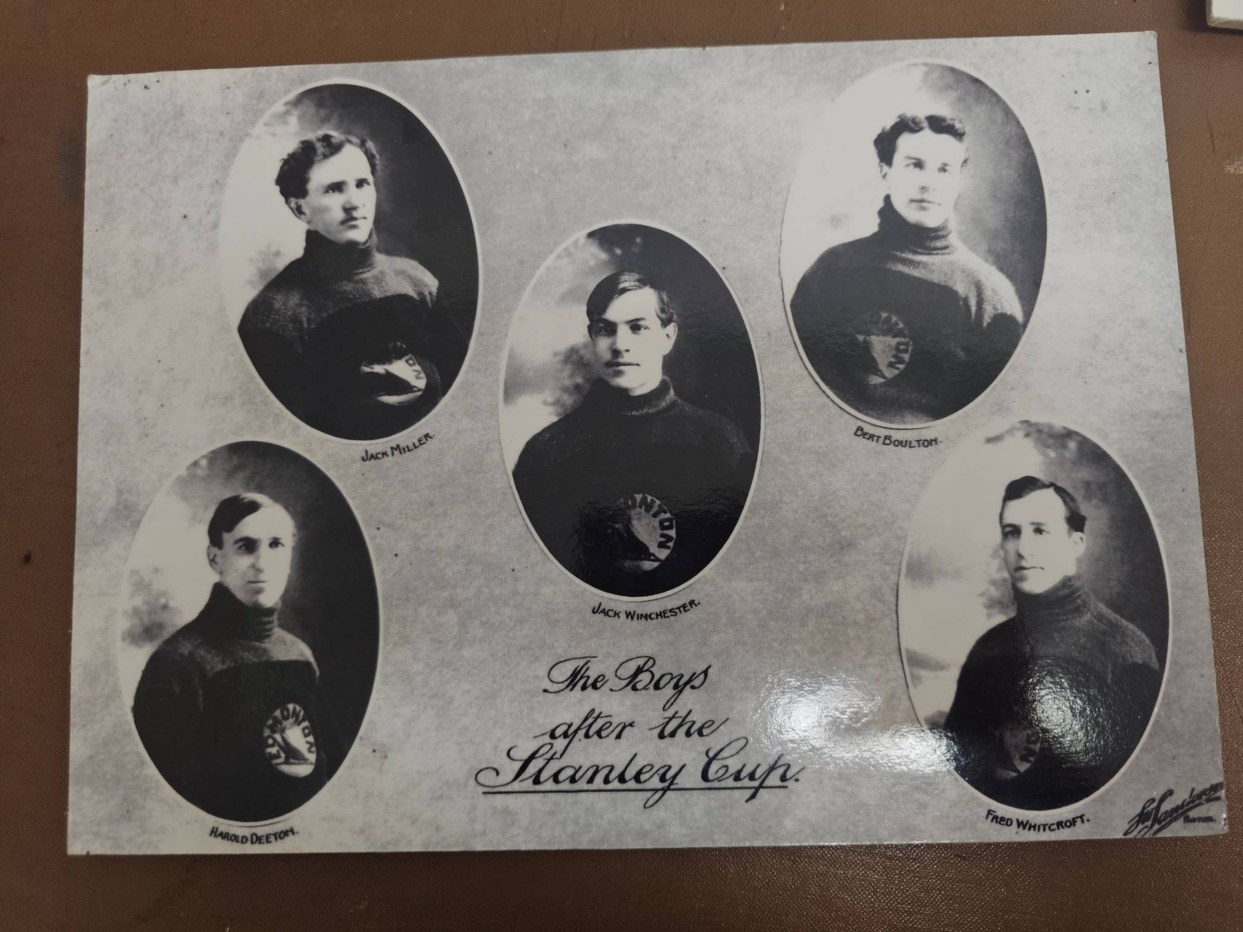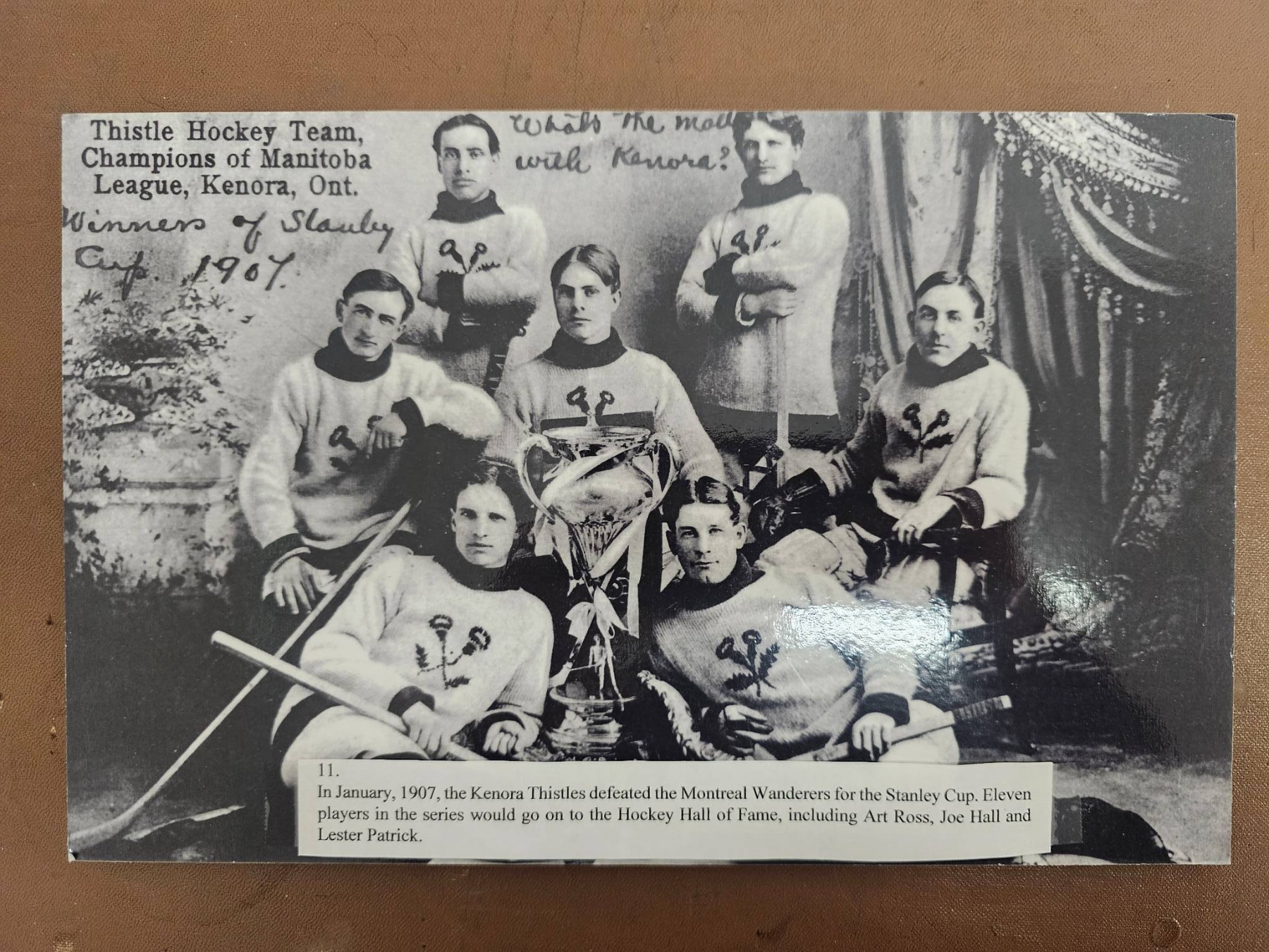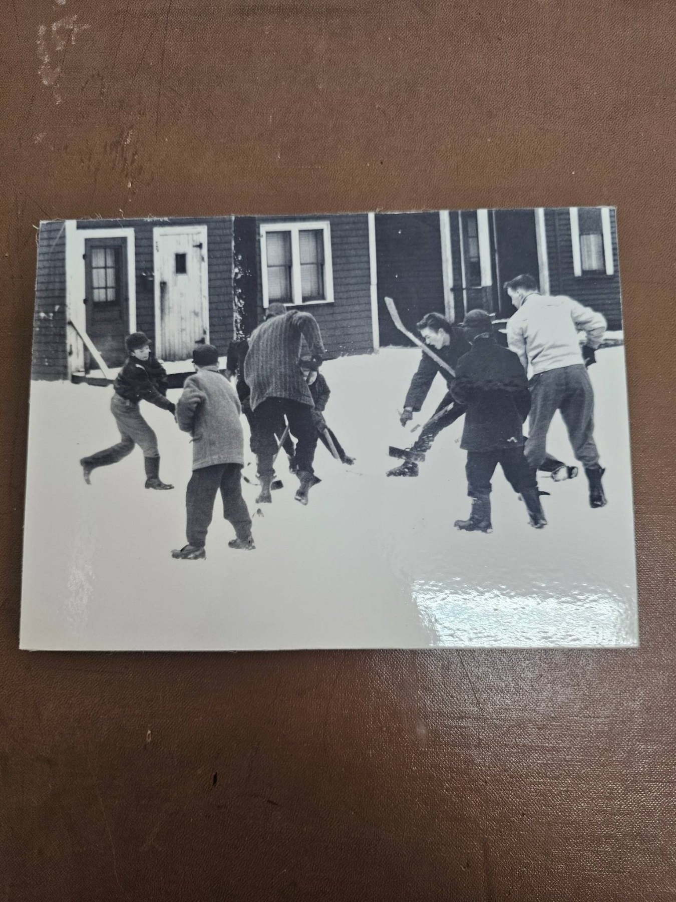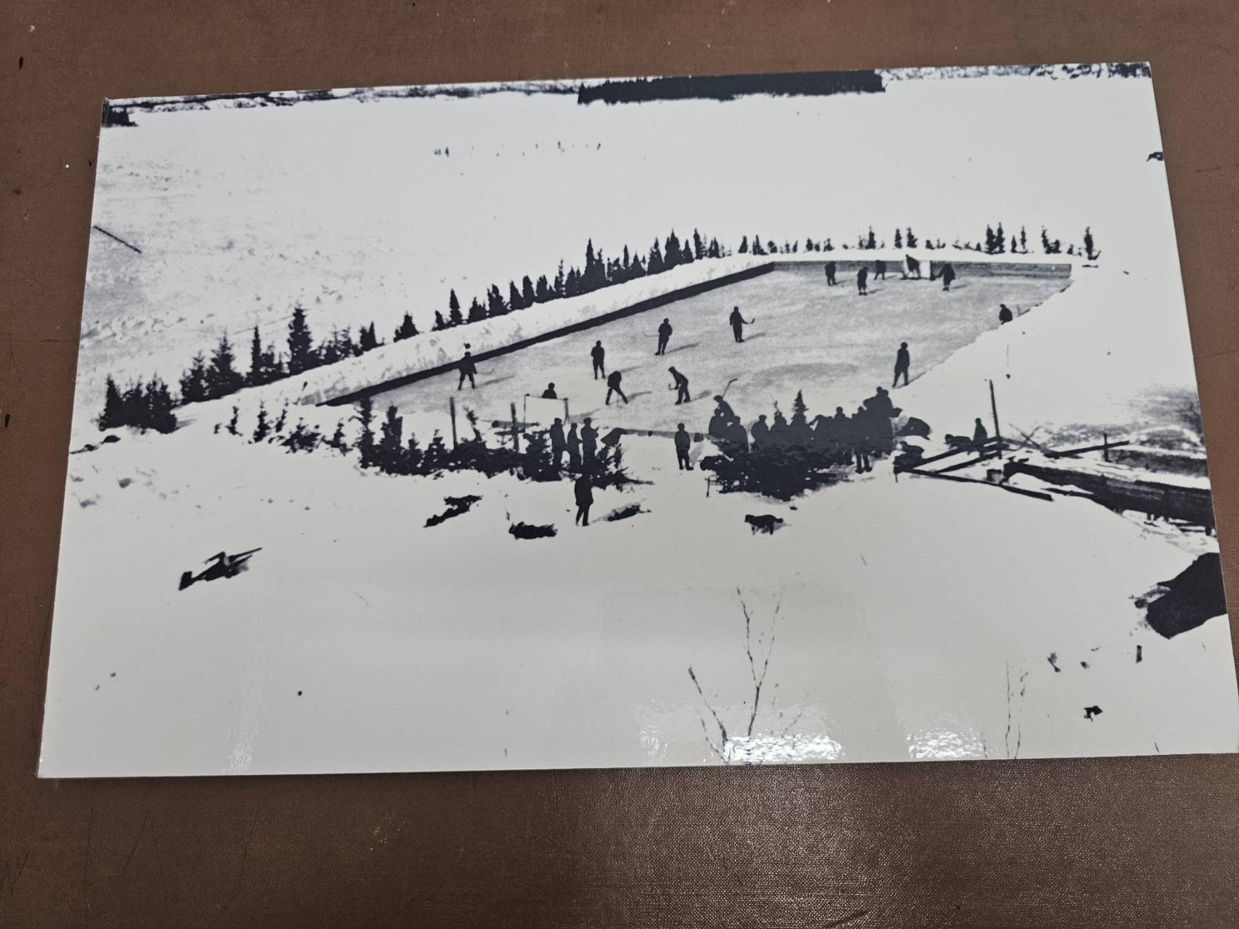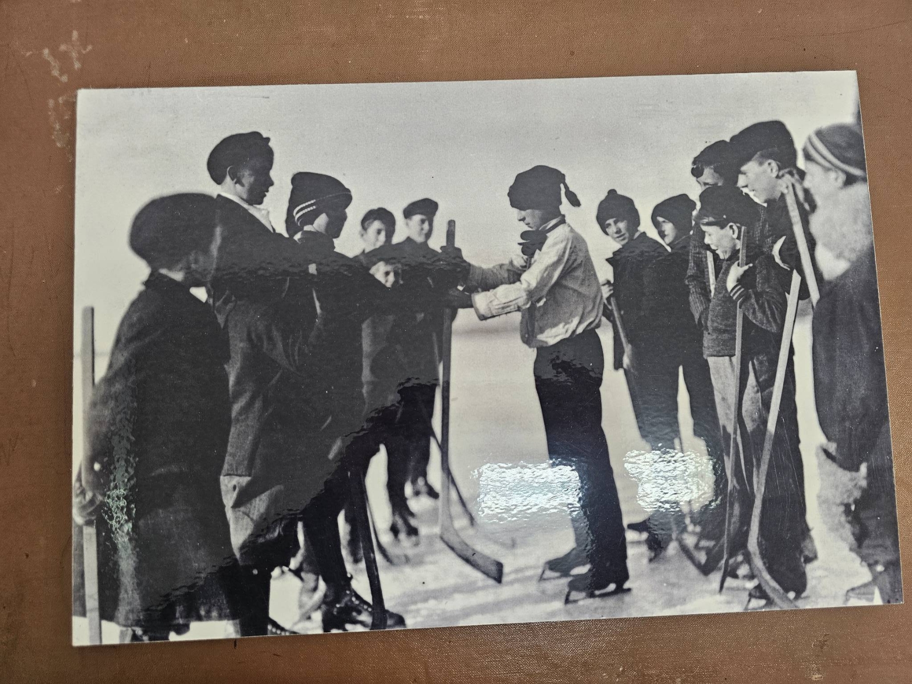 Black-and-white prints featuring historical ice hockey moments. Images include team portraits, game action, and street hockey scenes, offering rich glimpses into the early days of the sport. Mounted on varying backings, some feature handwritten notes and dated captions. A valuable visual record for hockey enthusiasts and collectors of sports memorabilia.