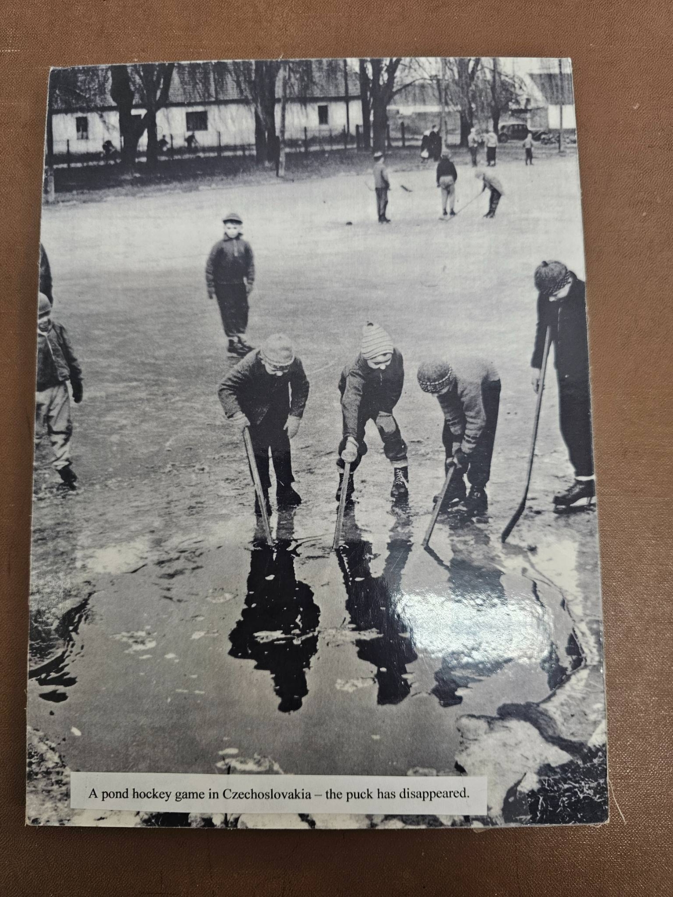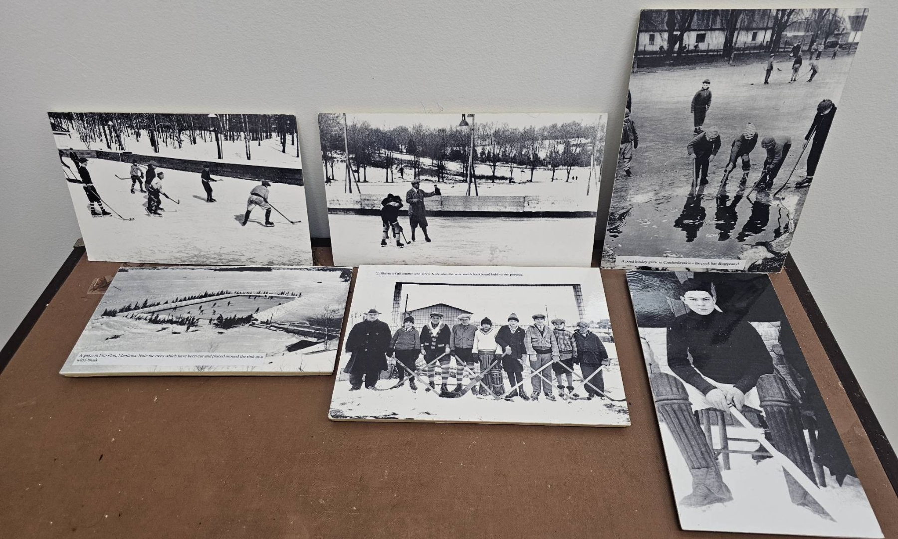 Six black-and-white photographs, each depicting vintage ice hockey scenes. Images show athletes and game settings across various periods, including a round hockey game in Czechoslovakia and other historic moments. Some photos are mounted on boards with annotations visible on the back. These images are in good condition and offer a glimpse into the history of hockey.