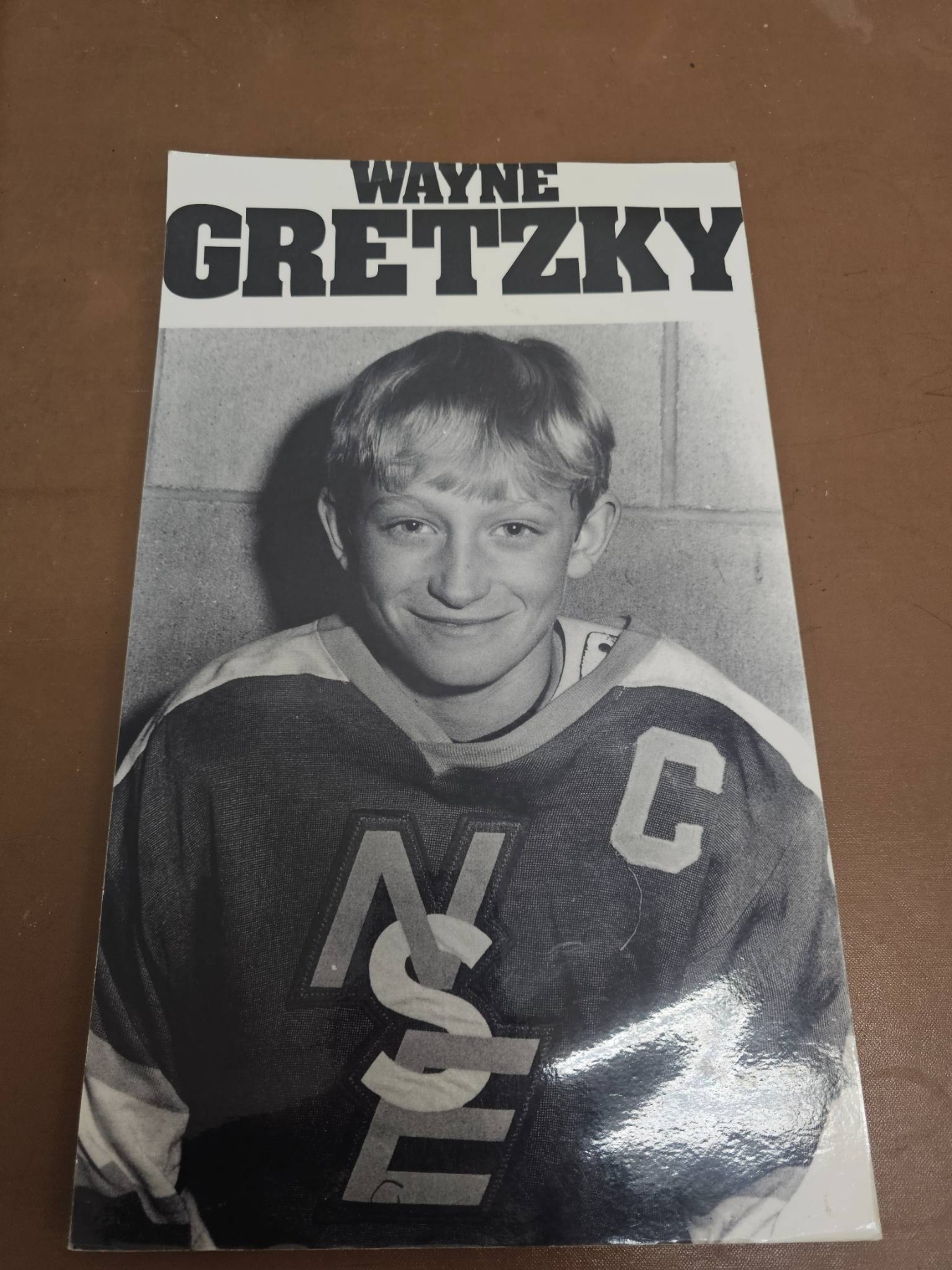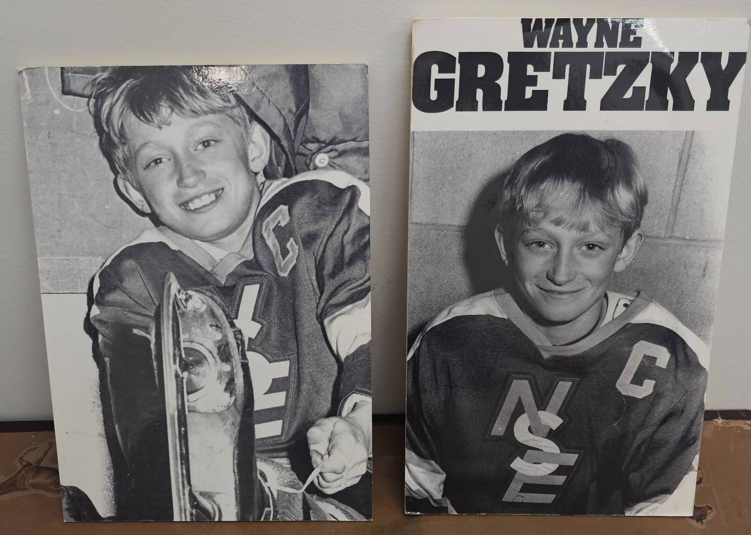 Two black-and-white photographs featuring a young Wayne Gretzky dressed in hockey gear with an 'NSE' team logo and wearing the 'C' for captain. One image showcases Gretzky smiling with a trophy, while the other offers a portrait-style view. Ideal for hockey memorabilia collectors and fans of 'The Great One.' Condition appears well-preserved, suitable for display.