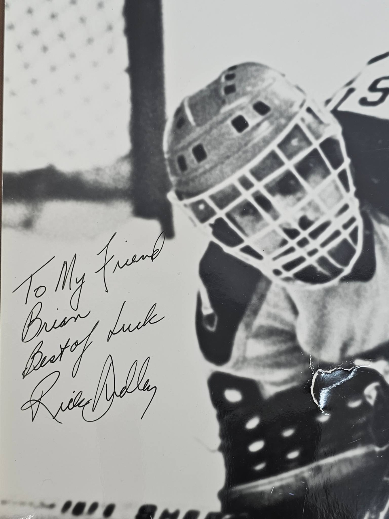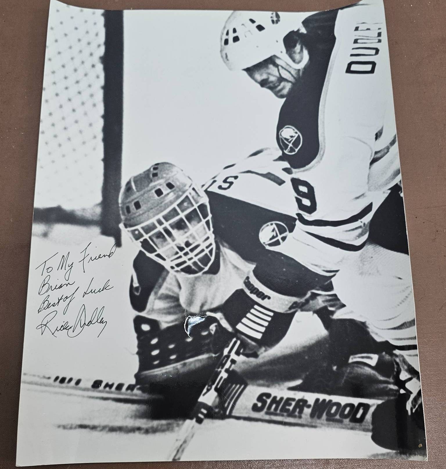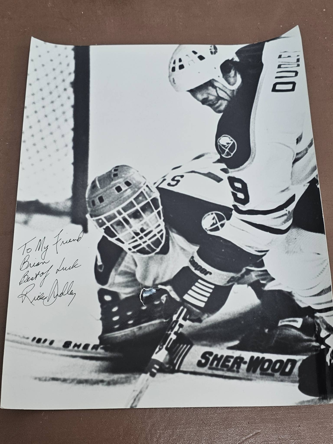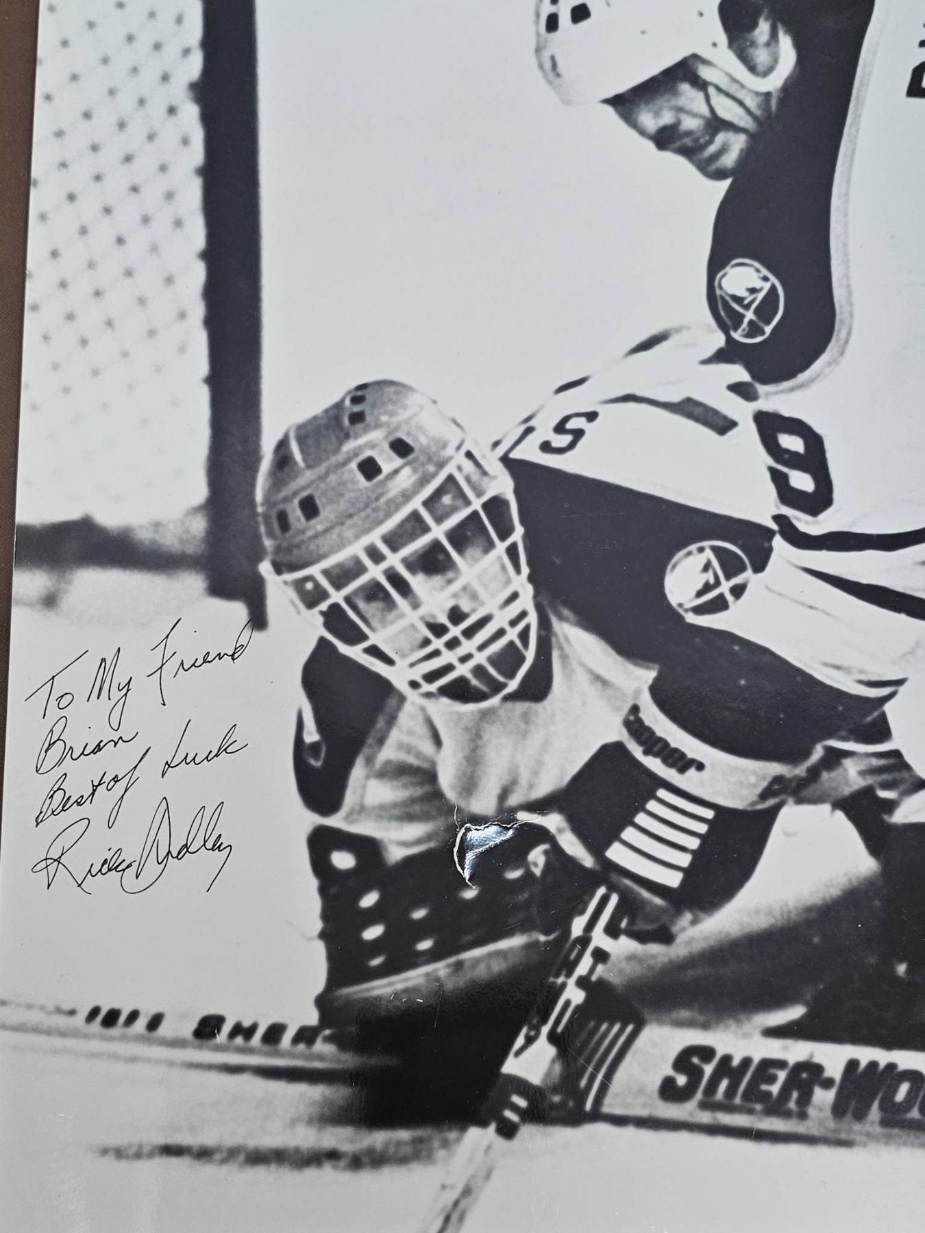 A black-and-white hockey photograph featuring two players in action, signed with a personalized message reading, "To My Friend Brian, Best of Luck" and autographed with the player's name. The image captures an intense moment, with clear details such as the Sher-Wood hockey sticks and goalie equipment. A great addition for hockey fans or collectors looking to add a personalized piece to their collection.