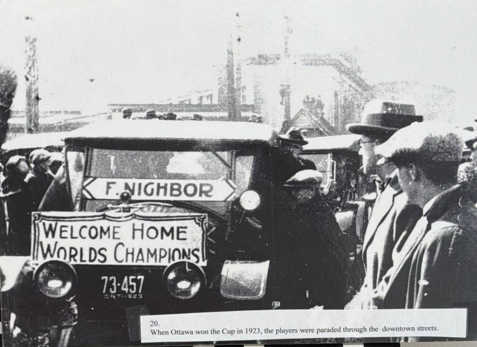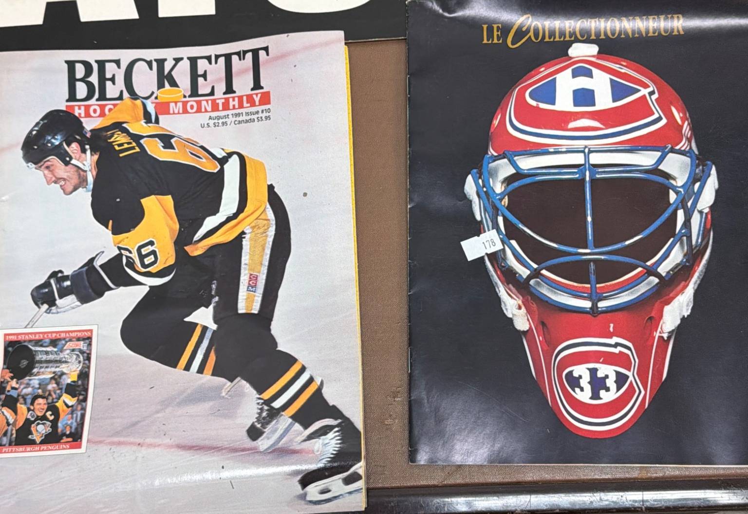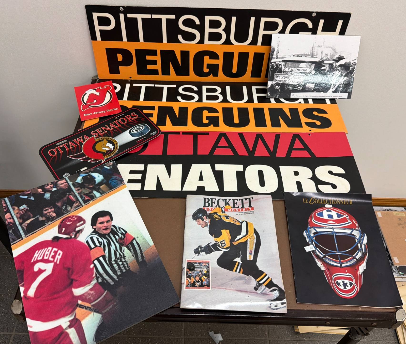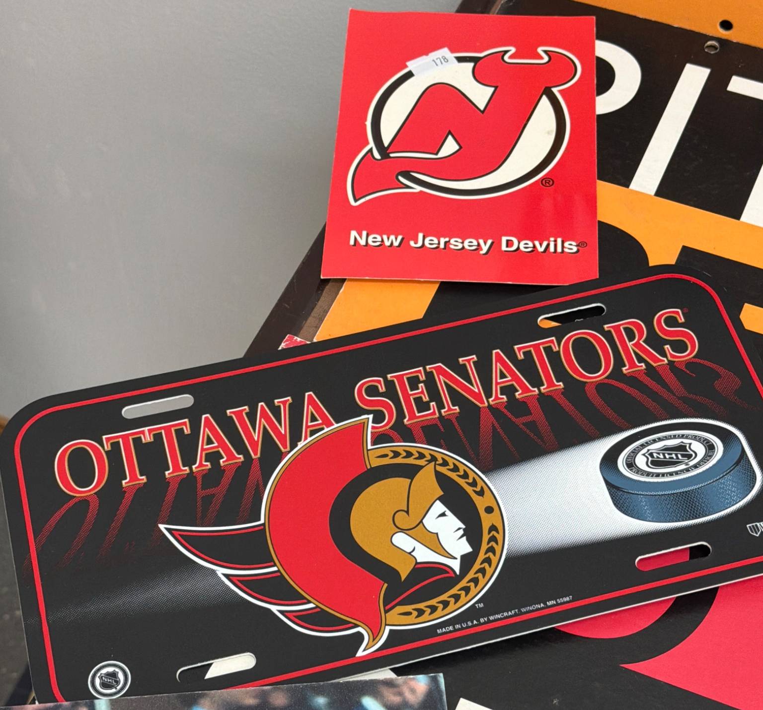 A mixed collection of NHL hockey memorabilia with items from the Pittsburgh Penguins, Ottawa Senators, New Jersey Devils, and others. Features include license plates, posters, magazines such as Beckett Hockey Monthly, and a historical photograph of Ottawa's 1923 Stanley Cup celebration. A great find for hockey enthusiasts and collectors alike.