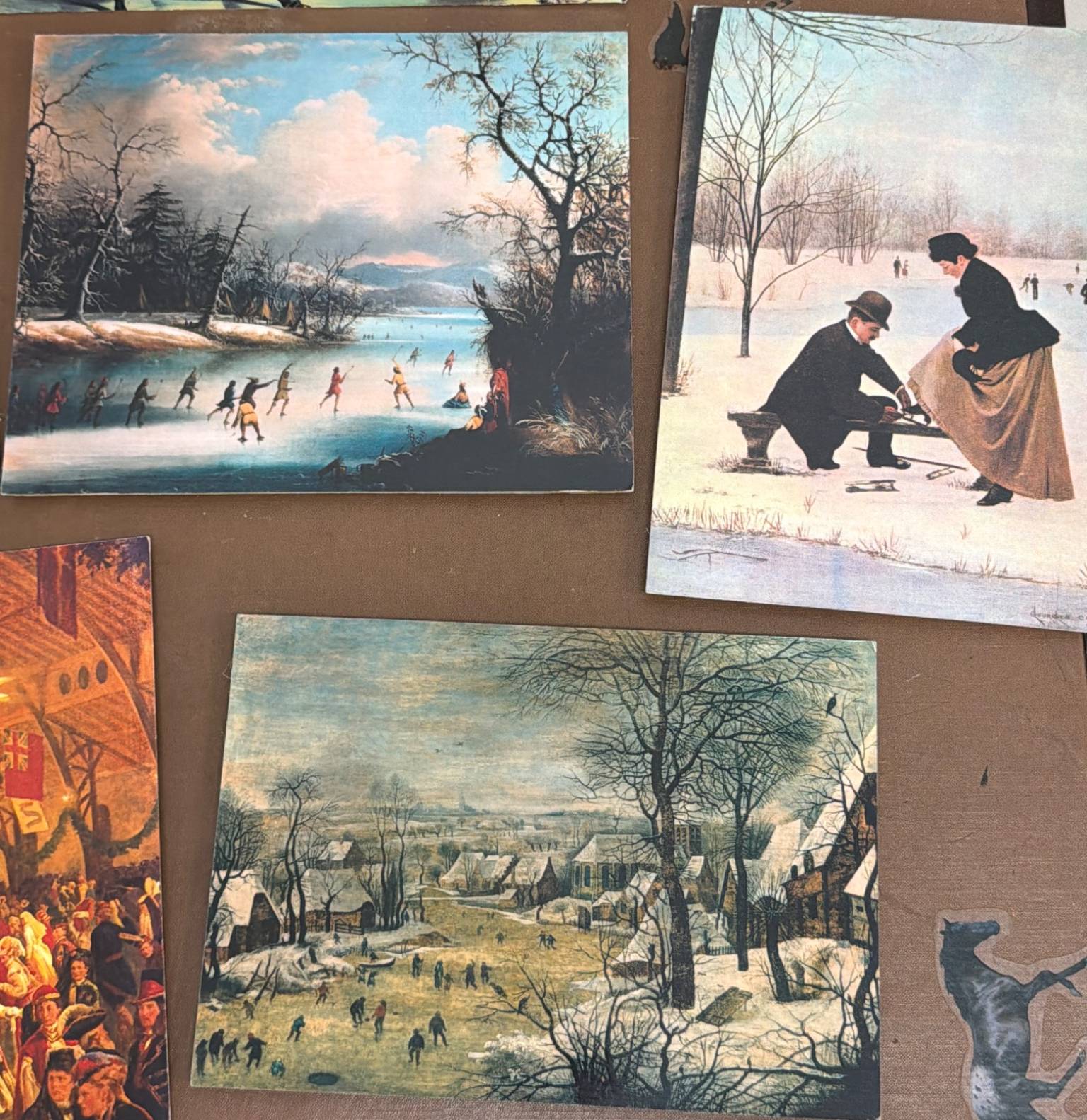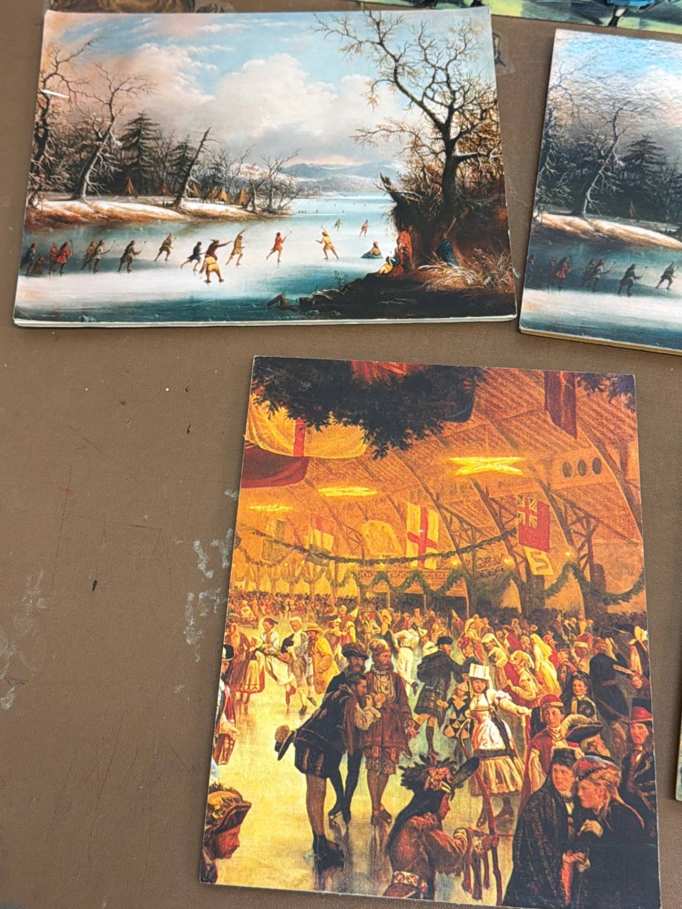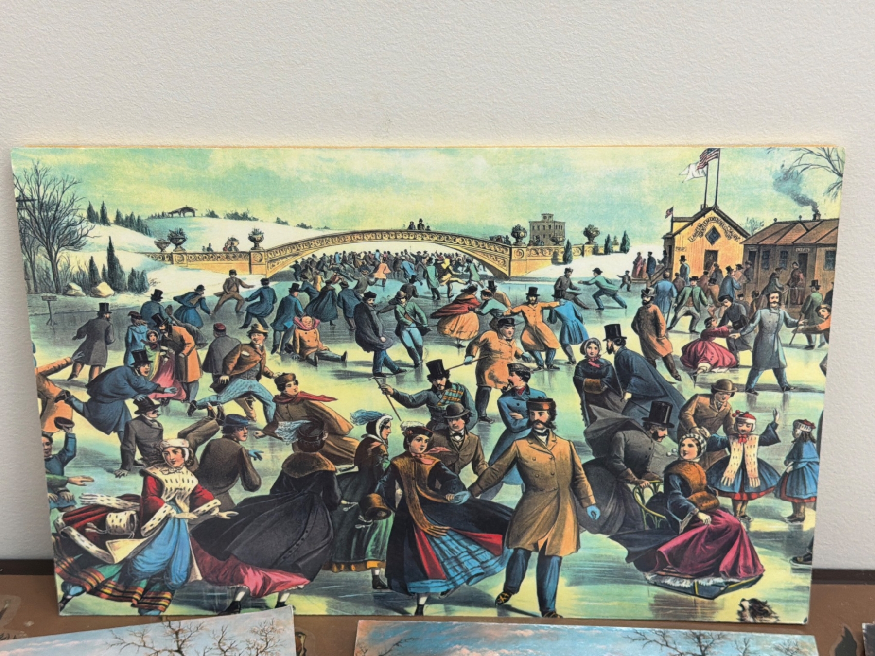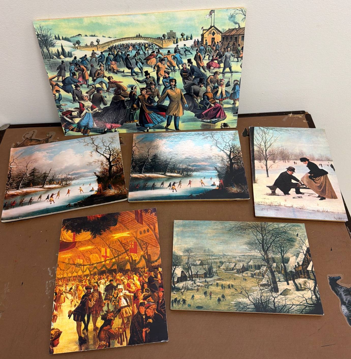 Five painted scenes capturing vivid historical ice-skating and winter activities, including depictions of period-dressed figures and annotated back descriptions. The scenes suggest cultural significance and detailed artistry, making them an engaging collectible item for those intrigued by winter sports or historical art. Condition and dimensions are not specified.
