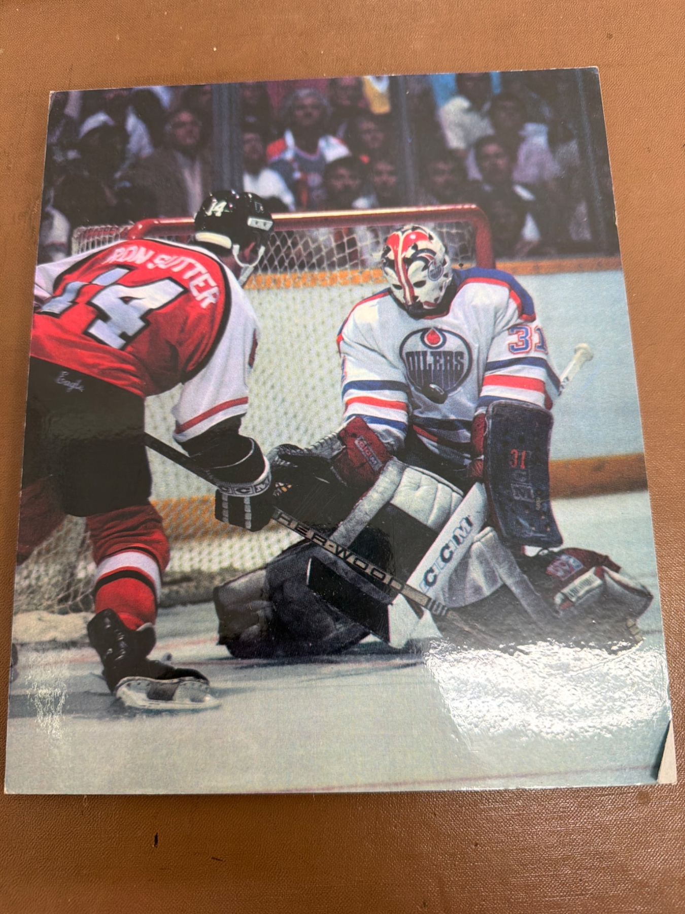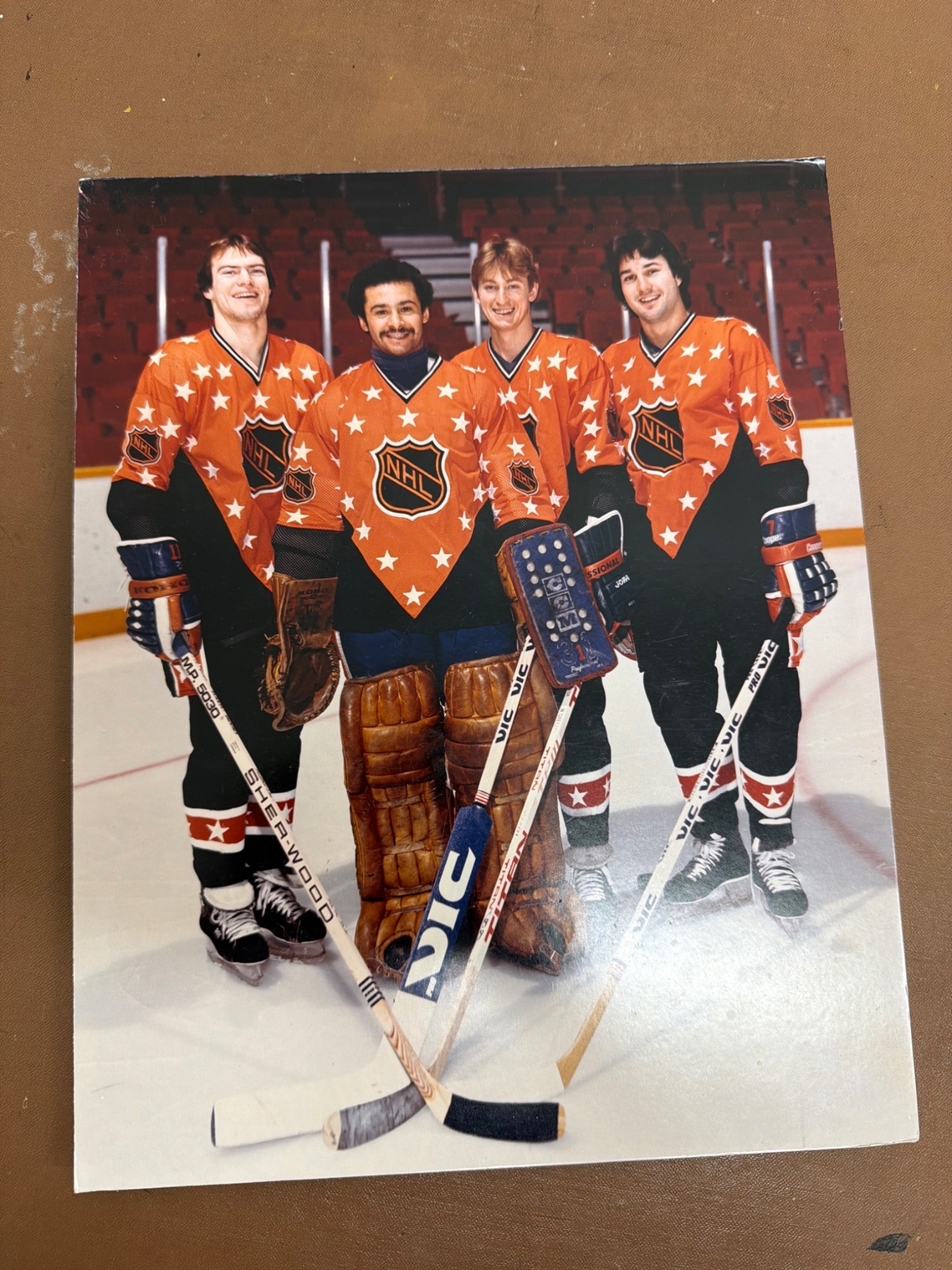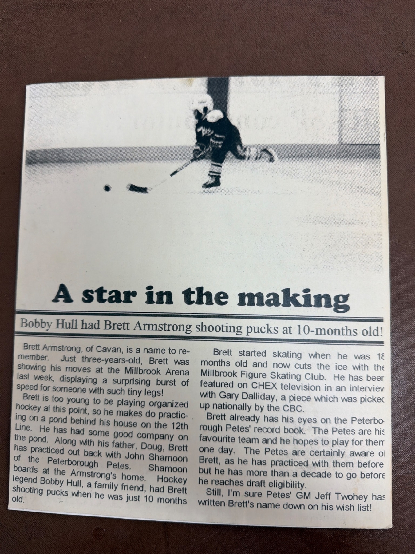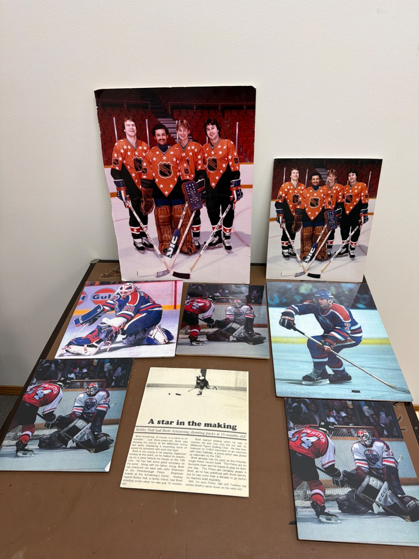 Hockey memorabilia including team photographs of players in distinctive NHL jerseys, action shots from gameplay, and a news article titled 'A Star in the Making', highlighting Brett Armstrong's hockey career. Items include laminated or glossed images, offering durable and vibrant visuals. A unique collection appealing to hockey fans and sports history enthusiasts.
