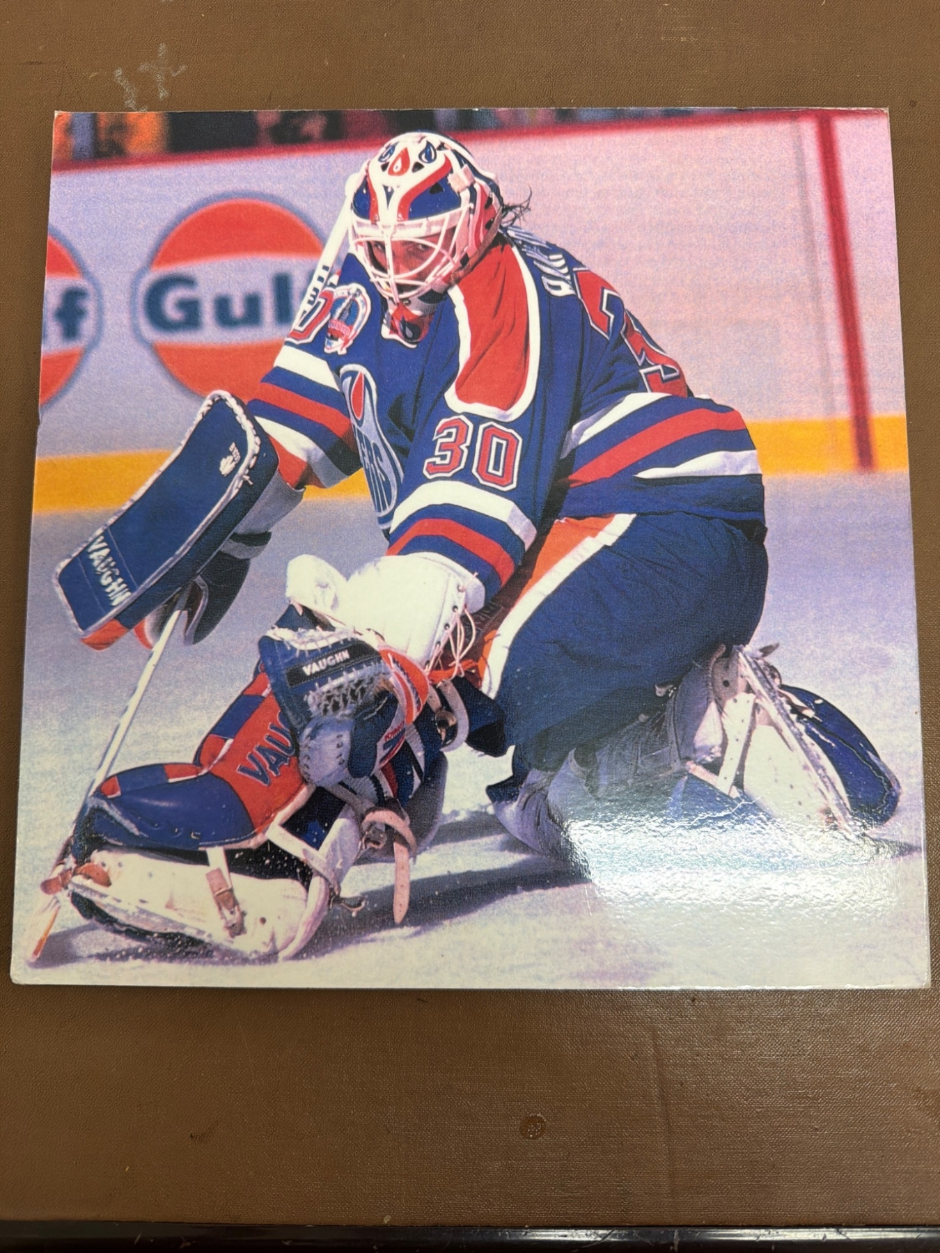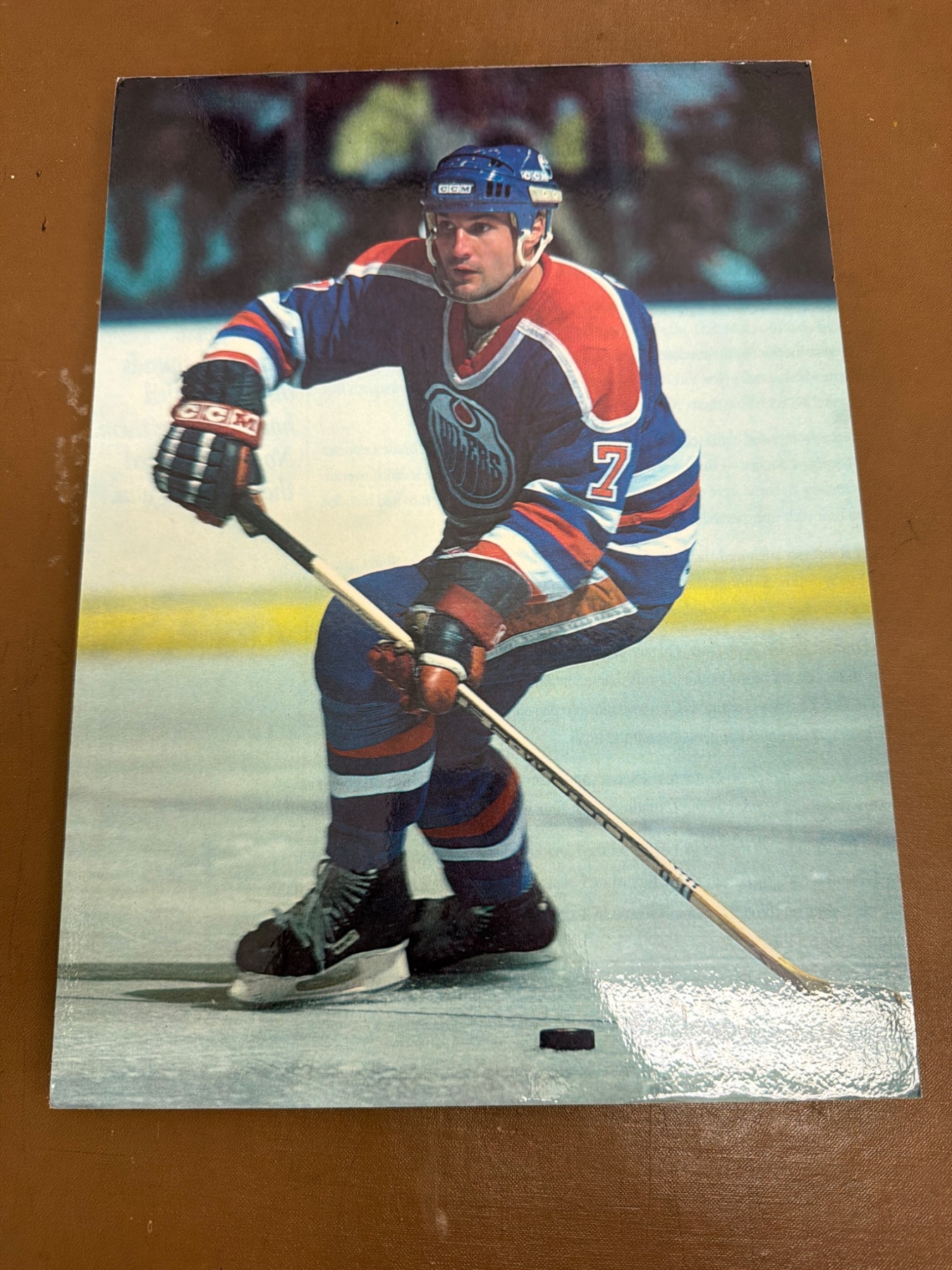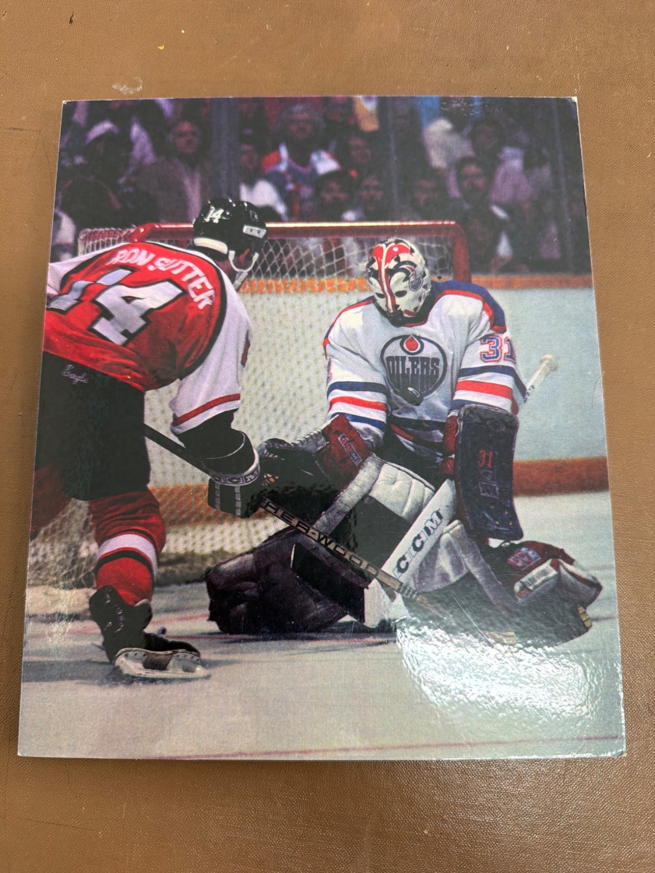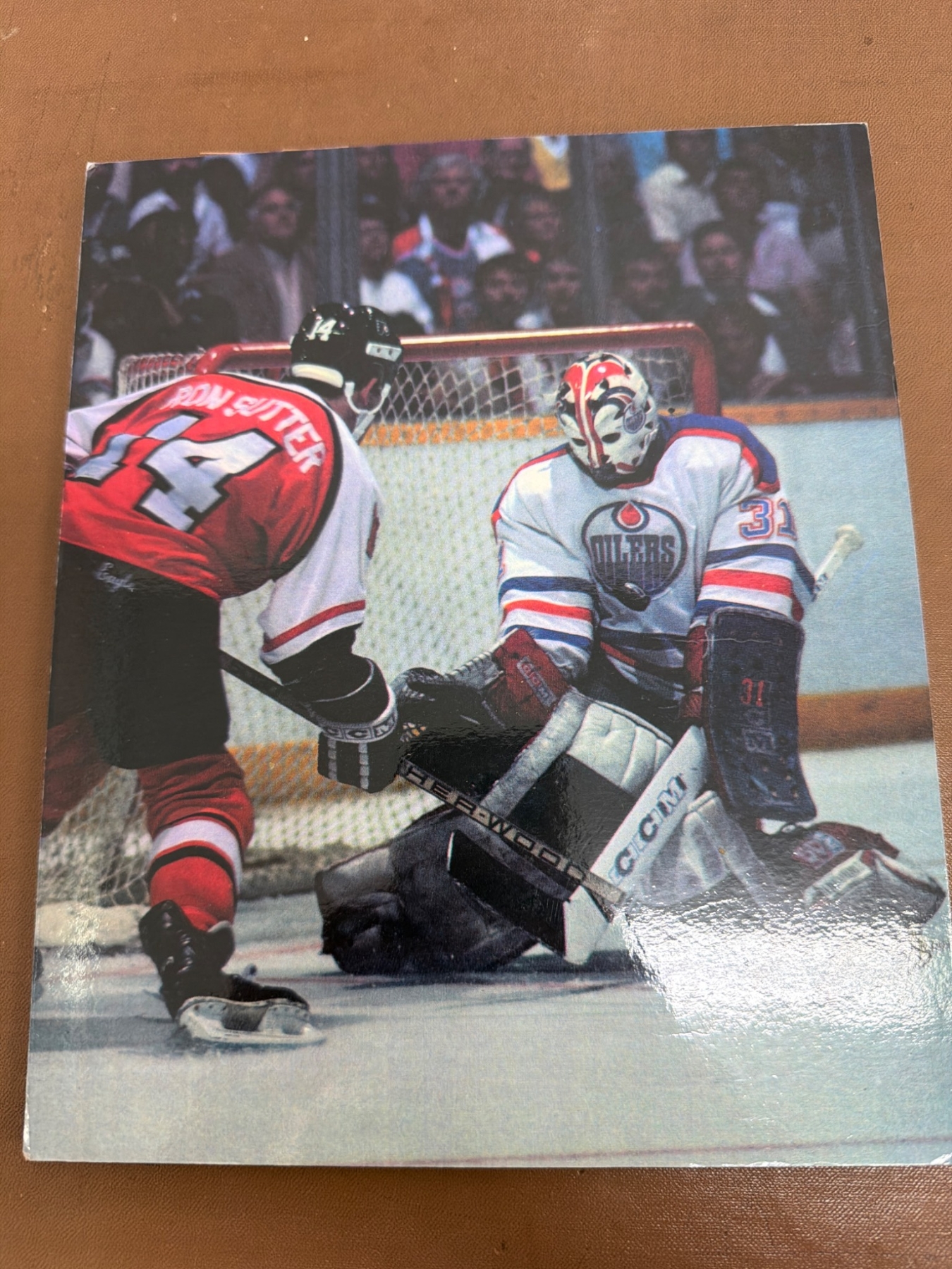 Hockey memorabilia including team photographs of players in distinctive NHL jerseys, action shots from gameplay, and a news article titled 'A Star in the Making', highlighting Brett Armstrong's hockey career. Items include laminated or glossed images, offering durable and vibrant visuals. A unique collection appealing to hockey fans and sports history enthusiasts.