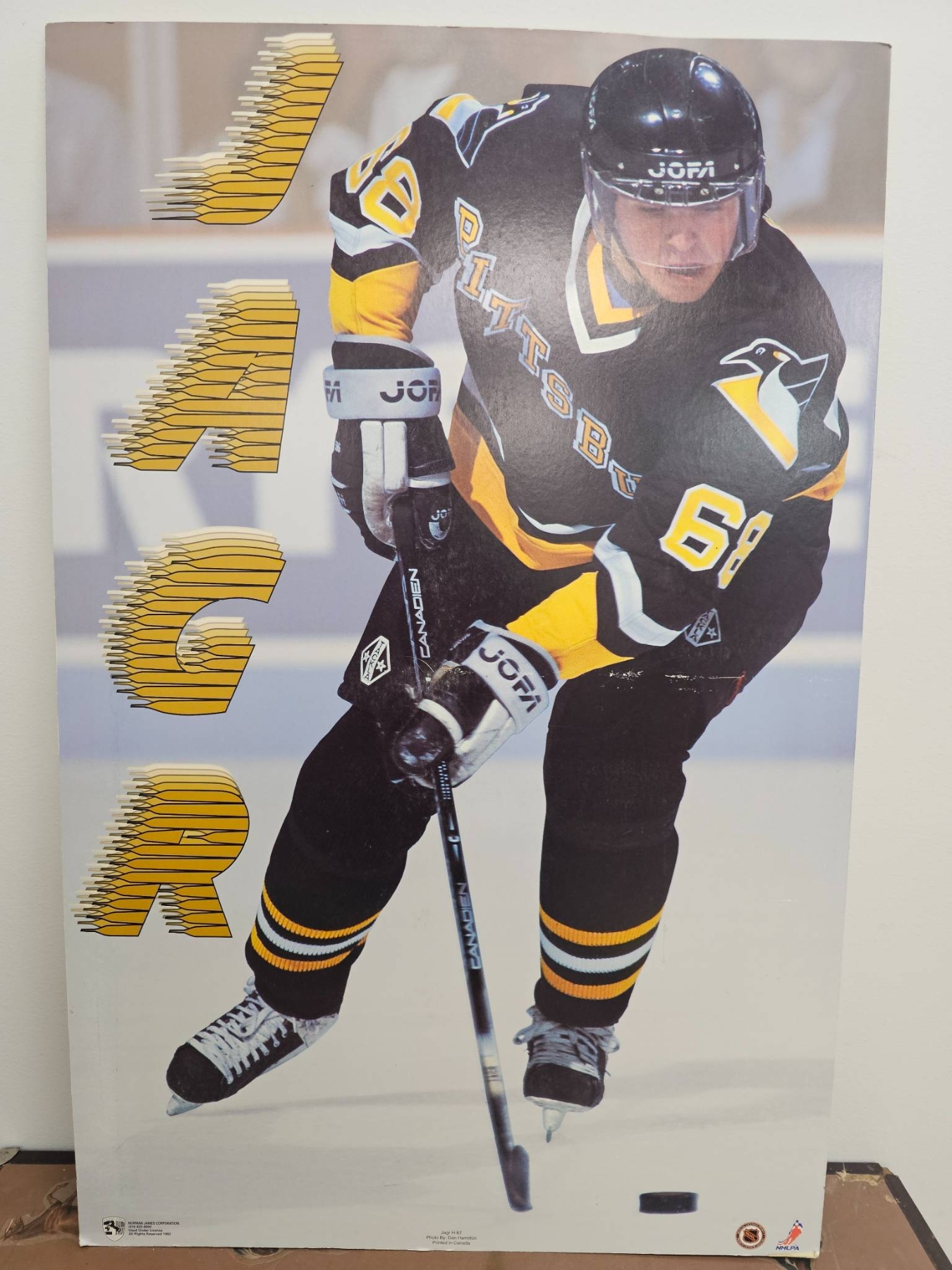 22 x 33 inch poster featuring Jaromir Jagr in action wearing his Pittsburgh Penguins jersey. A bold, dynamic design highlights Jagr's name along the side, making it a standout item for hockey fans or collectors. Ideal for framing or display, it would appeal to enthusiasts of NHL history or memorabilia.