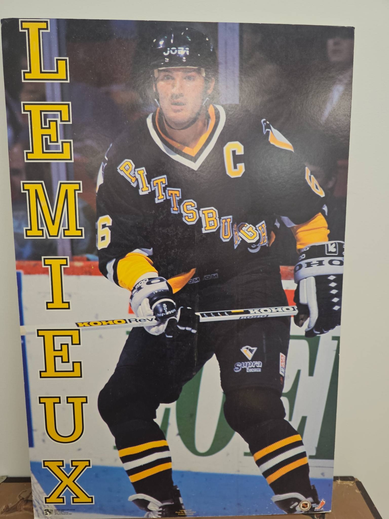 Large poster featuring hockey legend Mario Lemieux in his Pittsburgh Penguins uniform. Measuring 22 inches wide by 33 inches tall, it showcases detailed imagery of Lemieux in action. Perfect for fans of Lemieux or collectors of sports memorabilia. It would make a standout addition to any sports room or memorabilia collection.