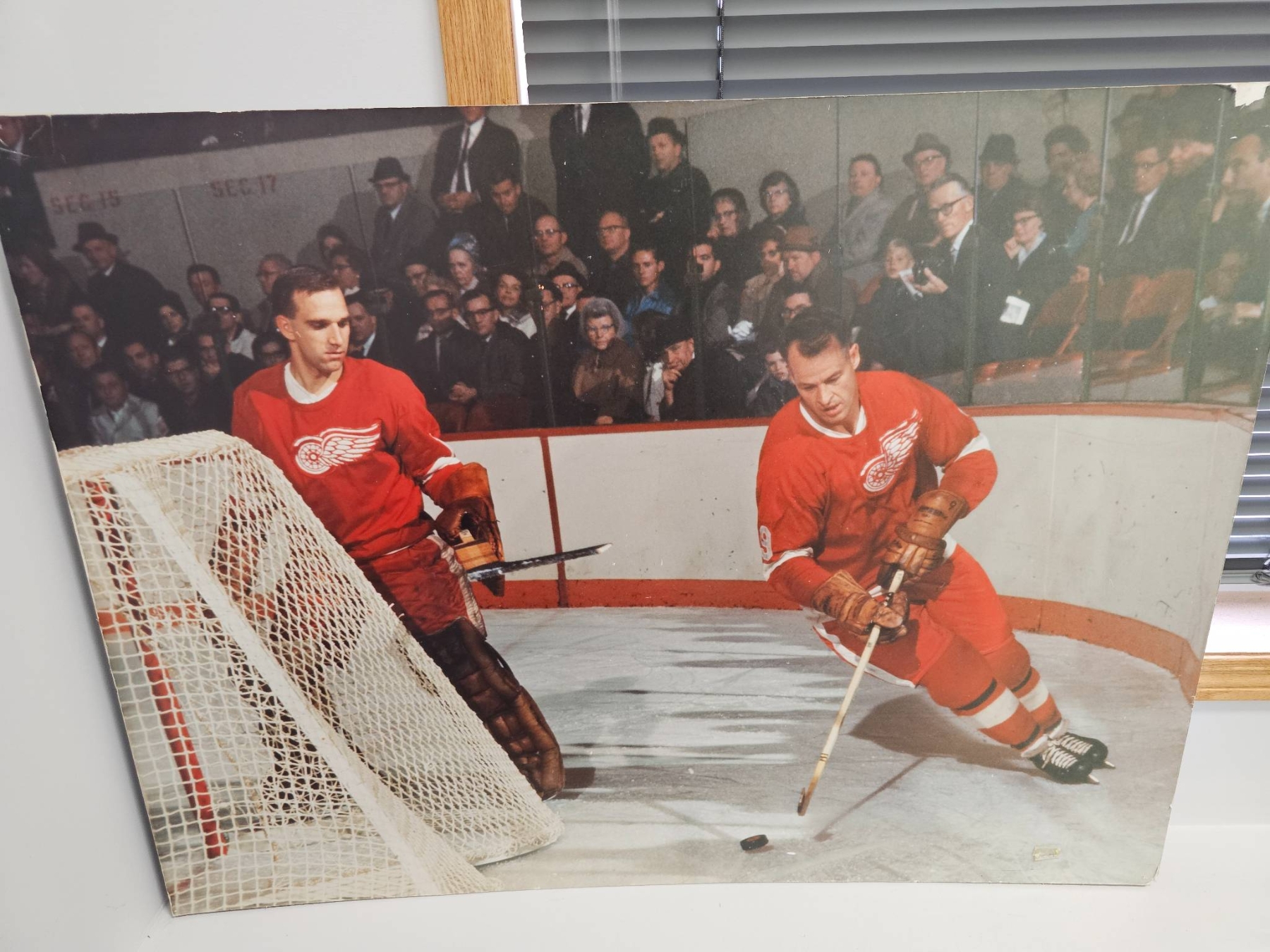 Large wall art capturing an iconic moment featuring two Detroit Red Wings players in action on the ice. This colorful print measures 40 inches in width and 30 inches in height, making it a striking decorative piece for hockey enthusiasts or fans of the Red Wings. Perfect for a sports-themed room or memorabilia collection.