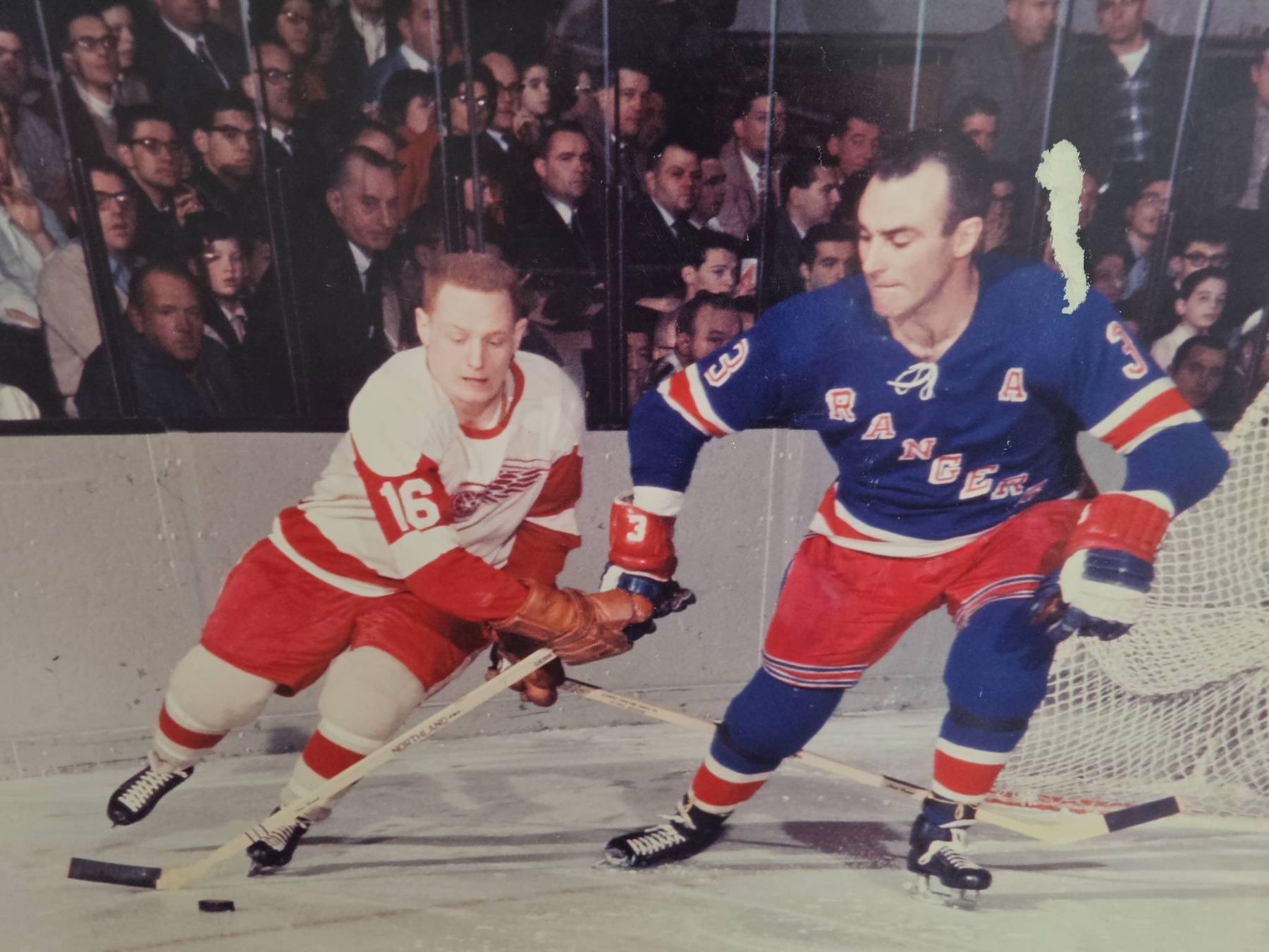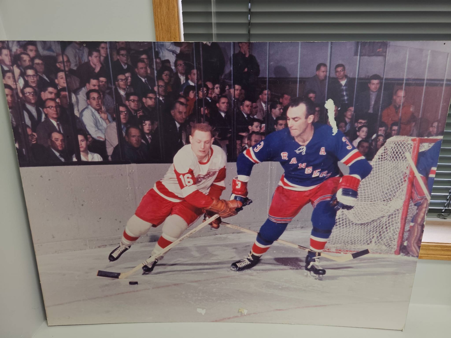 Large 40x30 photo capturing intense NHL action between two iconic teams, the Detroit Red Wings and New York Rangers. Prints like this celebrate historic hockey moments and serve as striking decor for hockey fans and collectors. The condition shows slight wear, adding to its vintage appeal. A great addition for sports enthusiasts or as a conversation starter.