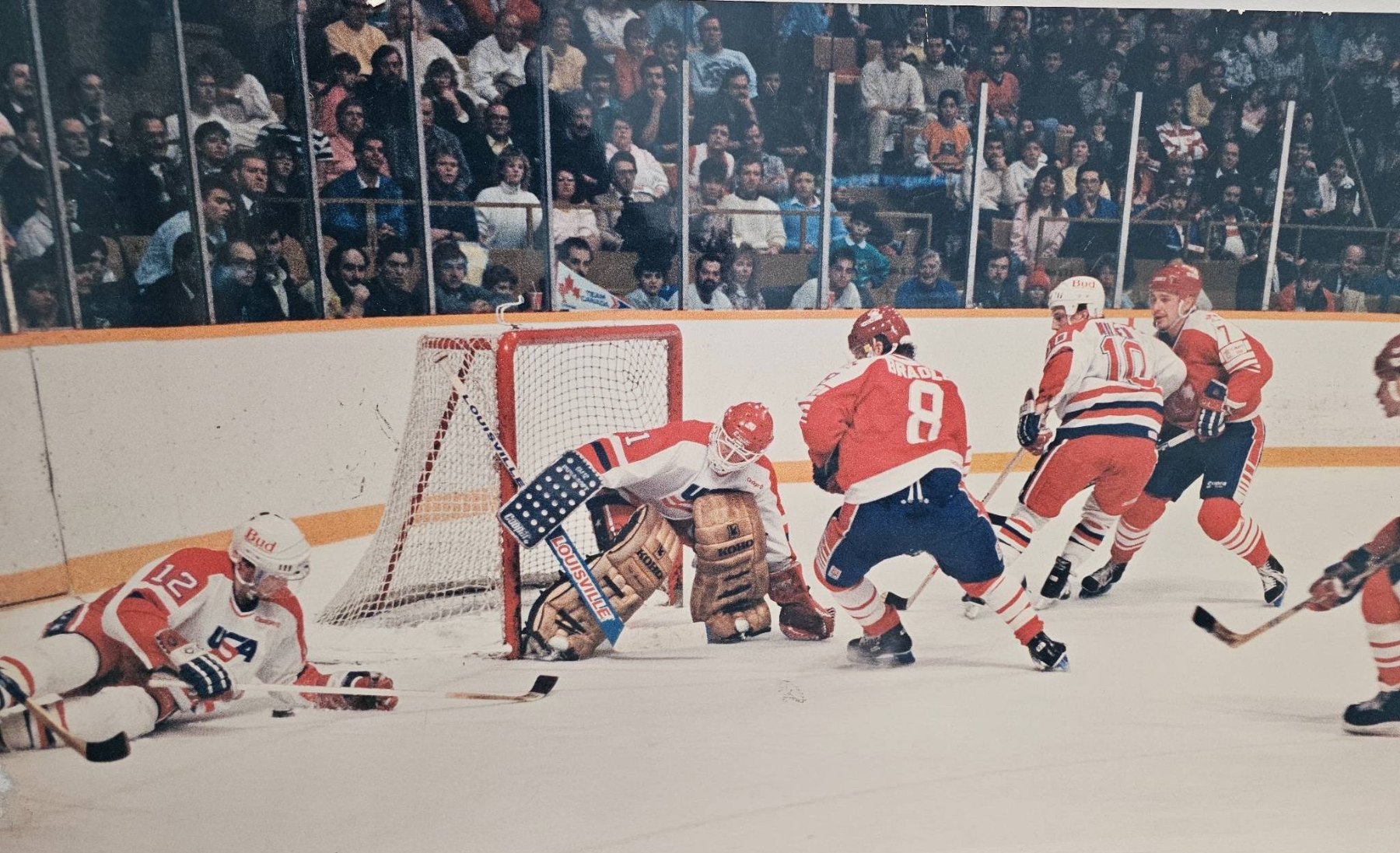 A canvas print measuring 36 inches in width and 21 inches in height showcasing an action-packed hockey game scene. This dynamic composition captures players mid-game, vividly portraying the intensity and energy of the moment. Perfect for hockey enthusiasts or sports decor collectors seeking a visually striking piece. Condition appears good with imagery remaining sharp and vibrant.