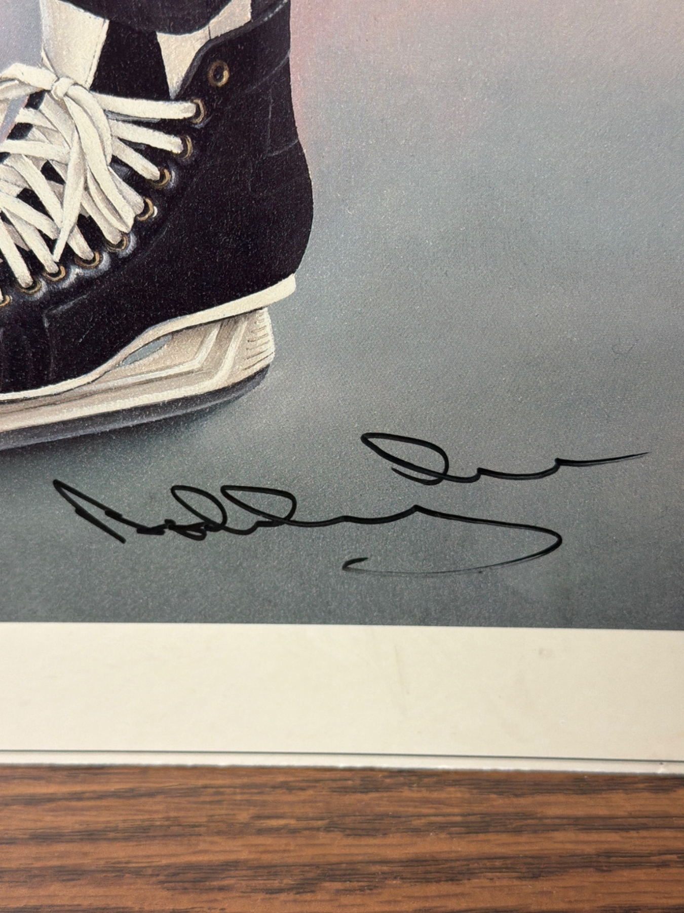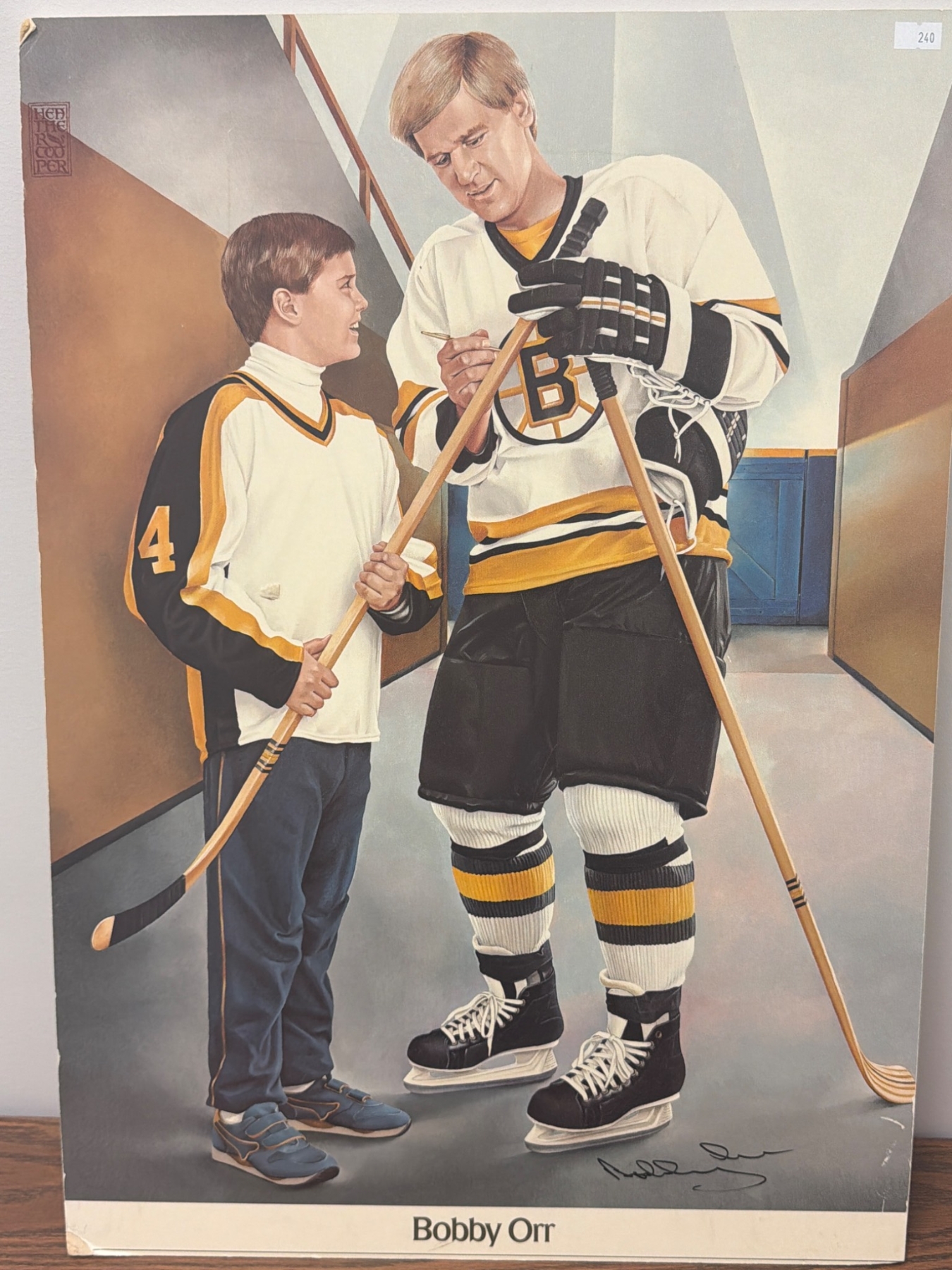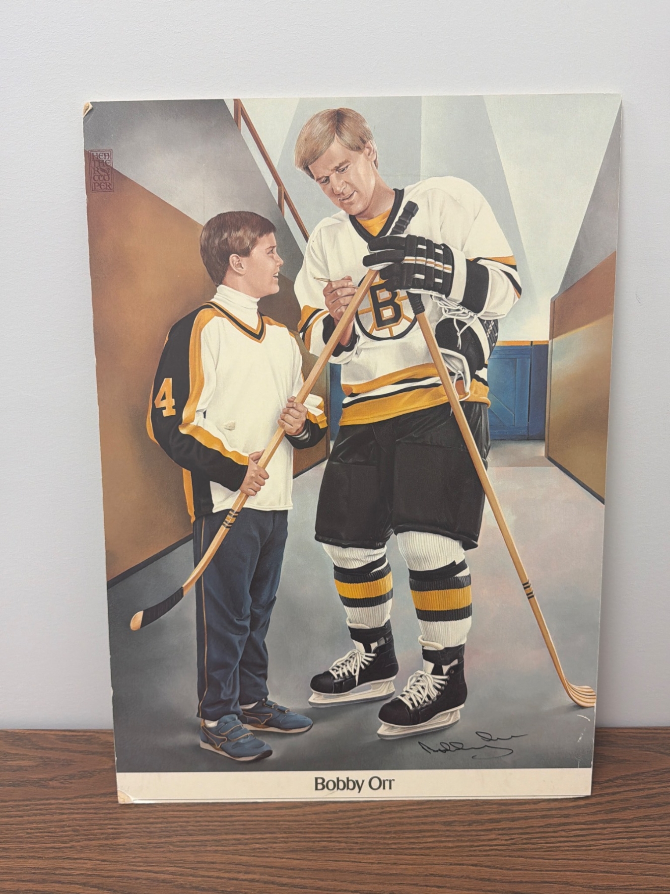 18" x 25" print featuring NHL legend Bobby Orr, depicted in full Boston Bruins gear with a young fan. Includes Bobby Orr's autograph in bold script near the bottom. The print is ideal for hockey fans or collectors of sports memorabilia. Condition appears good with no visible major damage, making this piece ready for display.