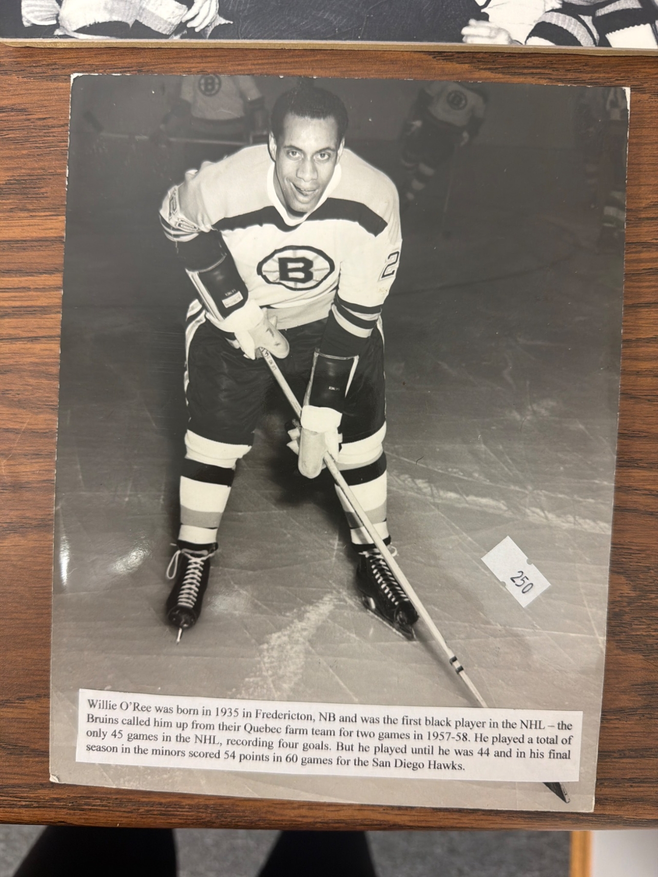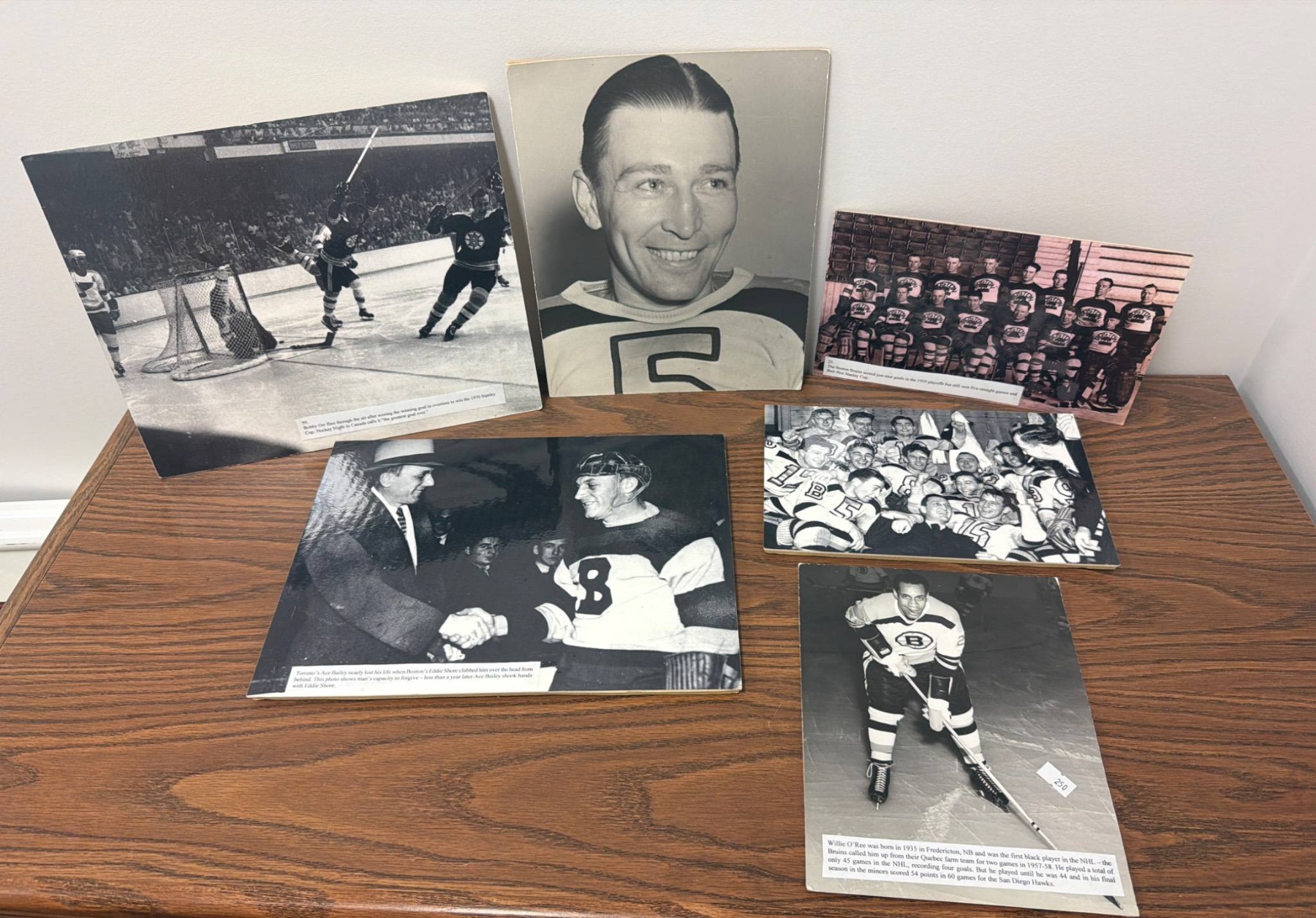 Seven vintage black-and-white photographs showcasing key historical moments and players of the Boston Bruins. Includes team shots, action scenes, and individual player highlights, such as Willie O'Ree, the NHL's first Black player. Captions on some photos provide context to their historical significance. Great for hockey enthusiasts or collectors of Bruins memorabilia.