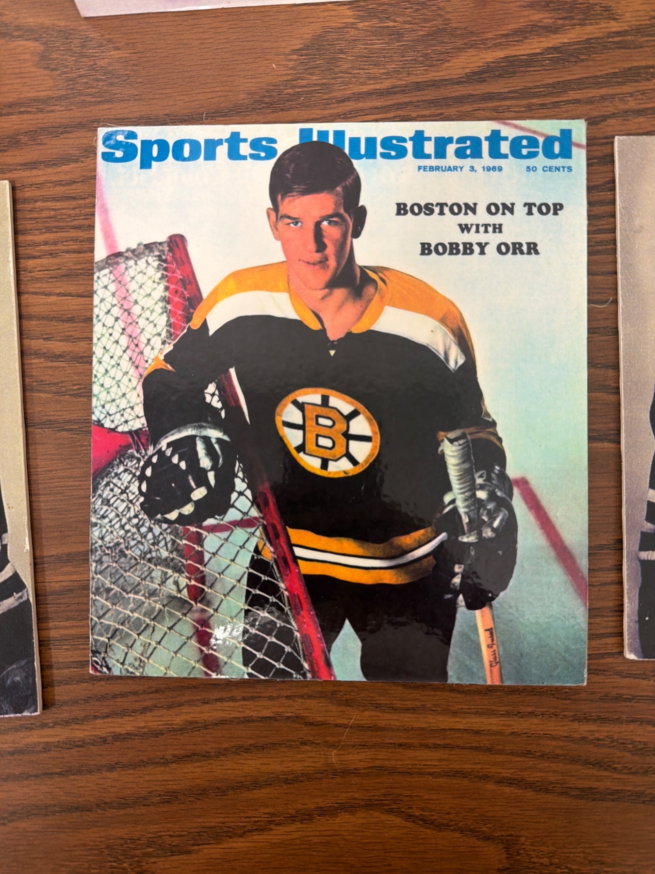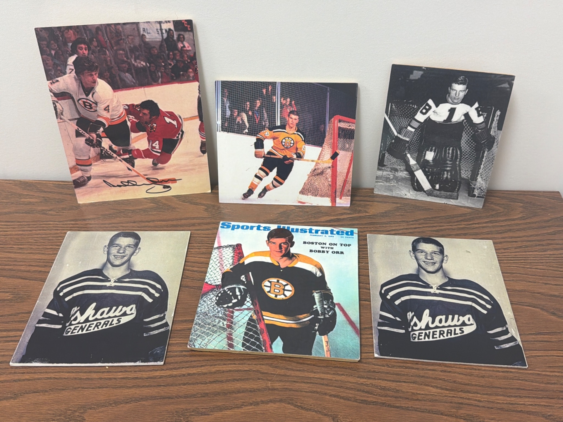 Six items featuring the iconic Boston Bruins and NHL legend Bobby Orr. Includes a signed action photograph, vibrant Sports Illustrated cover (dated February 3, 1969), vintage game pictures, and images from Orr's early career with the Oshawa Generals. Items provide a historical glimpse into Orr's career, celebrating his impact on hockey and the Bruins' legacy. Perfect for fans and collectors.