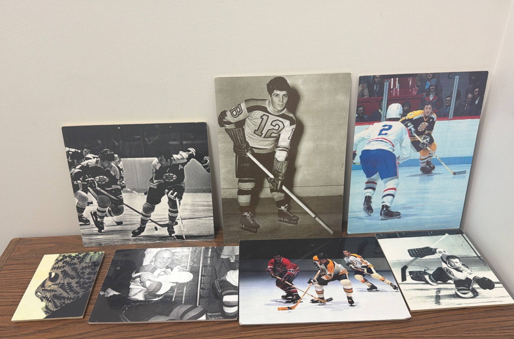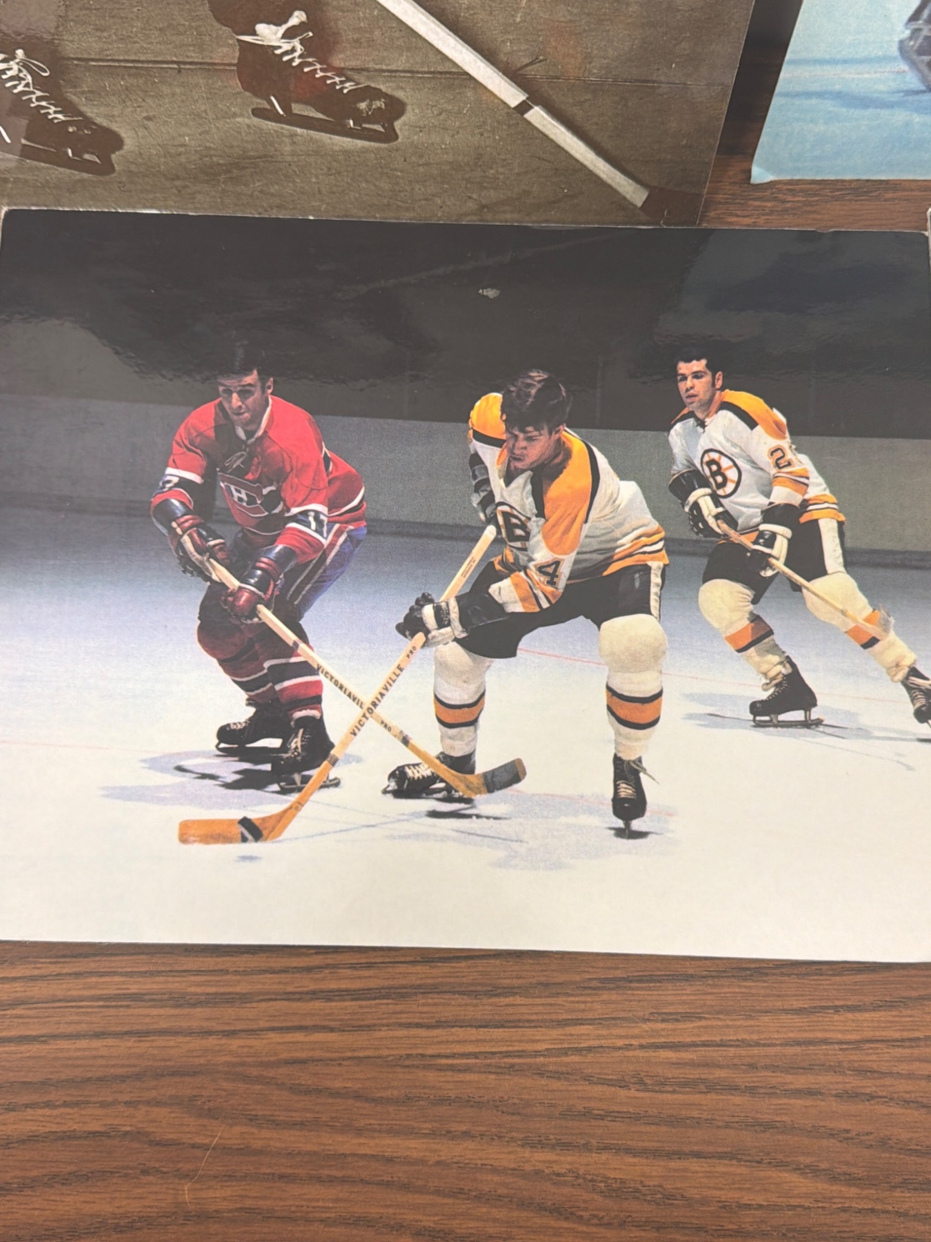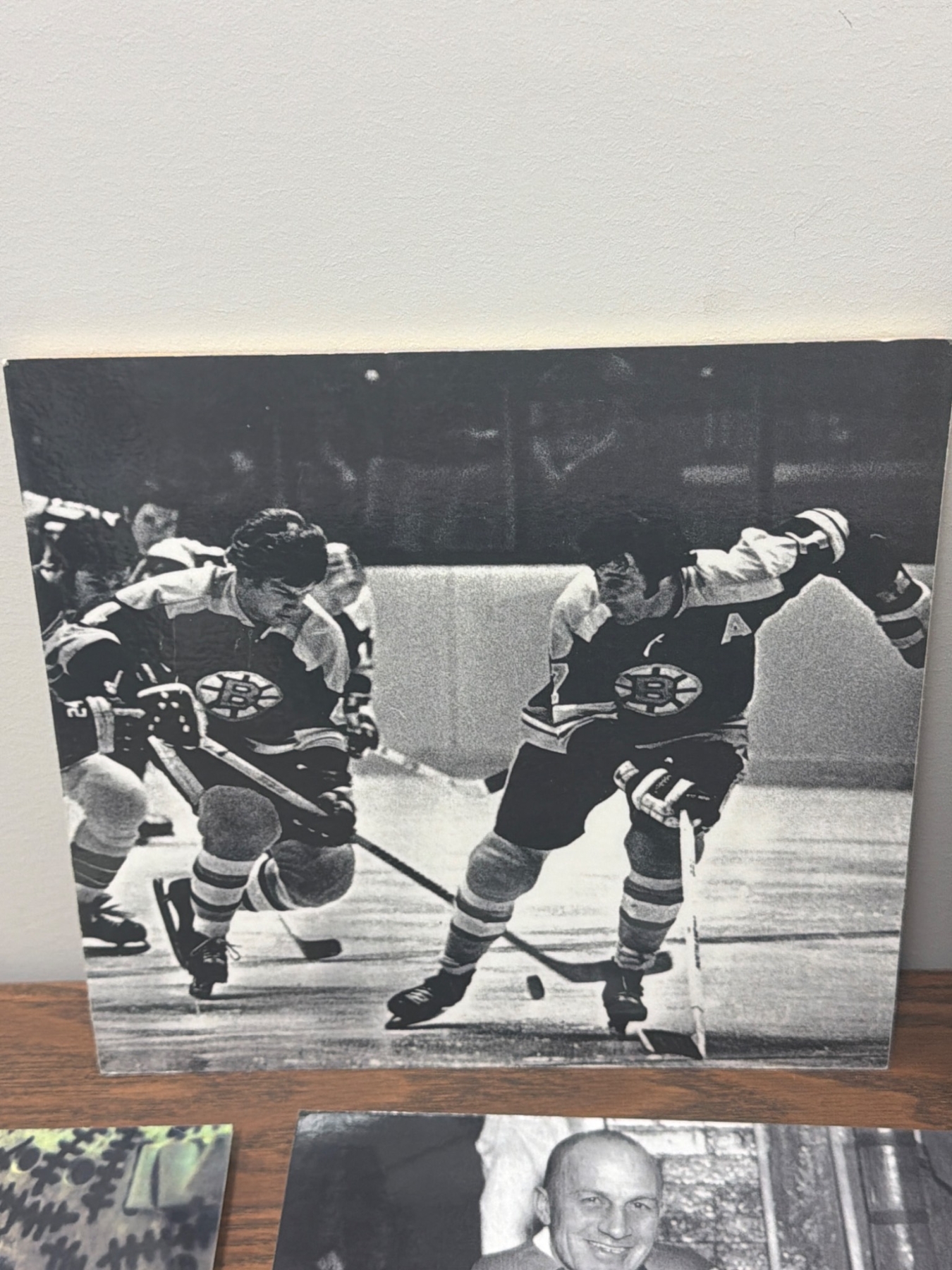 Eight Boston Bruins-themed vintage hockey photographs featuring iconic moments and players. Includes both color and black-and-white prints, showcasing action shots, player portraits, and memorabilia. Ideal for hockey enthusiasts and Bruins fans seeking timeless pieces of the team's history to add to their collection.