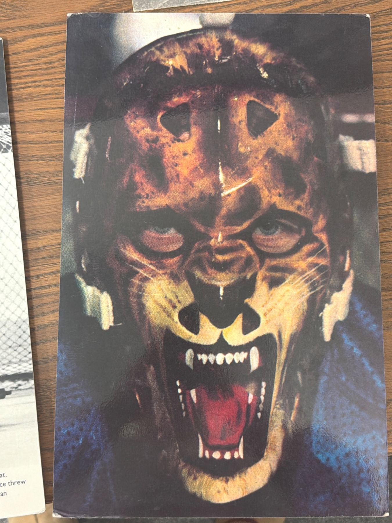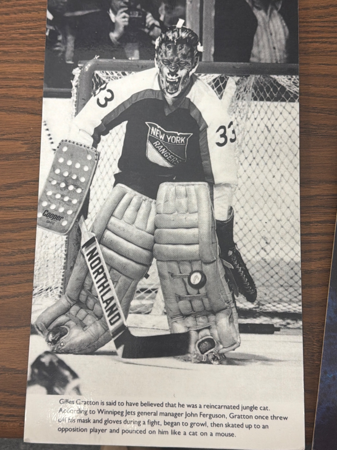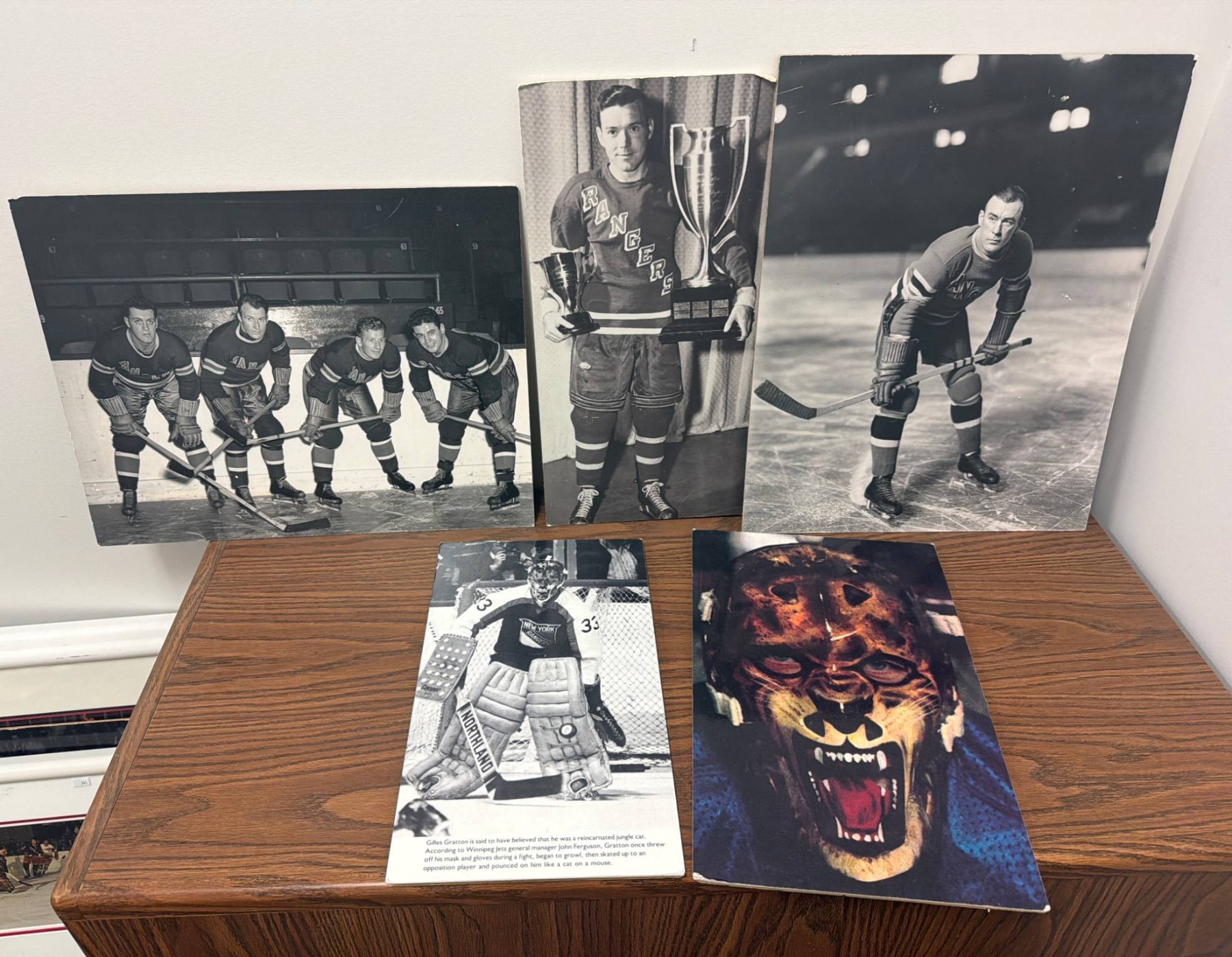 New York Rangers memorabilia featuring black-and-white and color photographs. Highlights include team portraits, individual player shots, and action captures and notably Gilles Gratton with his iconic mask. Some include handwritten notes on the back detailing historical context, like mentions of key defensemen and scoring leaders. Ideal for collectors or fans of Rangers history.