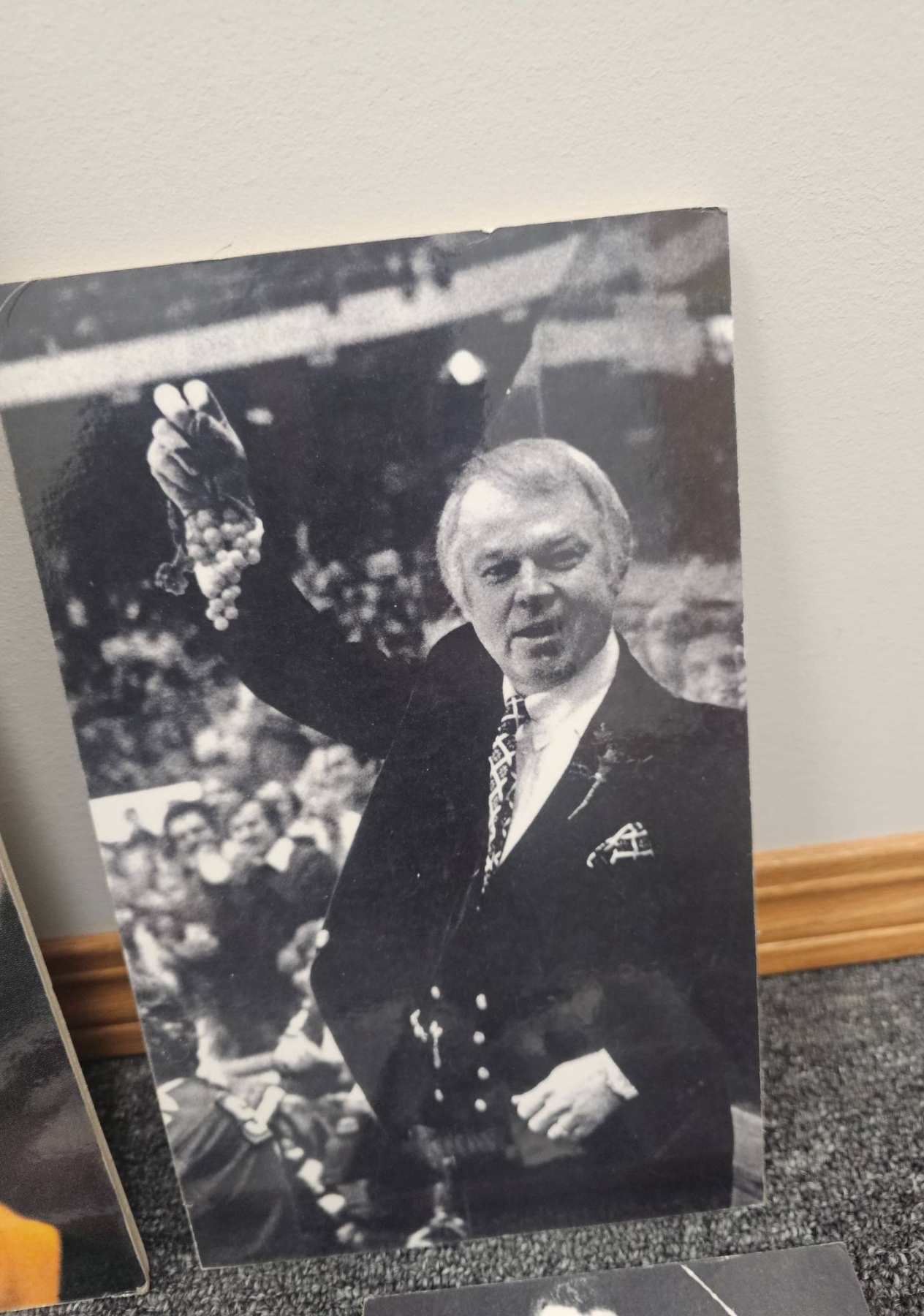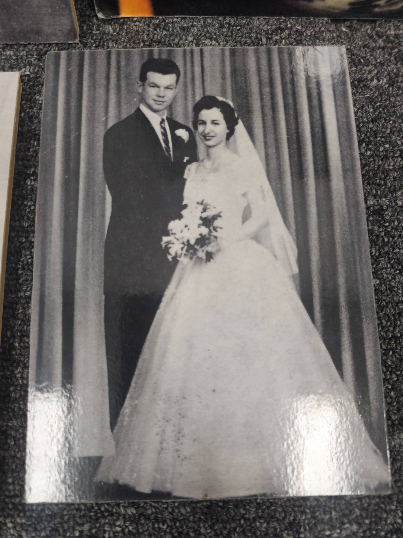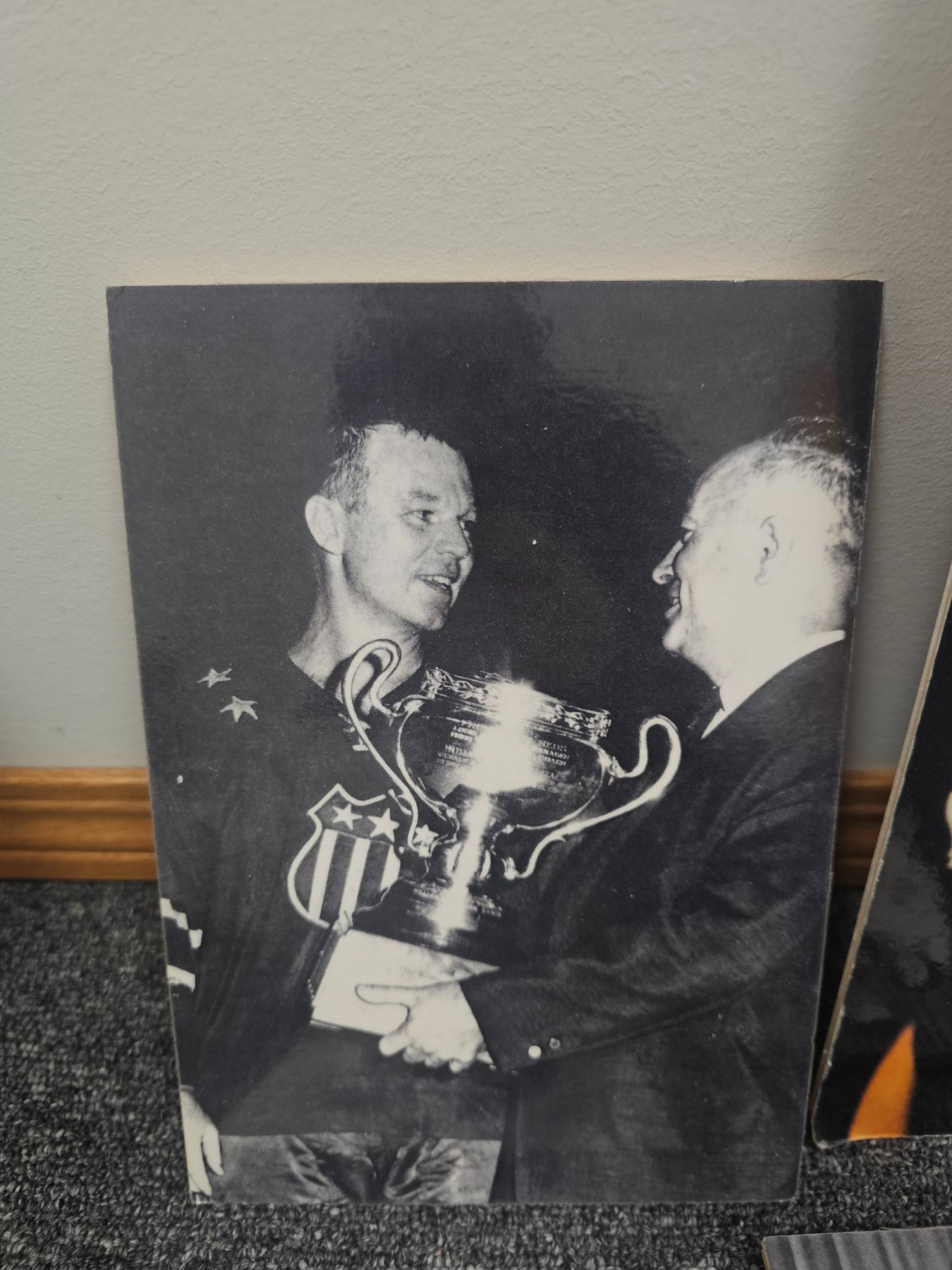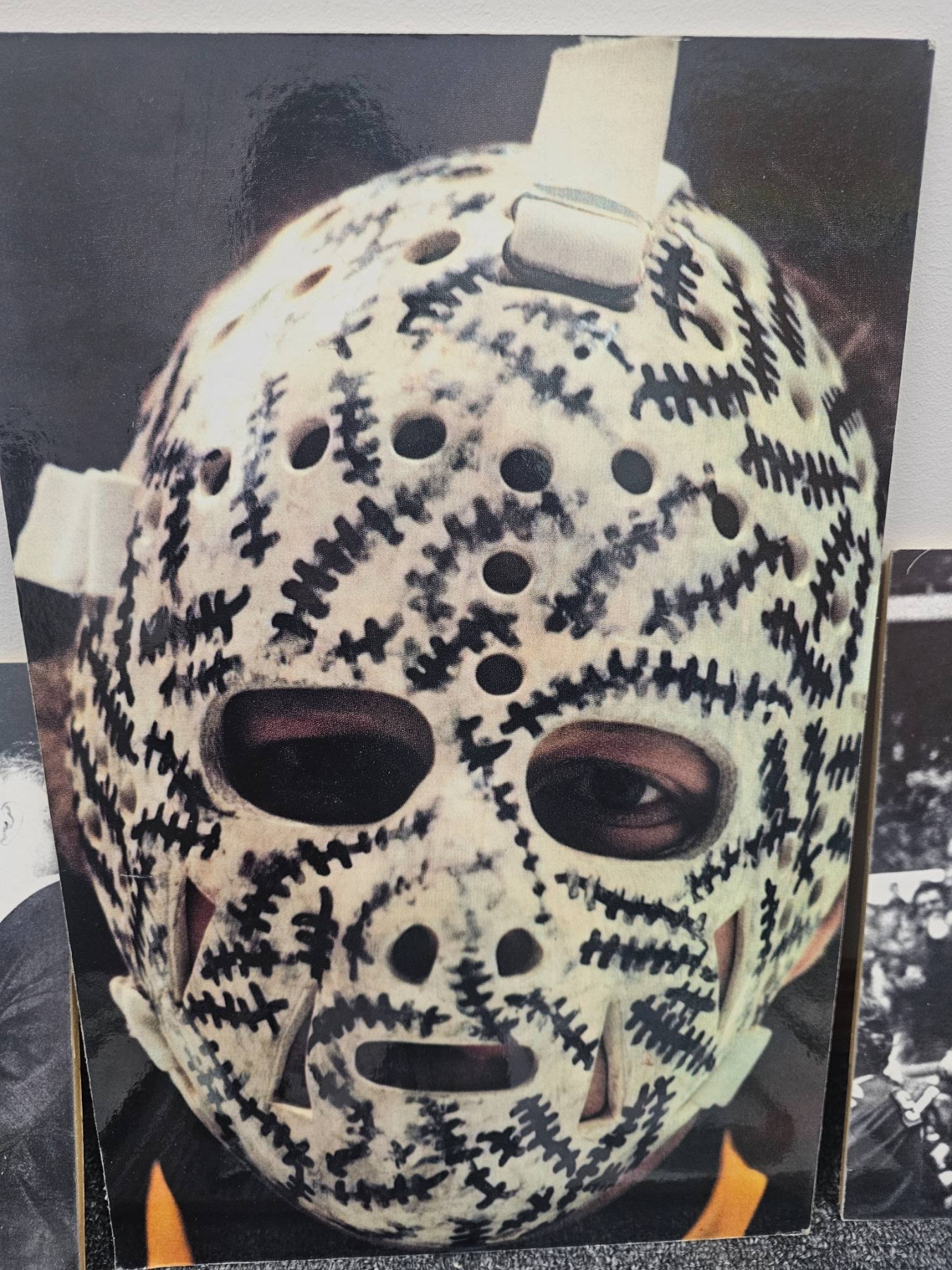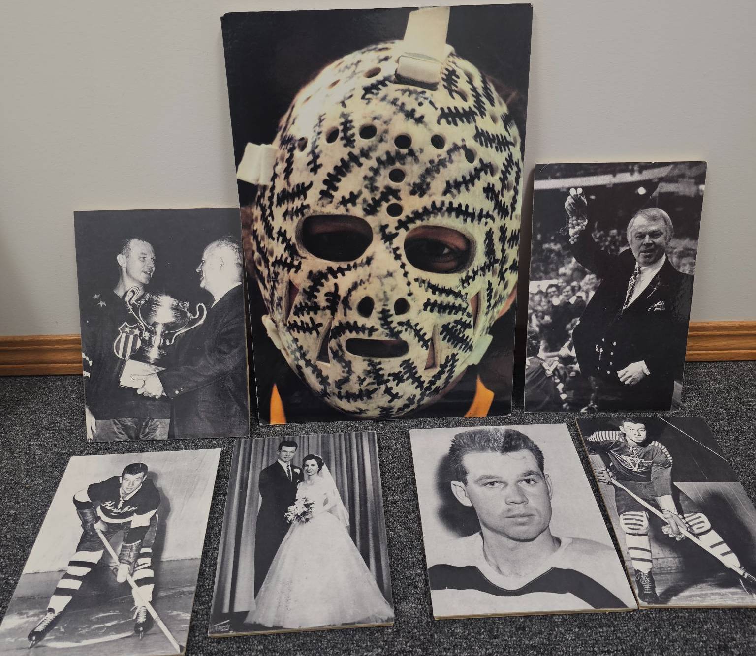 Black-and-white hockey-themed photographs, showcasing historic player portraits, game moments, and trophy celebrations. Includes imagery of players in action, formal portraits, and key moments of hockey history. Photographs are in a mix of sizes and depict significant personalities and events, such as a goalie mask close-up and a couple's wedding photo indicating personal memorabilia. Ideal for hockey fans or collectors.
