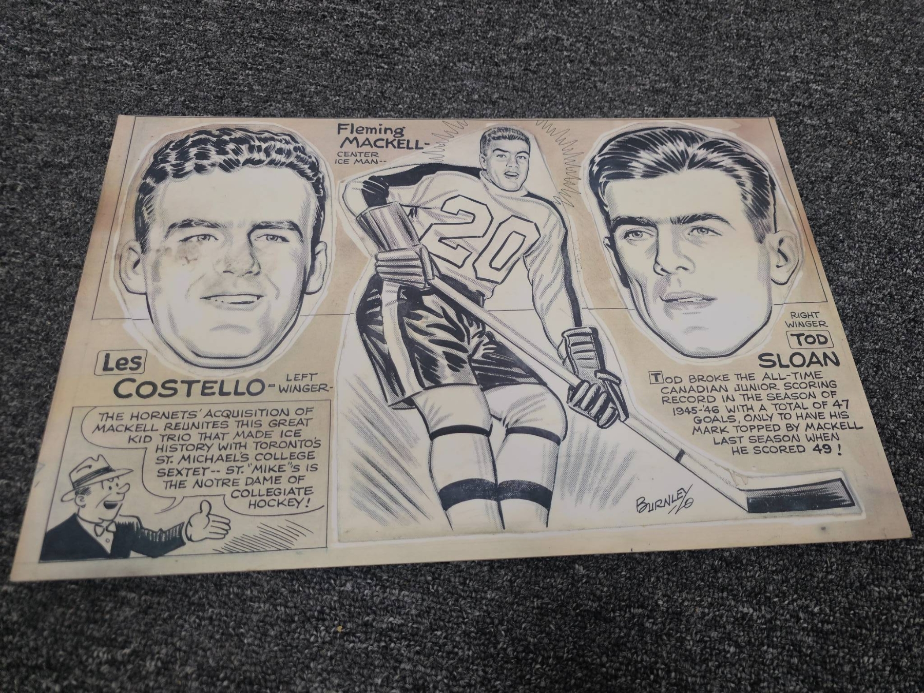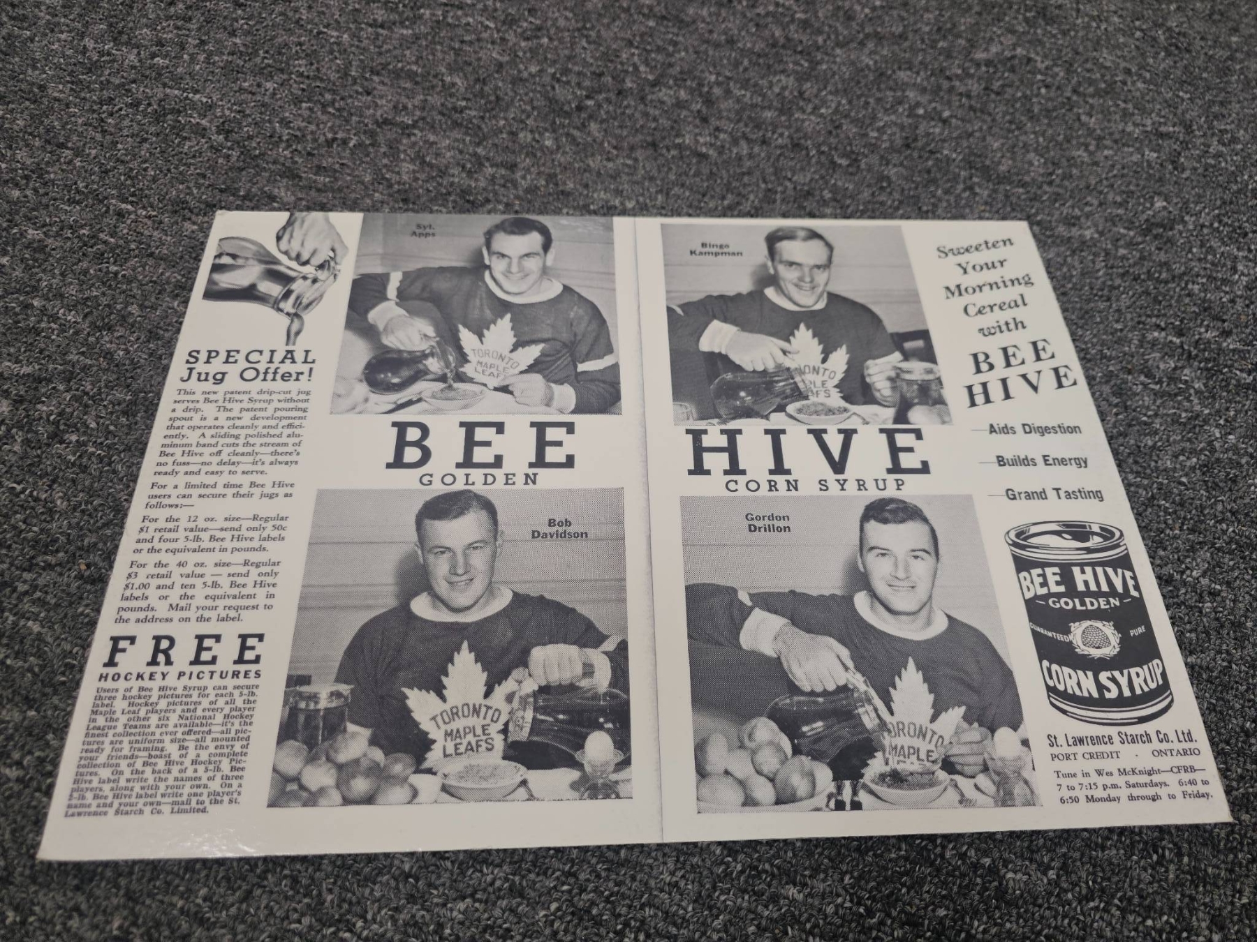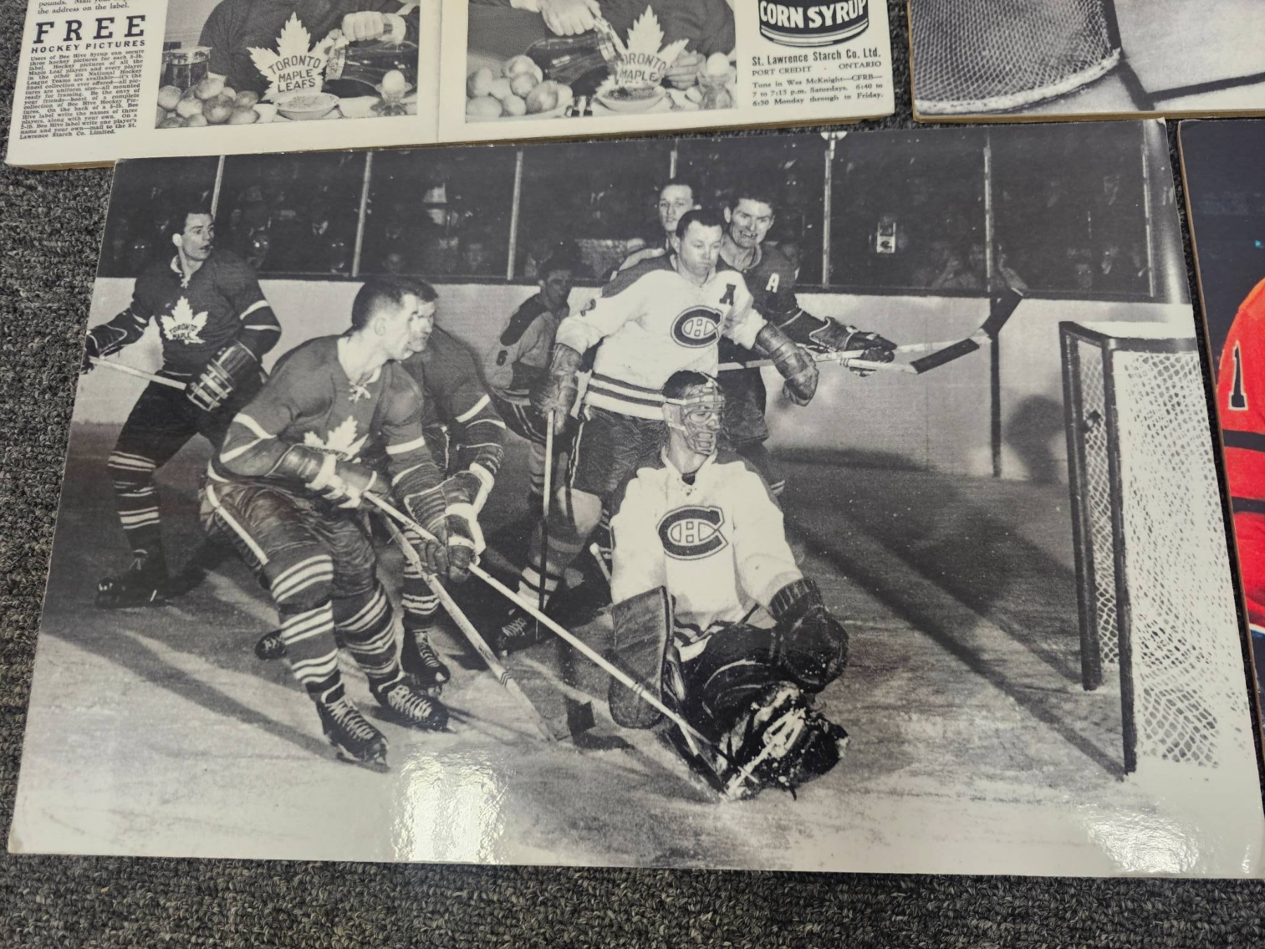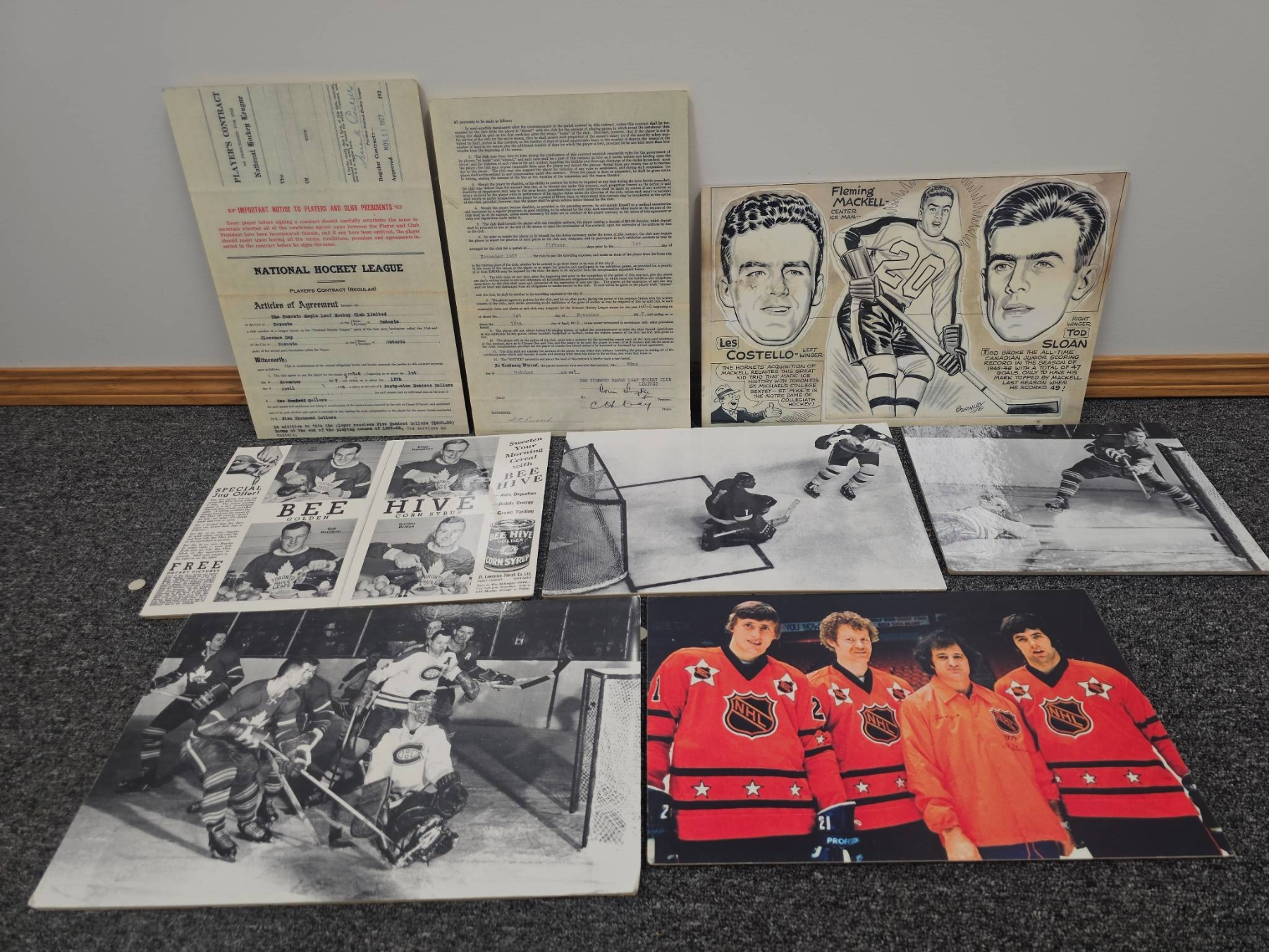 Unique collection of NHL memorabilia comprising vintage team and action photographs, a colorful All-Star team photo, promotional Bee Hive Golden Corn Syrup sheets featuring players, illustrated caricature-style player depictions, and two National Hockey League player contracts signed in the 1950s. A fascinating lot for hockey historians or fans of the game.