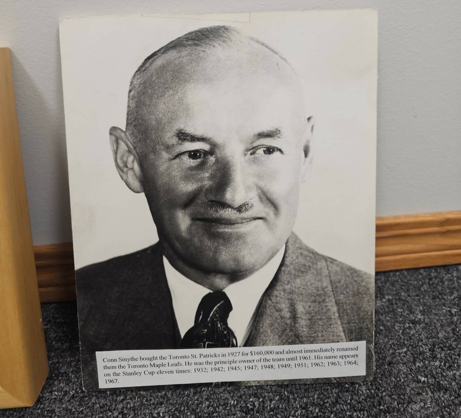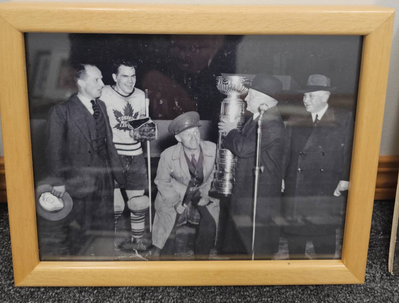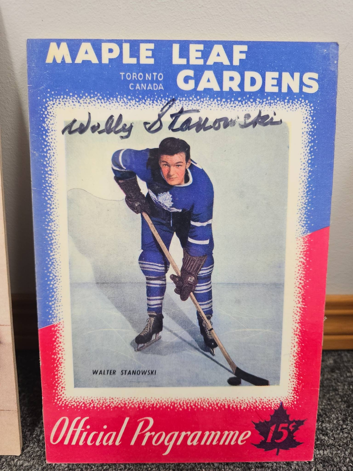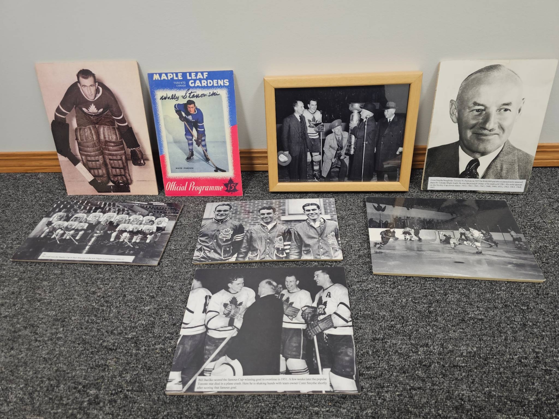 A curated lot featuring Toronto Maple Leafs memorabilia, including historic black-and-white team and match photographs, a framed photograph with the Stanley Cup, a Maple Leaf Gardens official program autographed by Walter Stanowski, and portraits of key figures associated with the team. An excellent collection for hockey enthusiasts or collectors seeking authentic vintage Maple Leafs items.