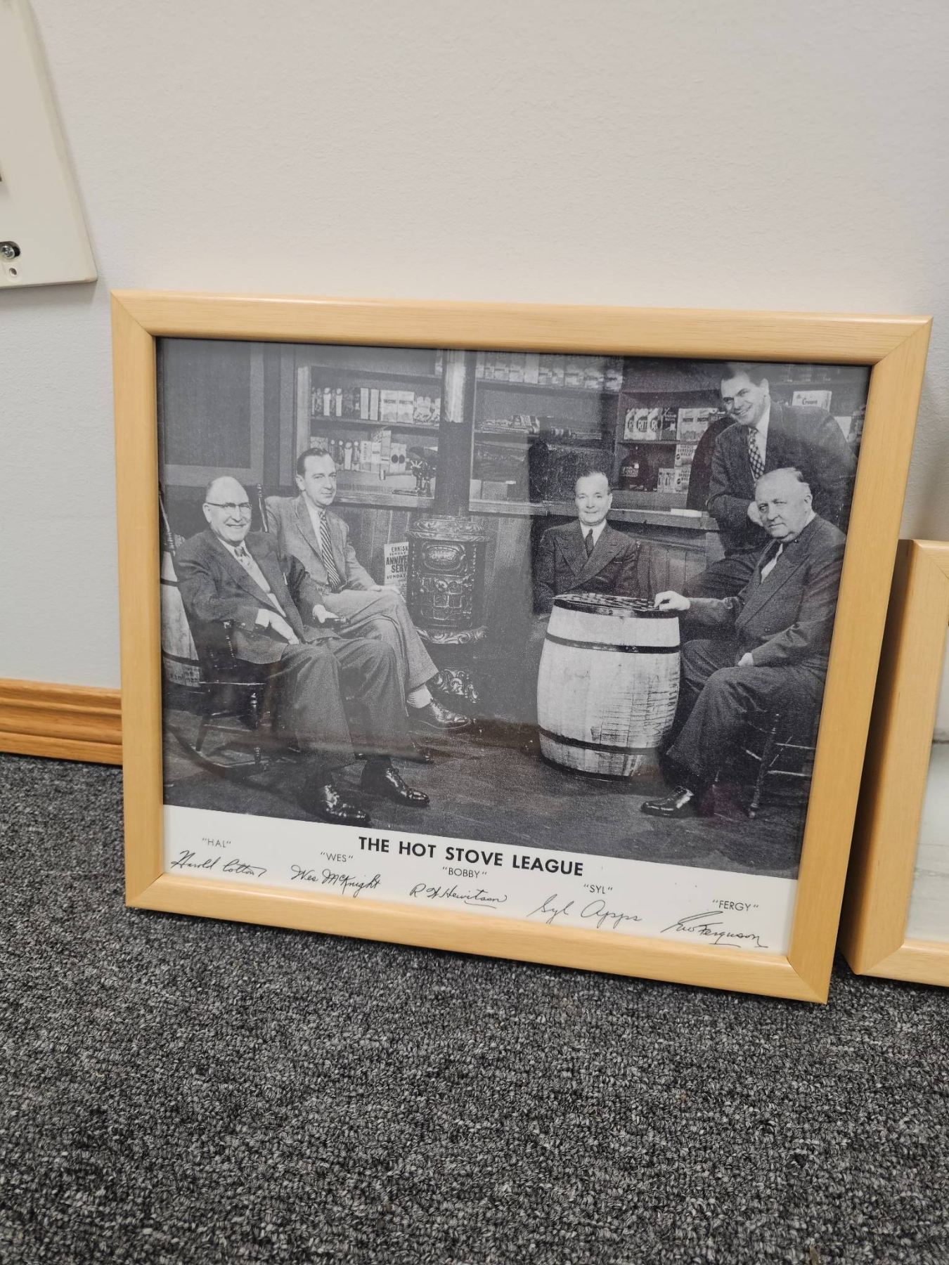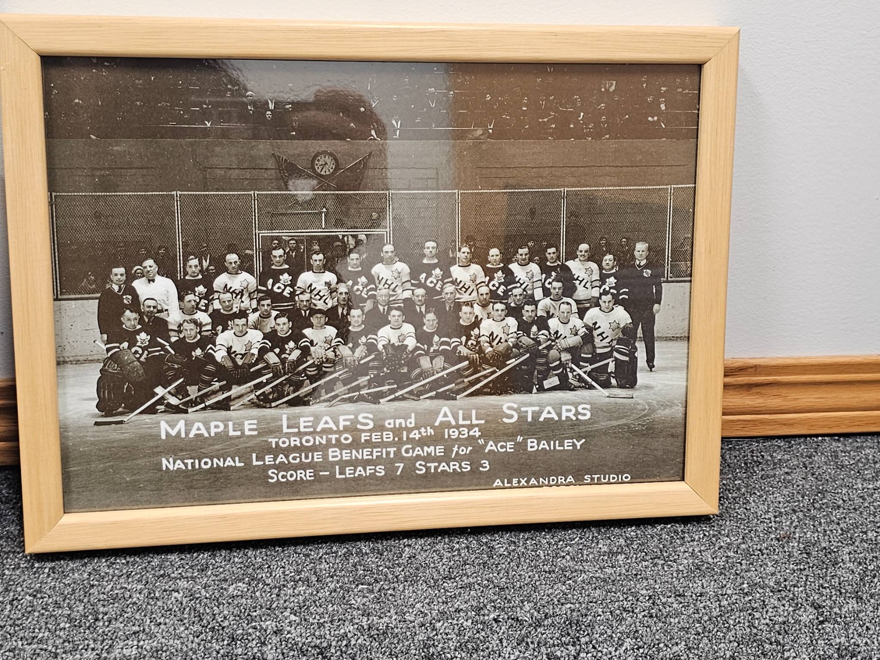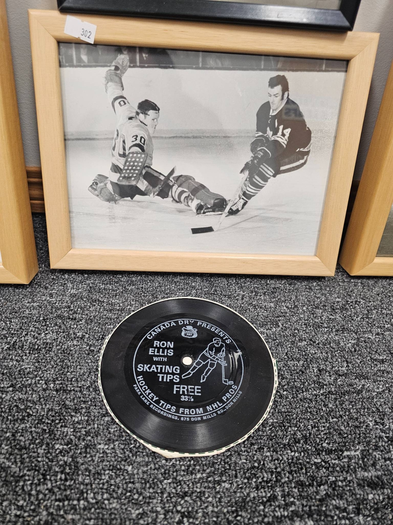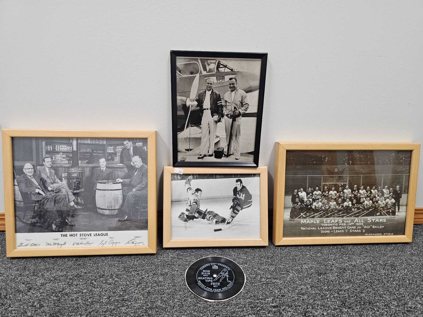 4 framed sports photographs and a hockey-related vinyl record. Images include hockey game action shots, a "Maple Leafs and All Stars" 1934 team photograph, "The Hot Stove League" photograph, and a vintage aviation-themed sports photo. The vinyl record adds a unique touch, offering skating tips from Ron Ellis. Frames are simple wood or black. A perfect set for hockey history enthusiasts or collectors of sports memorabilia.