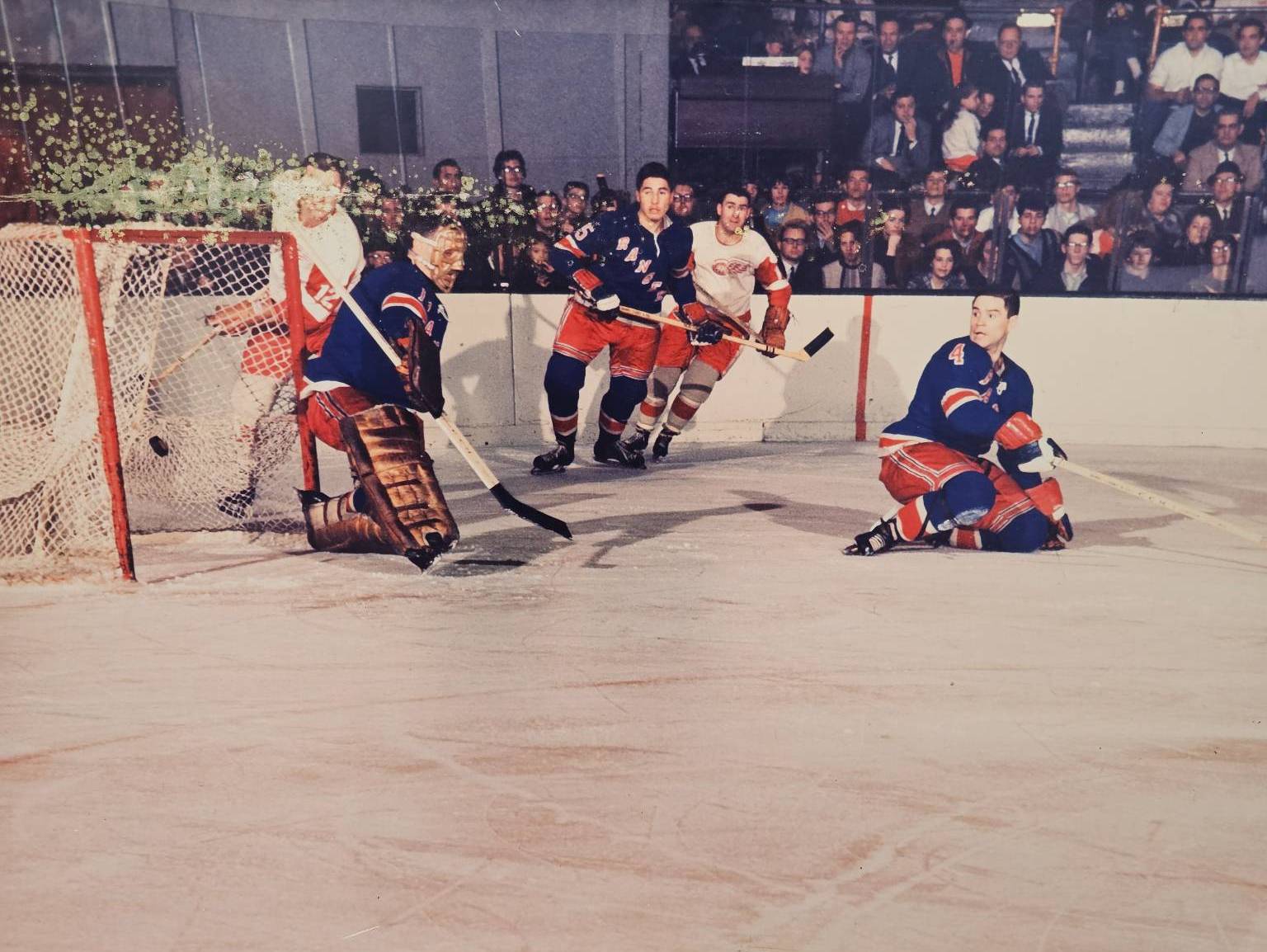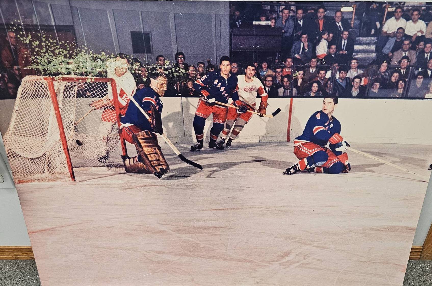 Large 40"x 30" canvas print depicting an intense hockey game scene. Featuring vibrant colors and dynamic action, this piece captures a classic moment on the ice. Perfect for hockey enthusiasts and sports art collectors. Ready to be displayed in a game room, office, or sports-themed space.