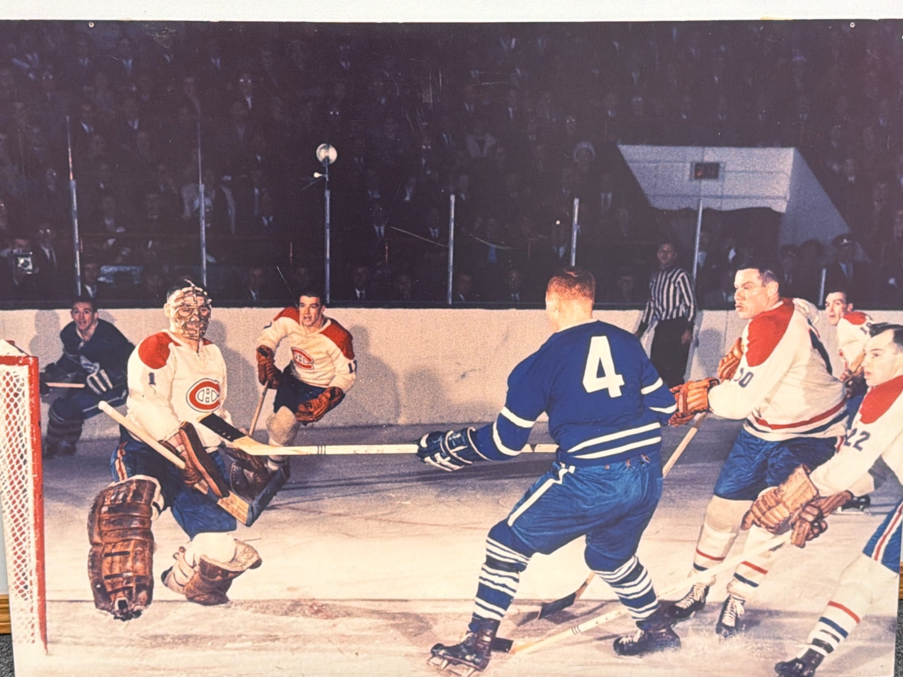 Large 40"x 30" artwork depicting an intense hockey moment featuring the Montreal Canadiens in action. Perfect for sports enthusiasts or collectors of hockey memorabilia. Includes vibrant colors and dynamic composition that capture historical NHL gameplay. Ideal as a showcase piece for a game room or office.