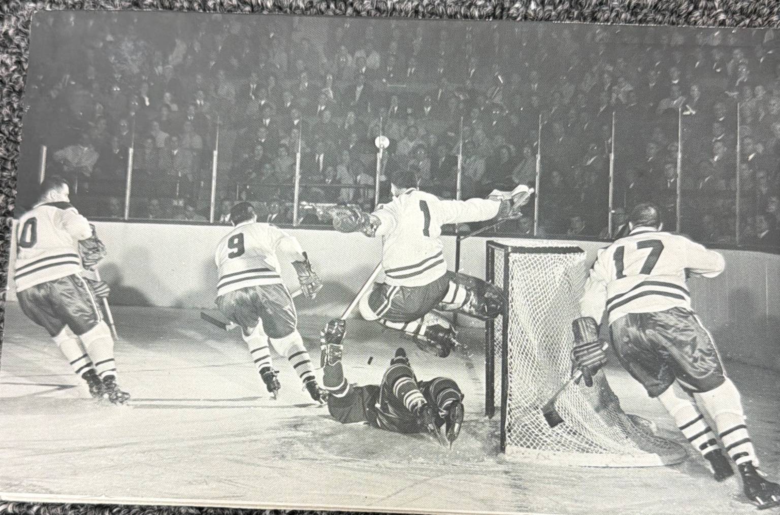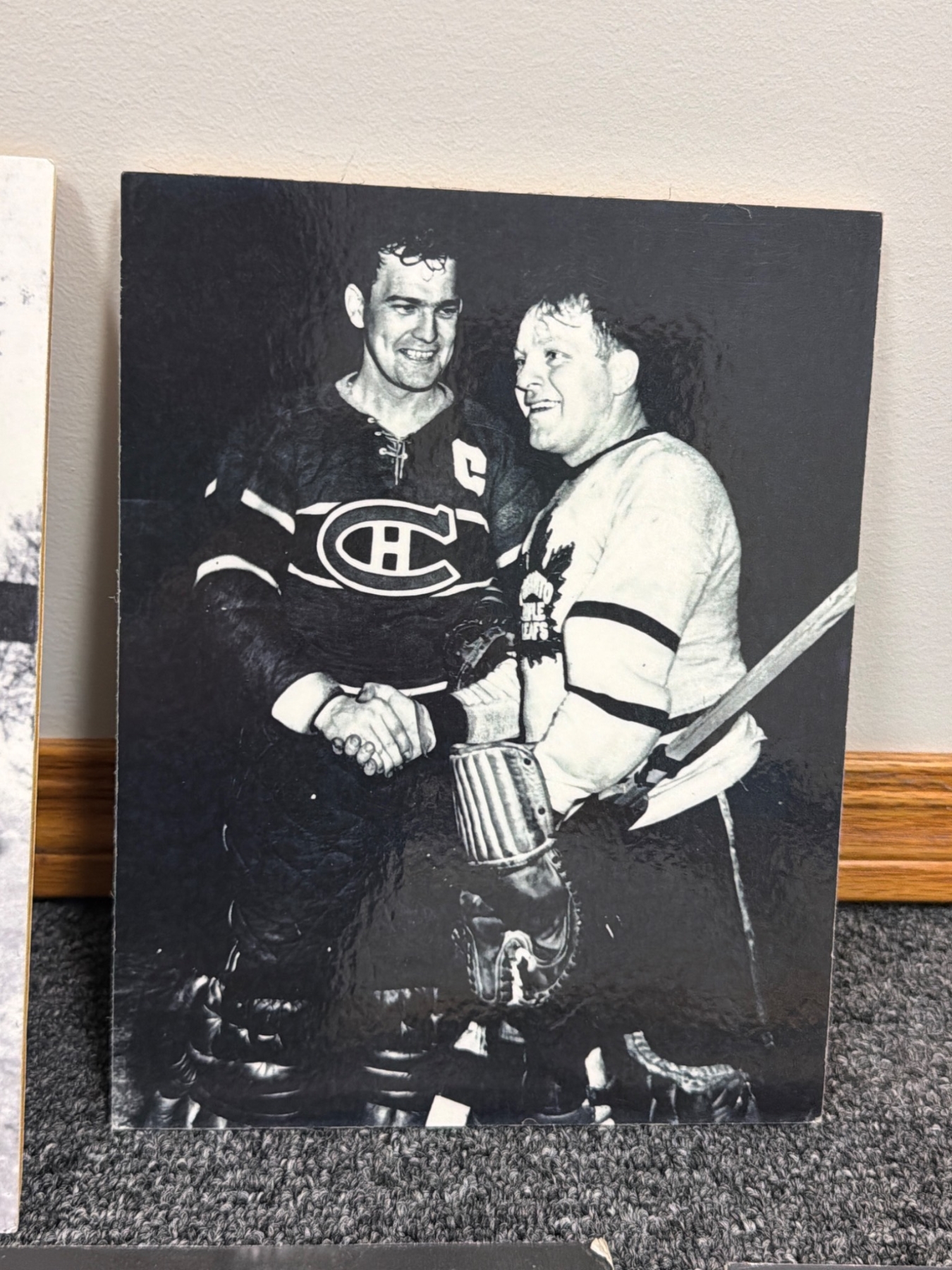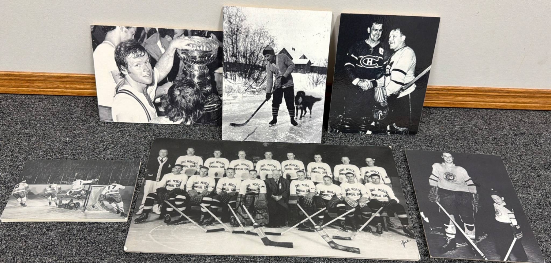 Seven black-and-white photographs featuring iconic hockey moments, team portraits, and individual player highlights on what appear to be mounted boards. Includes legendary players such as Jacques Plante and Rocket Richard, as noted. Perfect for hockey fans, collectors, or those interested in sports memorabilia with rich history.