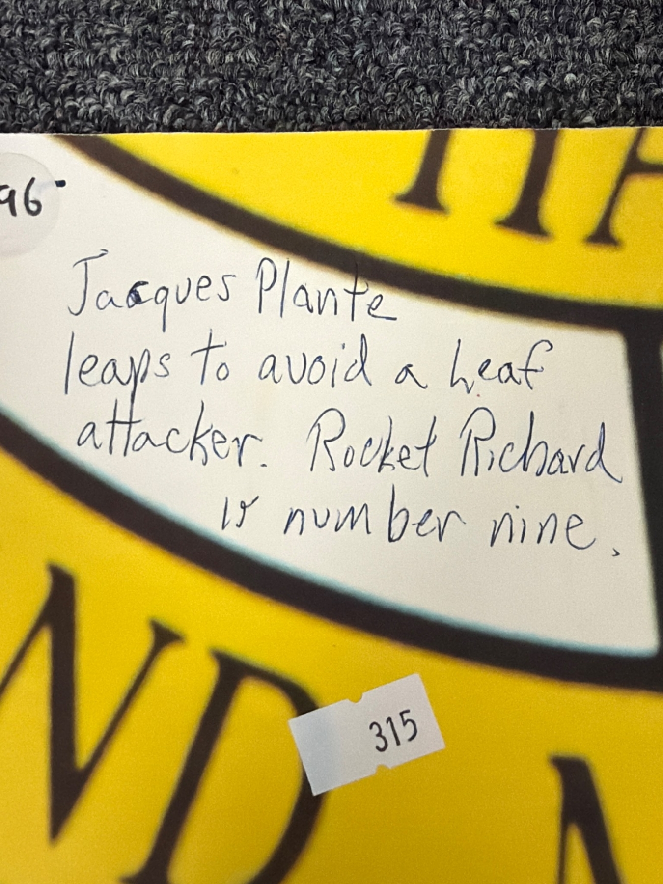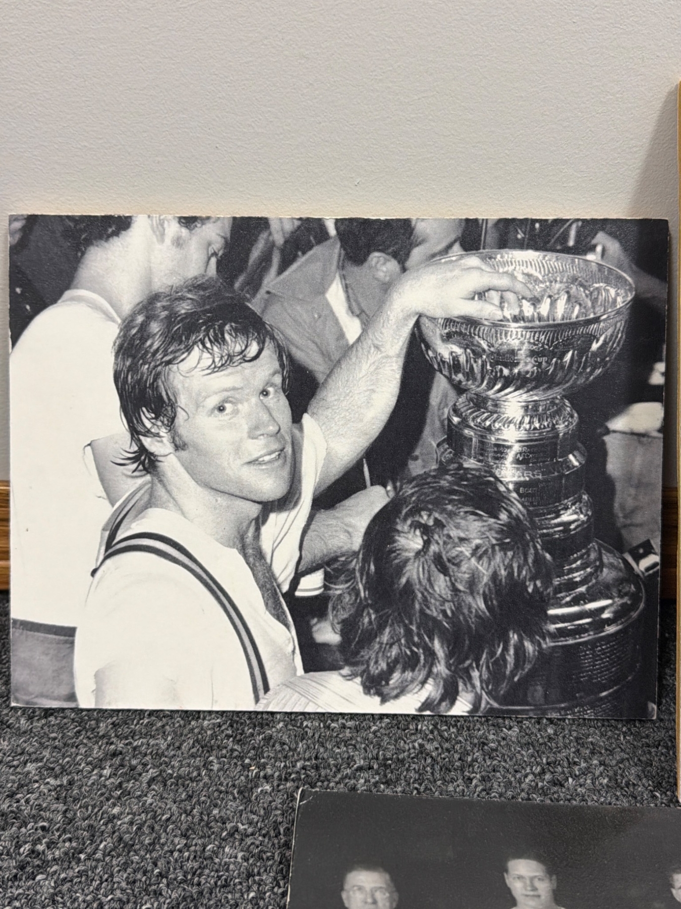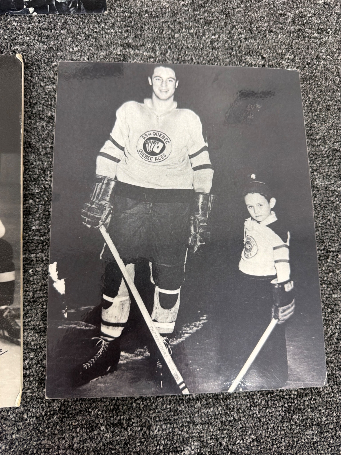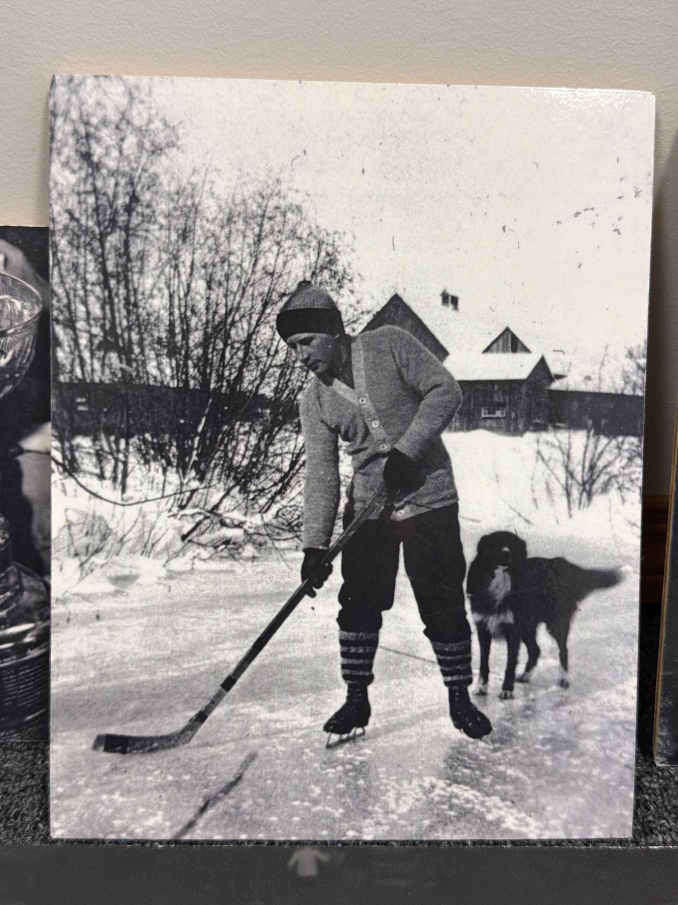 Seven black-and-white photographs featuring iconic hockey moments, team portraits, and individual player highlights on what appear to be mounted boards. Includes legendary players such as Jacques Plante and Rocket Richard, as noted. Perfect for hockey fans, collectors, or those interested in sports memorabilia with rich history.