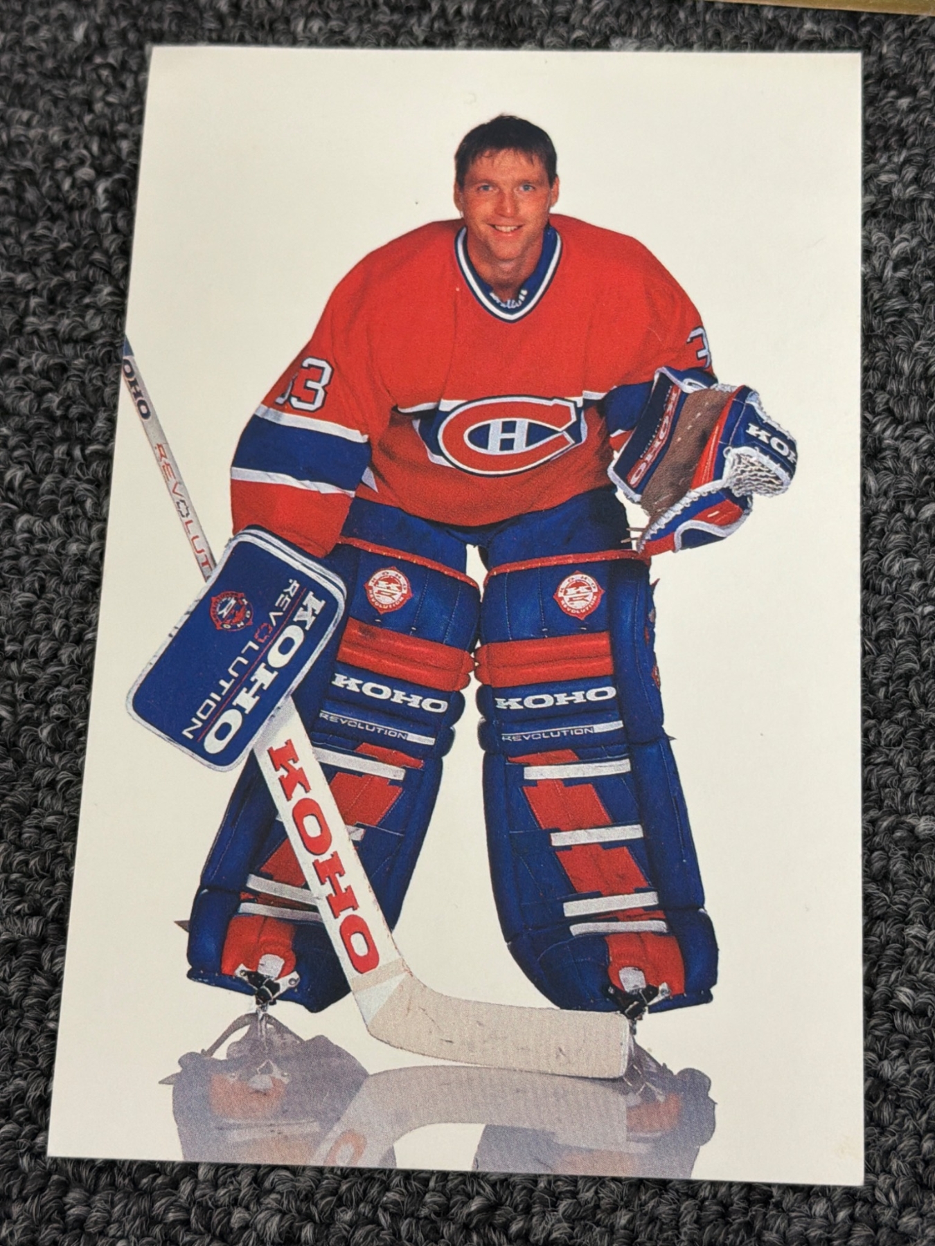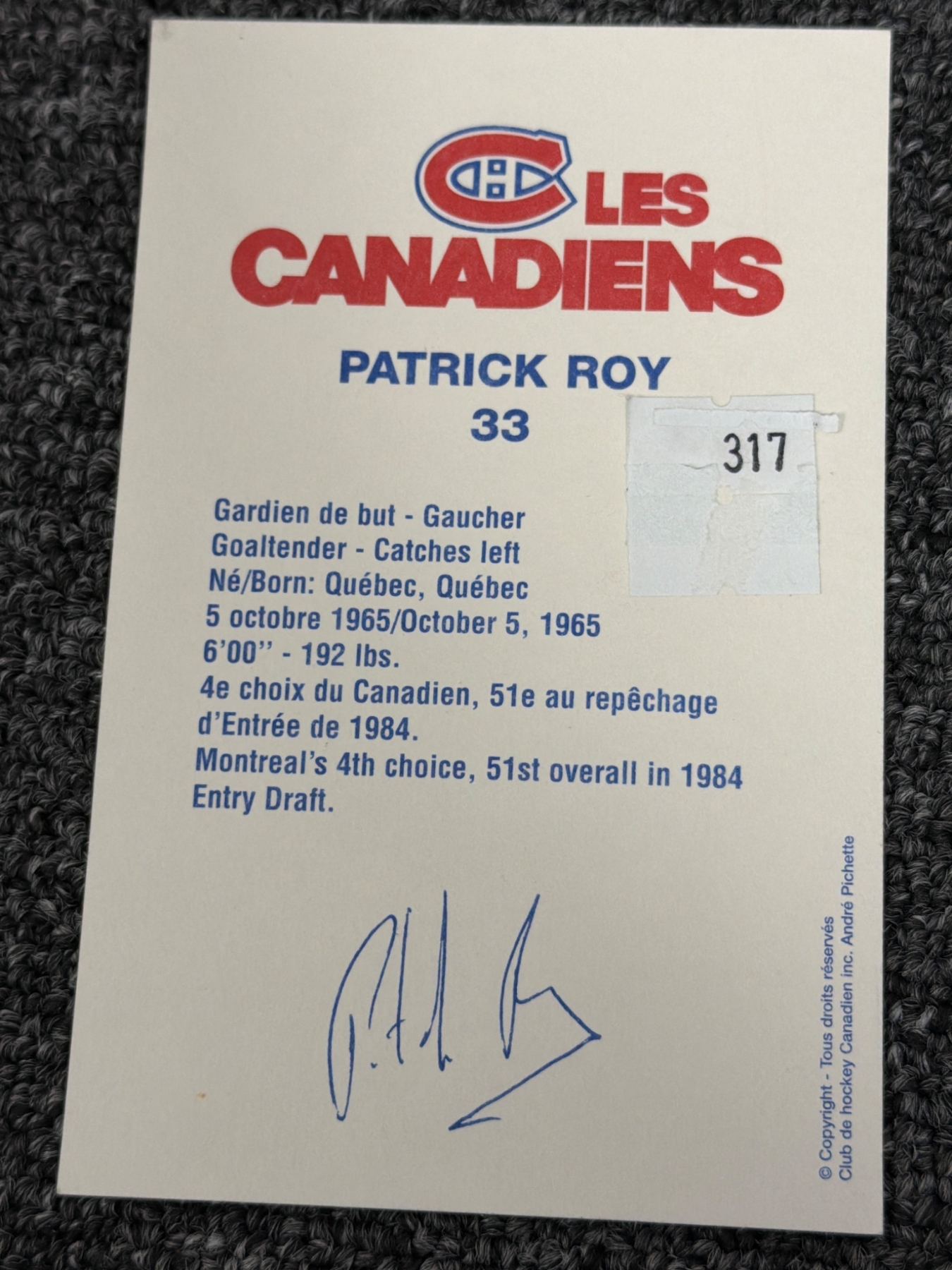 A unique collection of photographs and memorabilia celebrating the history of the Montreal Canadiens. Items include official team photos, portraits of legendary players like Patrick Roy, rare vintage images, and historical highlights such as Joe Hall and 'Rocket' Richard. Some include handwritten notations and original packaging. Ideal for Canadiens enthusiasts or hockey history collectors.